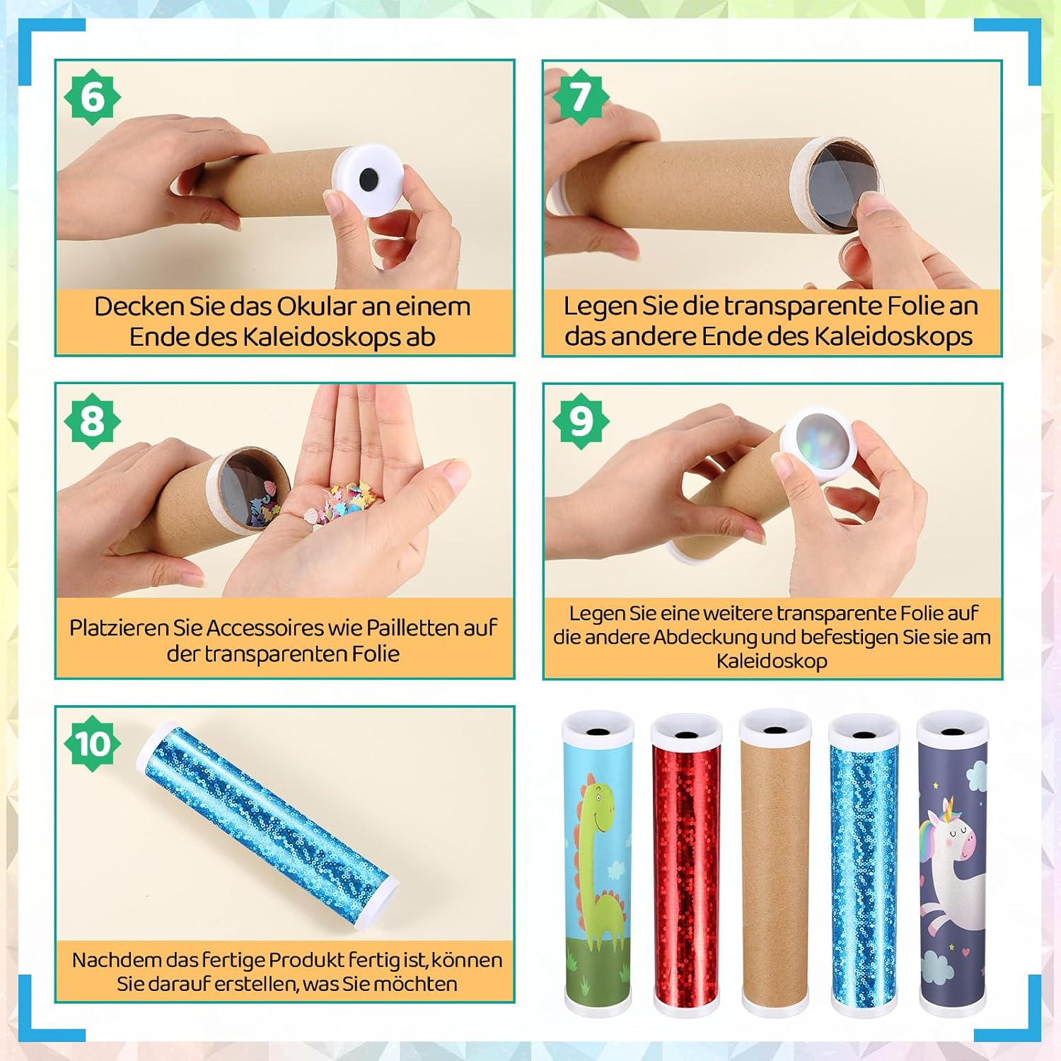 Riceverai: 12 set di bellissimi materiali artigianali per caleidoscopio; 4 set di 12 strisce di vernice acrilica da 3 ml; 12 set di pennelli, ogni set contiene 1 pennello piatto per pittura acrilica e 1 pennello appuntito; 1 rotolo di nastro adesivo Abbinamento: questo set caleidoscopio offre ai bambini l'opportunità di dare libero sfogo alla loro immaginazione. Con abbastanza pennelli e colori, puoi dipingere a tuo piacimento; Se non vuoi dipingere, ti offriamo anche carta glitter autoadesiva con un colore casuale, che aggiunge divertimento e sorpresa al tuo lavoro Facile da usare: questo caleidoscopio fai-da-te è facile da montare; L'obiettivo è composto da 3 lenti collegate insieme e può essere completato rapidamente. Durante la realizzazione, puoi avvolgere un cerchio di nastro adesivo attorno a entrambe le estremità del caleidoscopio, quindi dipingerlo e infine coprire il coperchio. Il nastro adesivo può prevenire efficacemente la caduta del coperchio, offrendo ai bambini un'esperienza migliore Misura adatta: il caleidoscopio misura 19 x 4 x 4 cm, molto adatto per l'uso manuale. Questa dimensione non è né troppo grande e ingombrante né troppo piccola e non facile da usare, quindi puoi goderti facilmente gli effetti visivi colorati. Non importa che tu sia un bambino o un adulto, puoi usare facilmente questo caleidoscopio MULTIUSO: i mestieri del caleidoscopio possono essere esplorati insieme durante le lezioni scolastiche, possono anche essere utilizzati nelle feste per bambini con i bambini per sperimentare il divertimento dei mestieri, sviluppare le loro abilità pratiche e creatività; Può essere utilizzato anche come regalo per i compleanni dei bambini