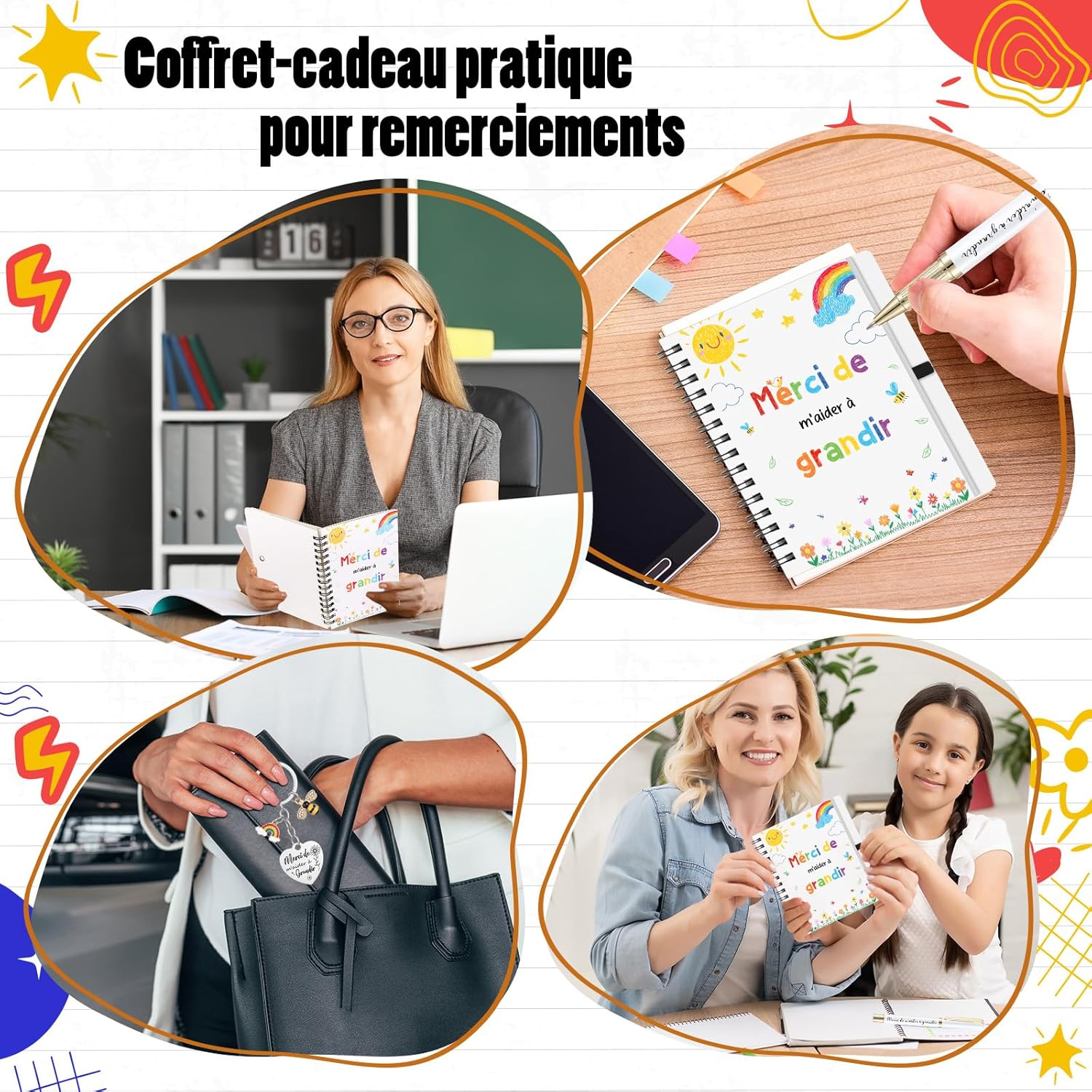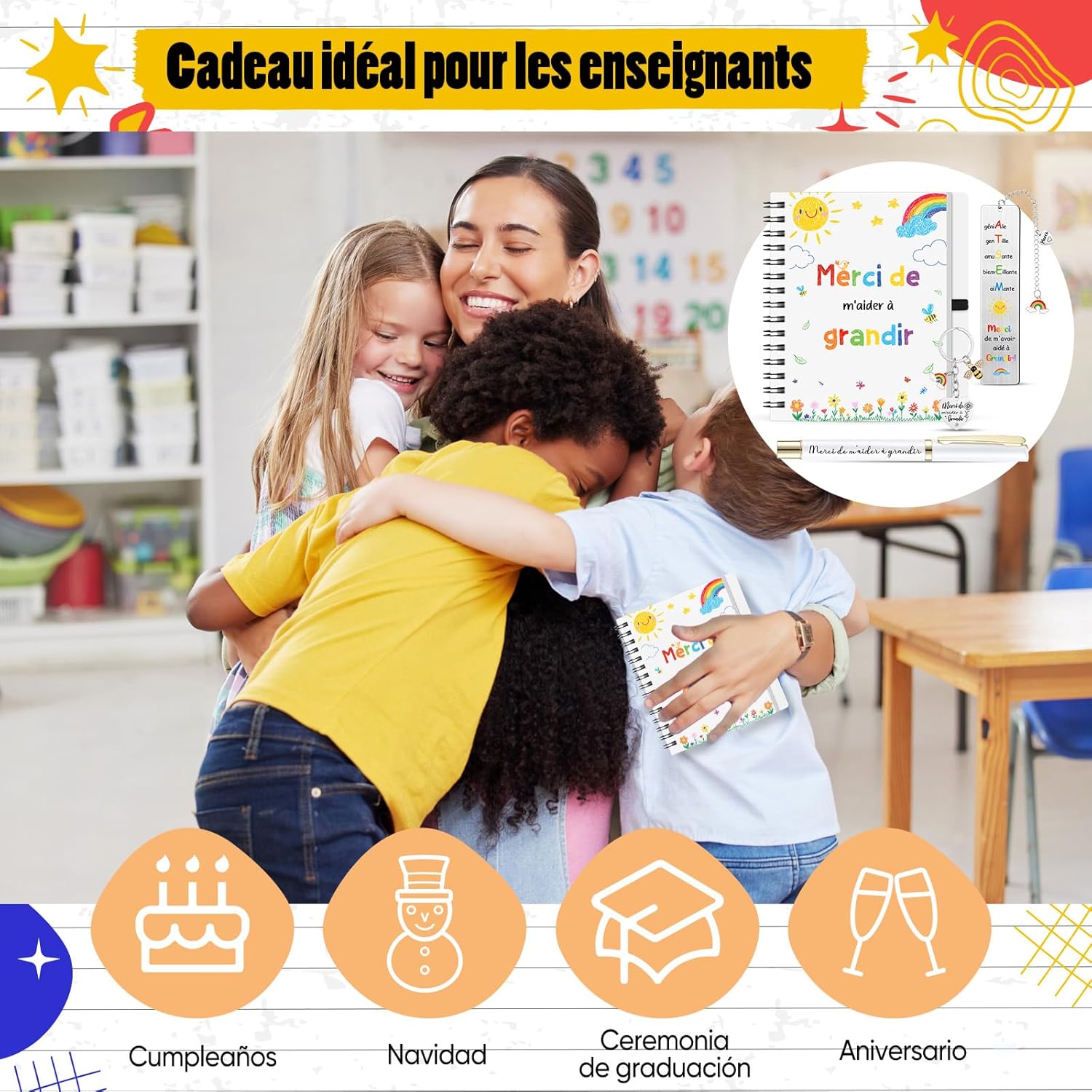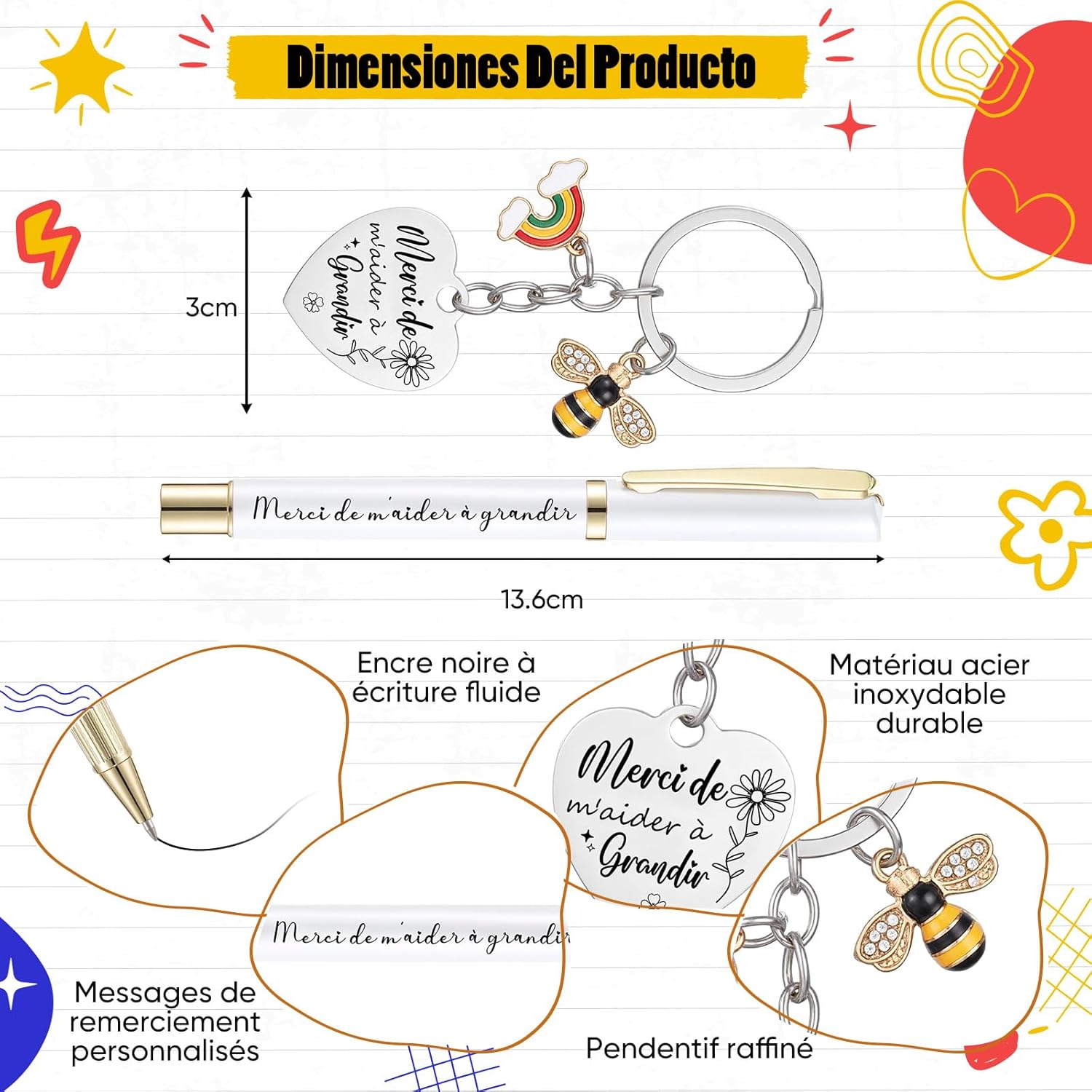 Set di ringraziamento per gli insegnanti: questo regalo ATSEM include 1 quaderno a spirale A6 con copertina infantile, 1 portachiavi con ciondolo arcobaleno e ape, 1 segnalibro colorato in acciaio inossidabile e 1 penna gel bianca. Pensata per gli insegnanti ATSEM, questa scatola coniuga perfettamente funzionalità e valore emozionale. Dai materiali accuratamente selezionati ai dettagli di design, ogni articolo esprime rispetto e gratitudine agli insegnanti ATSEM Pratico e premuroso: questo regalo per gli insegnanti è pieno di gratitudine. Ogni articolo integra le nozioni di gratitudine e sviluppo personale. Il quaderno a spirale, il portachiavi e la penna sono decorati con la citazione "Grazie per avermi aiutato a crescere" e il segnalibro recita "fantastica, divertente, amorevole gentilezza". Grazie per avermi aiutato a crescere! » Il bellissimo ciondolo a forma di ape sul portachiavi simboleggia la dedizione degli insegnanti ai loro studenti. Dimensioni comode: la dimensione del quaderno a spirale è 10 x 14 cm, facile da trasportare, grande quanto un palmo e può essere facilmente riposta in una borsetta o in una valigetta; il diametro del portachiavi è di 3 cm, molto adatto come decorazione per portafoglio o cellulare; la dimensione del segnalibro è 13 x 2,6 cm; la dimensione della penna ATSEM è di 13,6 cm, il corpo della penna è leggero e non ti sentirai stanco dopo aver scritto per molto tempo. Materiali ecocompatibili di alta qualità: questo set regalo ATSEM è un doppio impegno per la qualità e l'attenzione ai dettagli. Il blocco note è realizzato in carta di alta qualità, durevole, ecologica e strutturata, con buona resistenza all'inchiostro. I segnalibri e i portachiavi colorati sono realizzati in acciaio inossidabile, con incisioni chiare e resistenti. La penna gel è comoda da tenere in mano, leggera e l'inchiostro scorre perfettamente senza sbavature. Ampia applicazione: ogni piccolo regalo per l'insegnante si inserisce facilmente in una borsa o in una valigia, rendendolo un compagno ideale per registrare e leggere sempre e ovunque. Possono svolgere un ruolo importante a scuola, in ufficio, in riunioni di lavoro e in altre occasioni. Per il giorno dell'insegnante, la laurea, il Ringraziamento, il compleanno, Natale, Capodanno e altre festività, questo set è un regalo ideale