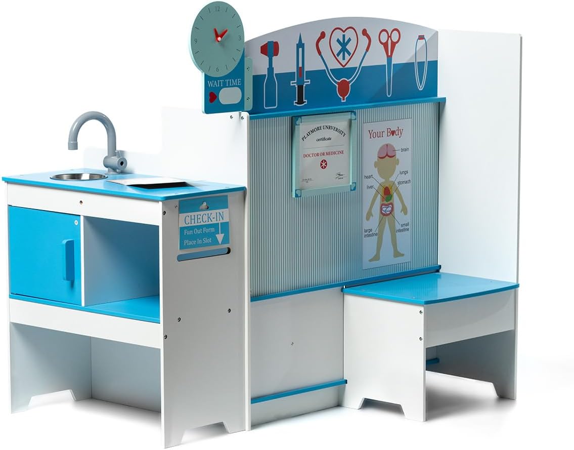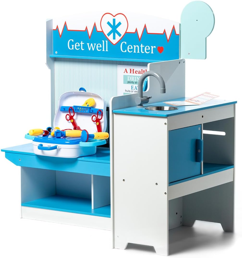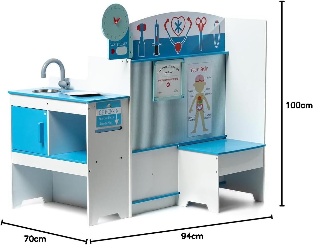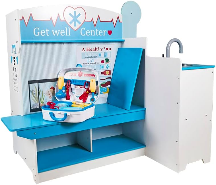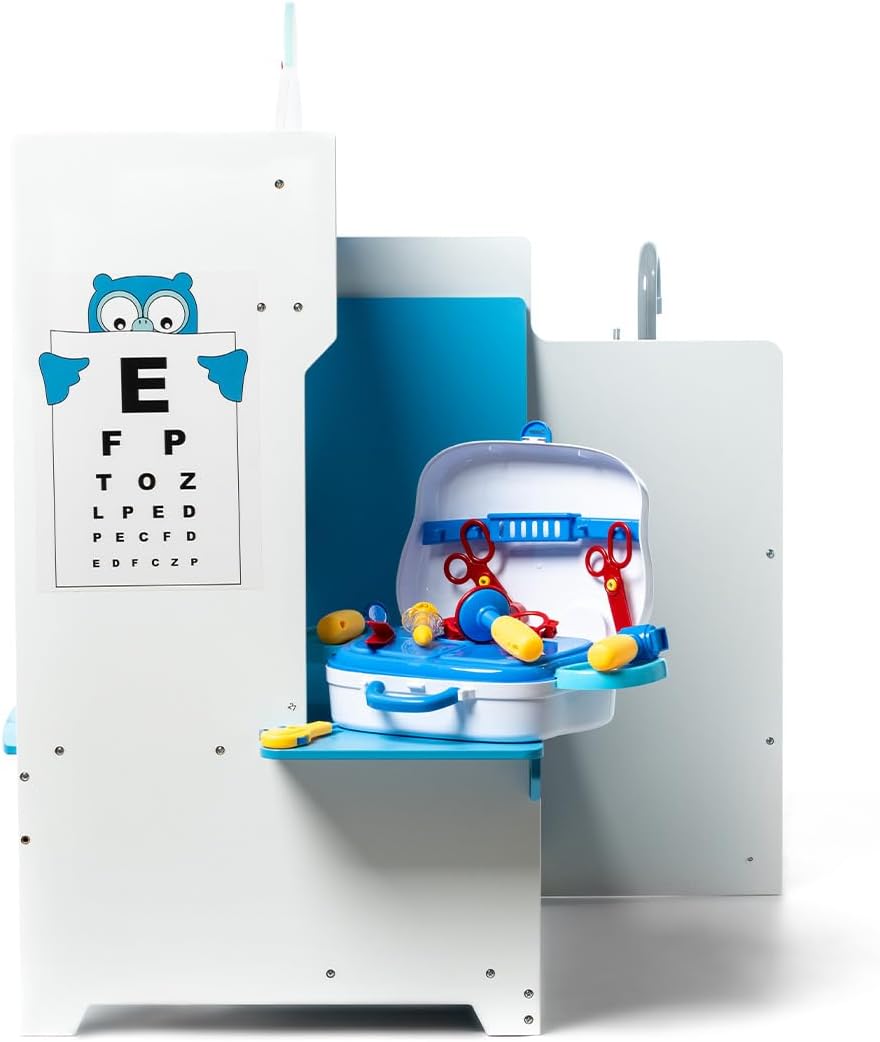 Centro medico in legno per bambini realizzato in truciolato di alta qualità per un giocattolo divertente, solido e bello. Lo studio medico Siper è un giocattolo di imitazione per giocare a fare il medico e il paziente e si può godere di uno studio medico completo con 3 ambienti diversi. Il centro medico Siperm è un giocattolo medico 3 in 1 con tutte le fasi di una visita medica, l'area di attesa, l'area di auscultazione e l'area del medico con lavandino, cassetti e accessori. Oltre a essere giocoso, questo meraviglioso centro medico per bambini ha tutto ciò che serve per giocare come un dottore grazie alla sua valigetta medica completa di 11 accessori. Il centro medico Siper è un giocattolo in legno Montessori, che incoraggia il gioco simbolico, l'immaginazione e aiuta i bambini a familiarizzare con le visite dal medico.