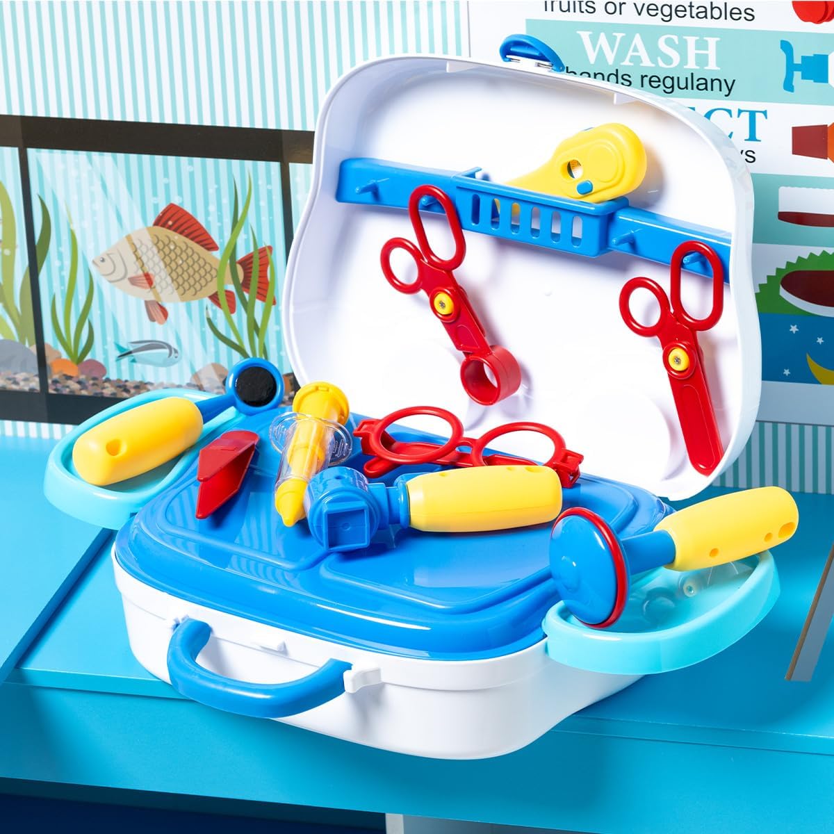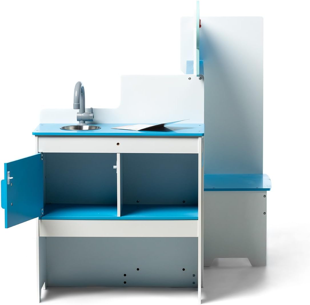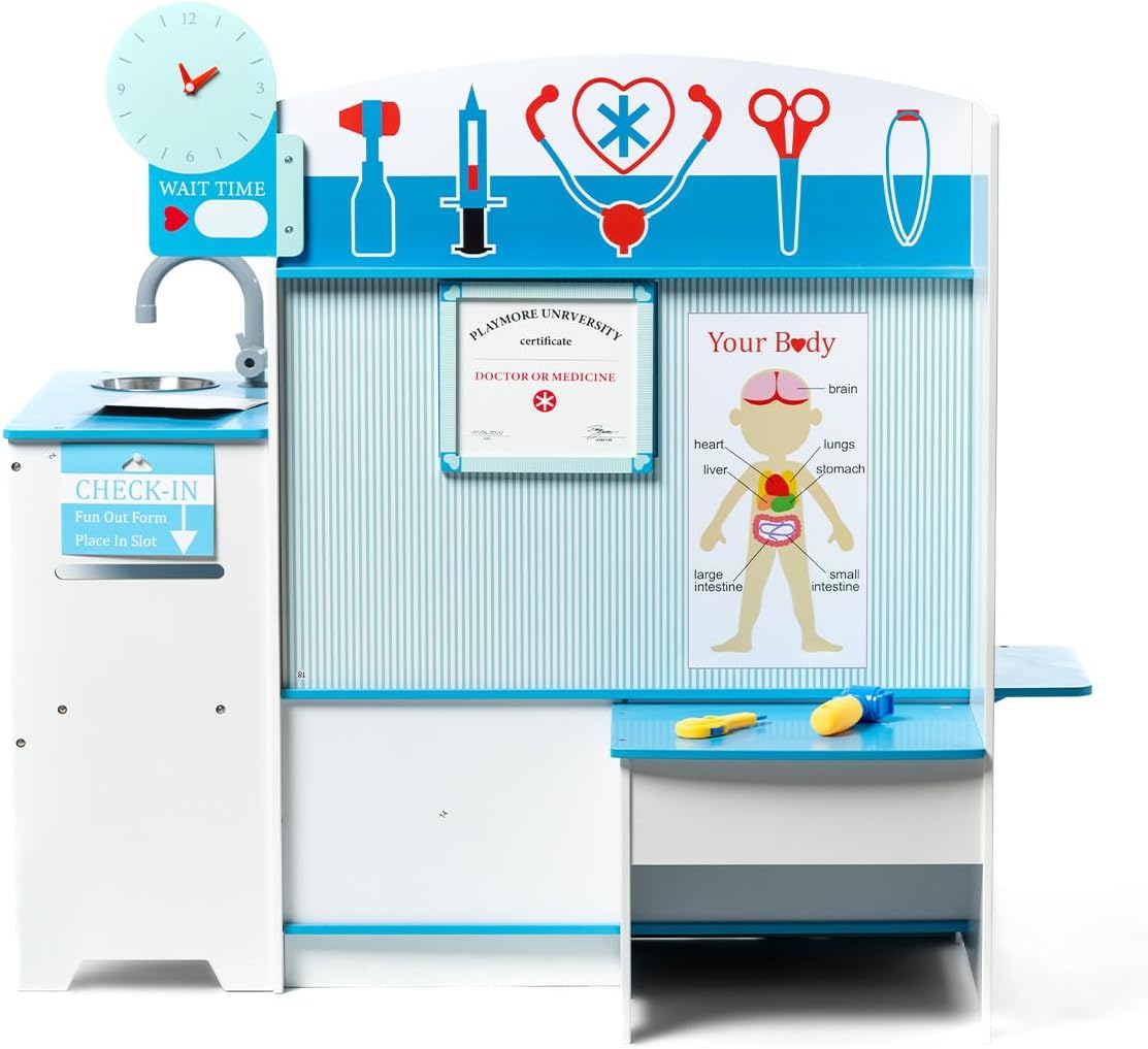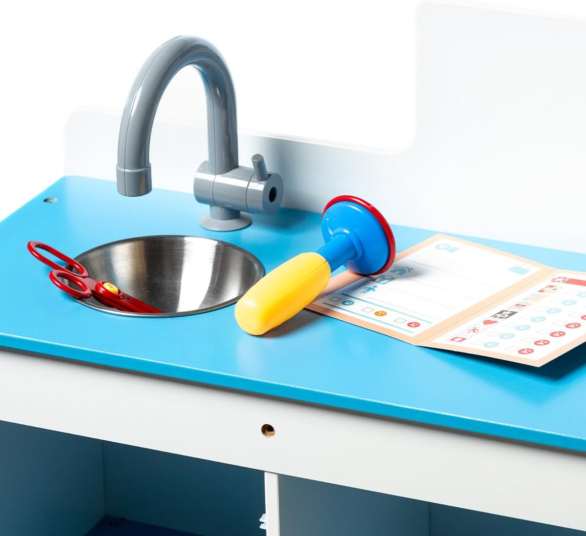 Centro medico in legno per bambini realizzato in truciolato di alta qualità per un giocattolo divertente, solido e bello. Lo studio medico Siper è un giocattolo di imitazione per giocare a fare il medico e il paziente e si può godere di uno studio medico completo con 3 ambienti diversi. Il centro medico Siperm è un giocattolo medico 3 in 1 con tutte le fasi di una visita medica, l'area di attesa, l'area di auscultazione e l'area del medico con lavandino, cassetti e accessori. Oltre a essere giocoso, questo meraviglioso centro medico per bambini ha tutto ciò che serve per giocare come un dottore grazie alla sua valigetta medica completa di 11 accessori. Il centro medico Siper è un giocattolo in legno Montessori, che incoraggia il gioco simbolico, l'immaginazione e aiuta i bambini a familiarizzare con le visite dal medico.