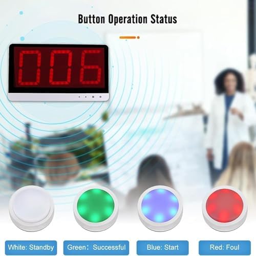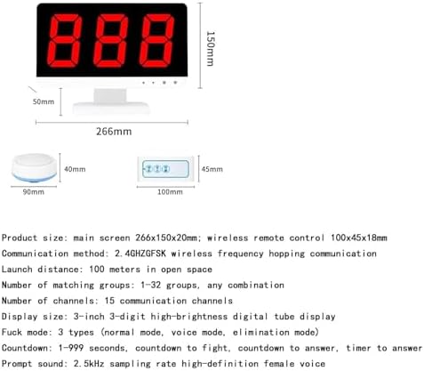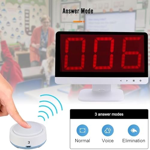 Sperimenta una configurazione senza problemi senza grovigli di cavi, consentendo una facile sospensione o posizionamento sul tavolo del monitor per un uso conveniente. Goditi un audio nitido durante le trasmissioni con l'affidabile tecnologia wireless 2.4G e una distanza di trasmissione fino a 100 metri. Migliora il gioco con quattro vivaci stati di colore per una chiara visibilità dei risultati, garantendo un'esperienza equa e coinvolgente. Scegli tra tre modalità di risposta: Normale, Voce ed Eliminazione, con funzionalità come notifiche vocali e promemoria per il conto alla rovescia per il fair play. Risparmia energia con una funzione di spegnimento automatico che prolunga la durata della batteria e beneficia della struttura in materiale ABS resistente per una maggiore durata.