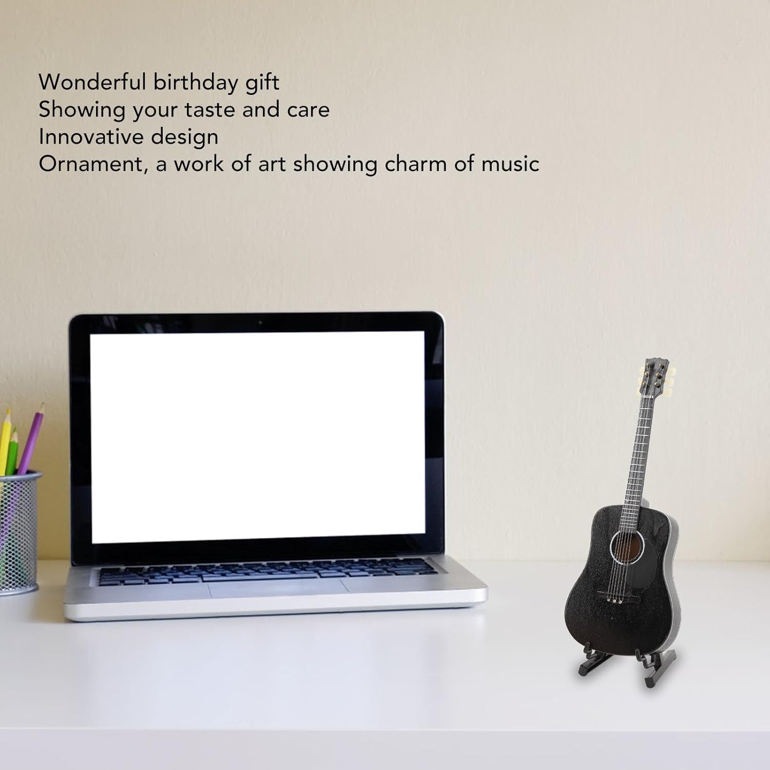 [BELLA DECORAZIONE]: migliora l'arredamento della tua casa con questo elegante modello di chitarra classica nera. [ADATTO AI BAMBINI]: per le camerette dei bambini, questo mini ornamento è divertente e affascinante. [DESIGN SQUISITO]: la pregevole fattura e l'attenzione ai dettagli rendono questa mini chitarra un pezzo eccezionale. [GRANDE]: mostra la tua cura e il tuo gusto regalando questa mini chitarra a bambini, amici o appassionati di musica. [ORNAMENTO ARTISTICO]: questo mini strumento musicale funge anche da bellissima opera d'arte, aggiungendo fascino a qualsiasi spazio.