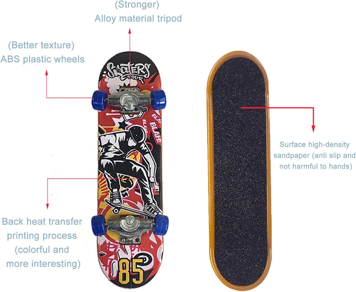 Divertimento puzzle: i giocattoli educativi svolgono un ruolo importante nella crescita dei bambini e i nostri skateboard con le dita possono sviluppare bambini e abilità pratiche. Superficie di attrito: la carta anti-vetrata utilizzata nei nostri skateboard da dito aumenta l'attrito e ti dà una presa migliore sullo skateboard per un migliore controllo. Materiale anti-deformazione: realizzati con robusti pannelli in ABS, i nostri skateboard da dito offrono prestazioni senza pari e durata duratura, fornendo compagnia continua per la crescita dei bambini. FACILE DA USARE: sperimenta un funzionamento semplice con le ruote lisce e i cuscinetti degli skateboard da dito che scivolano facilmente su qualsiasi superficie. La sua funzionalità altamente strutturata ti offre il massimo controllo. Ottimo regalo: che si tratti di Natale, Festa dei bambini o Ringraziamento, il nostro skateboard da dito è un'ottima opzione regalo per bambini, amici e pattini.
