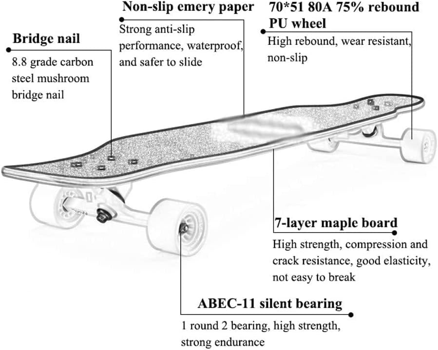 3. Quattro ruote in PU ultra-lisce e antiusura con cuscinetti di precisione ABEC-11 per un funzionamento molto fluido. Le staffe in alluminio di alta qualità supportano un peso maggiore e velocità più elevate, fornendo una presa costante e potente durante il pattinaggio di ragazzi e ragazze o adulti, rendendo la guida più sicura. 4. Assemblaggio completo con kit di riparazione All'apertura della confezione appariranno uno strumento completo di regolazione scorrevole e multifunzione e 2 cuscinetti. Quindi goditi lo skateboard senza dover assemblare, questo skateboard longboard è il regalo perfetto per ragazzi e ragazze. 5. Garantire la soddisfazione del cliente. Se hai domande su questo skateboard o non sei soddisfatto dei nostri prodotti, non esitare a contattarci e ti forniremo prima la soluzione migliore. Non devo nemmeno ordinare! Possiamo fornirti qualsiasi altra assistenza. 2. Il ponte in acero a 7 strati ad alta densità è robusto e durevole, con un perfetto equilibrio tra robustezza e peso. Ha una superficie antiscivolo in corindone che fornisce una presa stabile e potente mentre si pattina con un carico massimo di 440 libbre. Adatto per sport estremi e sport all'aria aperta. 1. La superficie concava a grandezza naturale e super morbida da 43 "x 9,2" è perfetta per i principianti per eseguire l'allenamento di base e offre eccellenti prestazioni acrobatiche e un migliore controllo per lo skateboard. Questo skateboard è perfetto per principianti e professionisti con alcune acrobazie di base e altri trucchi.
