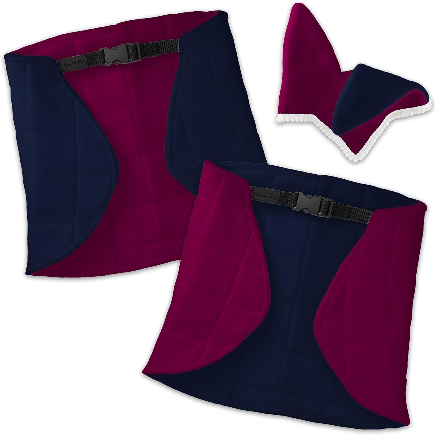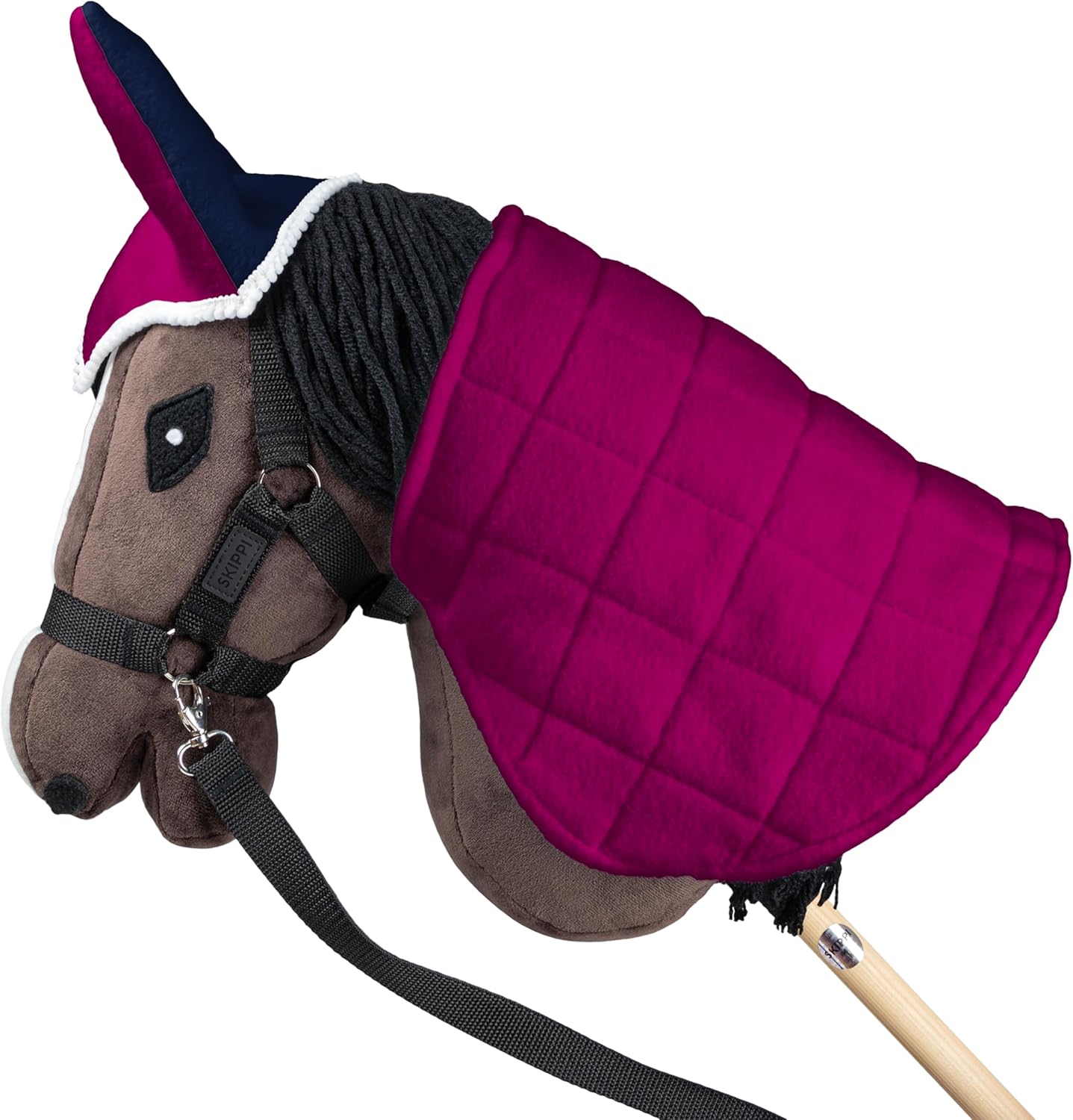 Coperta e cuffietta per hobby horse. Ogni lato della coperta ha un colore diverso (fucsia / blu navy), il che consente di cambiare l'aspetto del cavallo a seconda dell'umore o dell'occasione. Un accessorio elegante e carino, ma anche un elemento pratico dell'equipaggiamento dell'hobby horse. Permette di personalizzare l'aspetto del cavallo, aggiungendo un carattere unico. Produzione artigianale in Europa; ogni prodotto Skippi è realizzato a mano da artigiani esperti che curano ogni minimo dettaglio. Gli accessori per hobby horse sono un regalo che sicuramente porterà gioia e aggiungerà più magia ai giochi con l'hobby horse. Il set si adatta alla maggior parte dei cavalli a bastone nelle dimensioni A3 e A4. Dimensioni della coperta antimosche: 47 x 27 cm. Chiusura regolabile al collo. Cuffia: 17 x 15 cm. Materiale: pile (100% poliestere). Lavabile a 30 gradi.