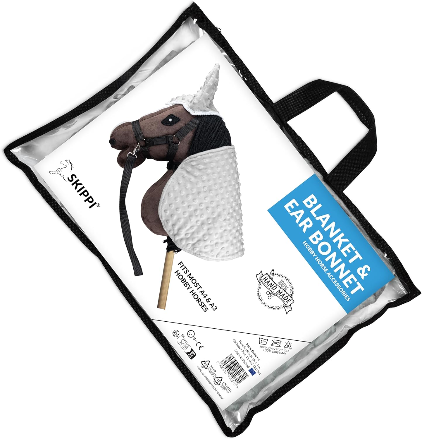 Cuffietta e coperta per hobby horse: Con questo set puoi personalizzare l'aspetto del tuo cavallo e dargli un carattere unico. Realizzato a mano nell'UE: Ogni prodotto Skippi è fatto a mano da artigiani esperti che prestano attenzione anche ai minimi dettagli. Coperta reversibile: Un lato della coperta è grigio, l'altro è bianco. Inoltre, sono realizzati con materiali diversi e hanno texture differenti. Accessori per Hobby Horses: Un regalo per un piccolo cavaliere che porterà sicuramente gioia e aggiungerà un tocco di magia ai giochi con il Hobby Horse. Per cavalli A3 o A4: Un accessorio elegante, carino e pratico per cavalli con bastone, adatto alla maggior parte dei cavalli nelle dimensioni A3 e A4. Dimensioni della coperta antimosche: 47 x 27 cm. Chiusura regolabile al collo. Cuffia: 17 x 15 cm. Materiale: pile (100% poliestere). Lavabile a 30 gradi.