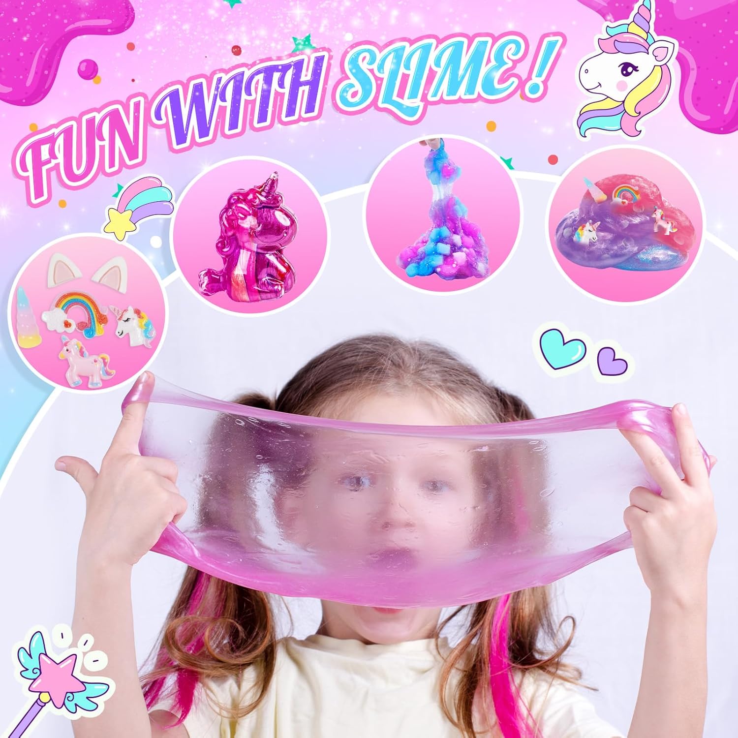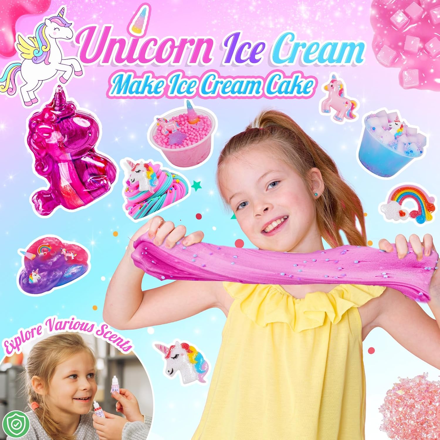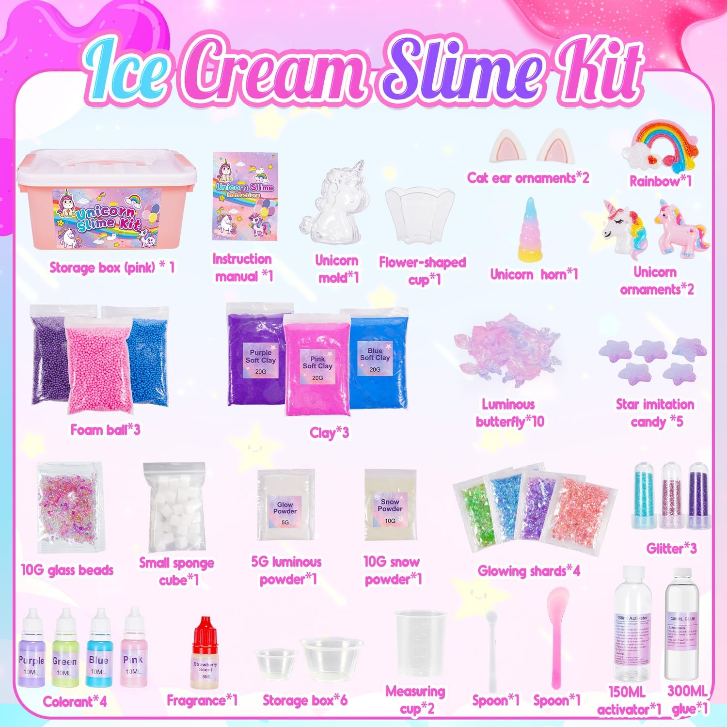【Unicorno Slime per bambini】--I bambini possono creare uno slime soffice di gelato unicorno mescolando diversi colori e materiali, quindi decorarlo con una varietà di piccoli accessori belli e carini. Il set di slime a tema unicorno può portare un divertimento fai da te illimitato ai bambini! 【Migliora la relazione genitore-figlio】-- Prepara il gelato allo slime con i tuoi bambini! Questo kit per lo slime è un'ottima scelta per far giocare insieme genitori e bambini. Questo giocattolo fai da te per lo slime può migliorare l'interazione e la comunicazione tra genitori e figli e migliorare la relazione genitore-figlio. 【Giocattoli di slime scintillanti】-- In base alle preferenze personali, aggiungi diversi colori di glitter (blu, viola, rosa), colorante (viola, blu, rosa, verde), diversi colori di frammenti luminosi, versa in un contenitore a forma di unicorno e crea un modello di unicorno di slime scintillante. Aggiungi semplicemente polvere luminosa allo slime e mettilo in un ambiente buio, lo slime emetterà luce verde. 【Sicuro, non tossico e riutilizzabile】-- Questo slime unicorno e gli accessori sono realizzati con materiali sicuri e non tossici, il set di slime ha superato la certificazione ASTM CE ed è completamente sicuro per bambini e adulti! Non mangiare! Quando lo slime soffice non è in uso, rimettilo nel contenitore (se lo slime diventa asciutto, aggiungi un po' di acqua calda) 【Regalo Bambina 6 7 8 9 10 11 12 Anni】--Stai ancora cercando regali per i tuoi bambini? Questo set di slime è perfetto come regalo per ragazze di 6 7 8 9 10 11 12 anni, puoi regalarlo ai tuoi bambini come regalo per Pasqua, Natale e Compleanno a tema unicorno. 【Kit di decompressione per lo slime】--I bambini possono impastare e allungare lo slime morbido, che è super decompressivo e rilassante! Prepara uno slime soffice al gelato con gli amici per promuovere l'interazione sociale tra i bambini e rendere l'artigianato un'esperienza piacevole. È un fantastico giocattolo regalo per le feste.