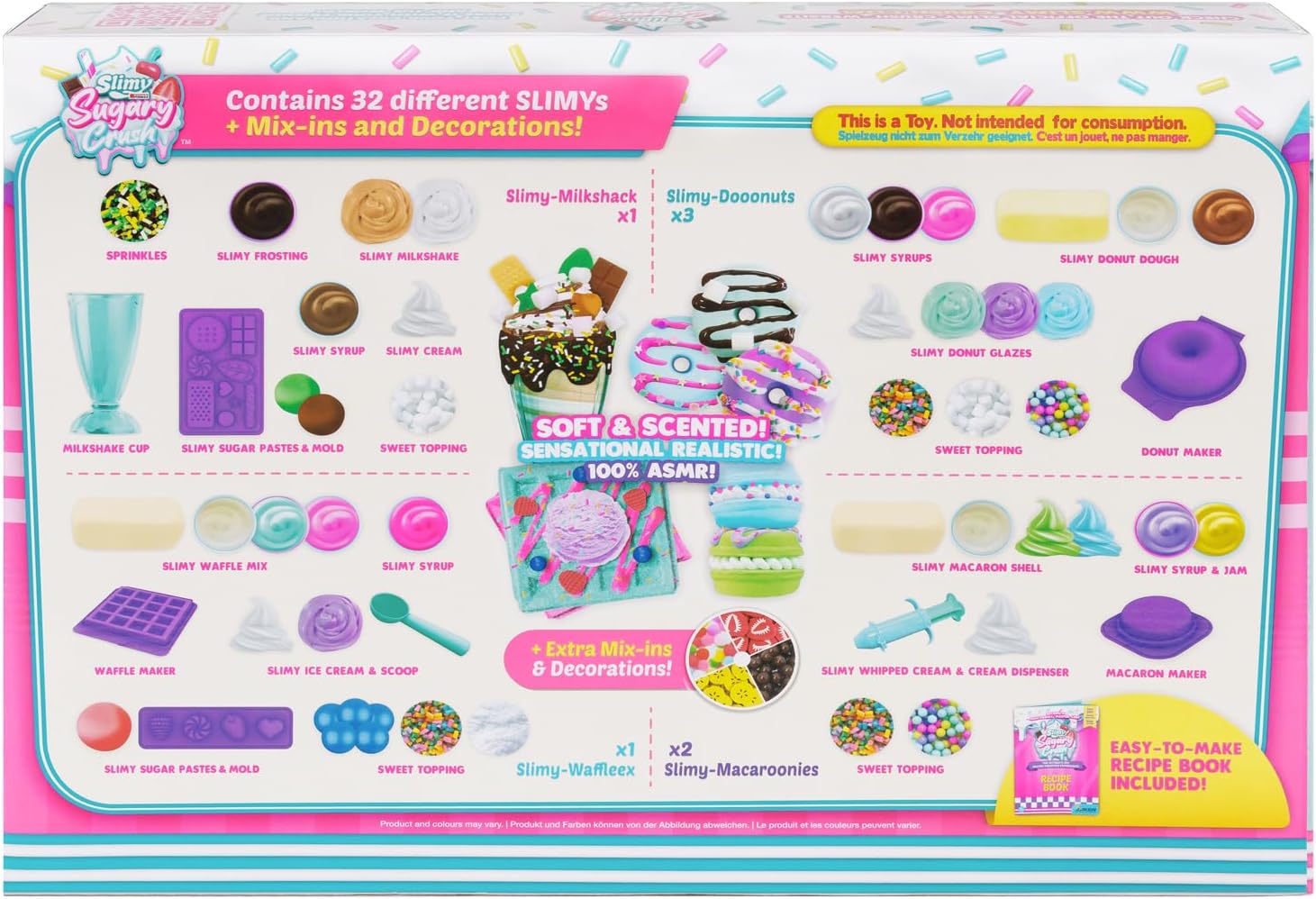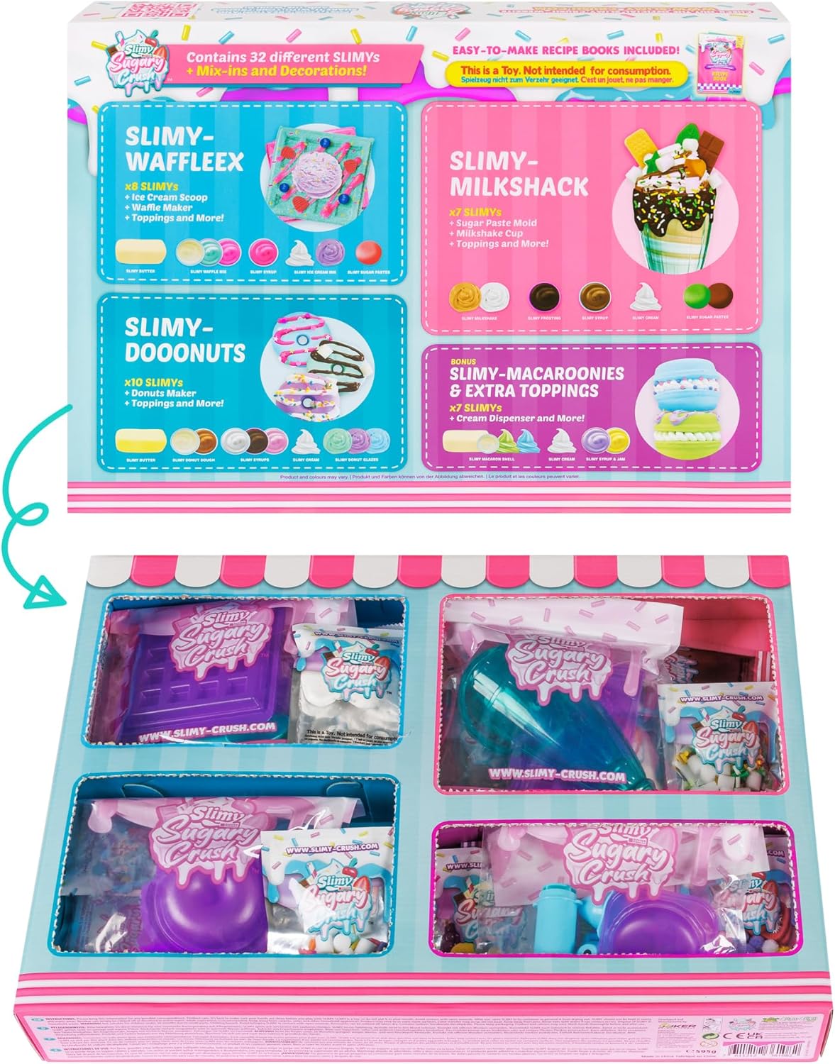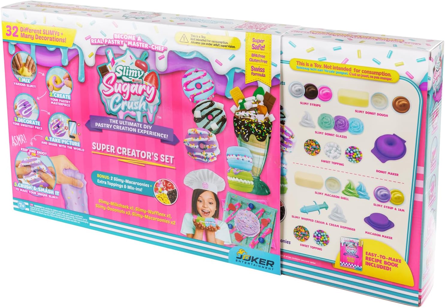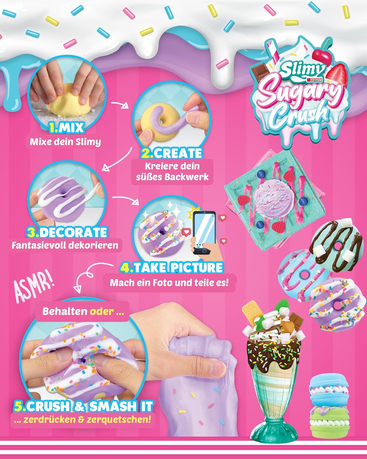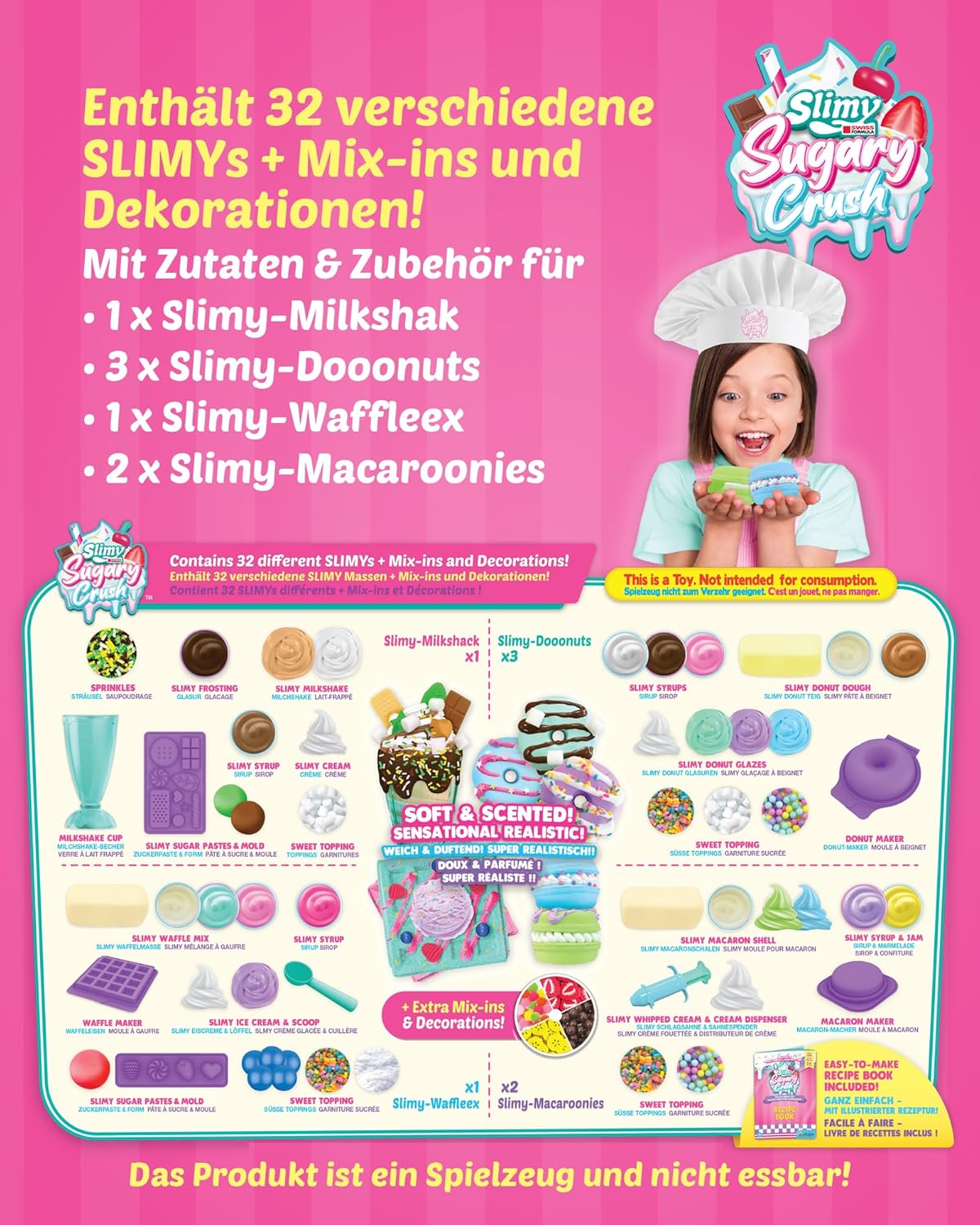 Nuovo: Slim Sugary Cruis! Il grande divertimento creativo SLIMY per mescolare, creare, decorare, fotografare e schiaffeggiare! La tendenza SLIMY sui social media! Gioca & mescola insieme diversi tipi di SLIMY! Include tutto ciò di cui hai bisogno, con una ricetta facile da seguire! REALISTICA: L'esperienza incredibilmente realistica di panetteria con il massimo valore di gioco! Diventa il capo maestro patissier! Mescola diversi ingredienti SLIMY e crea opere d'arte dall'aspetto delizioso! Decorare, aggiungere spruzzini e glitter o modellare le proprie decorazioni. Morbido e fragrante! VIRAL: scatta foto della tua opera d'arte da condividere con gli amici e sui social media! KEEP o CRUSH & SMASH IT! Conservare o smacchiare per la sensazione SLIMY più morbida e cremosa di sempre! Sensazionalmente realistico. Divertimento ASMR super irresistibile! Sicuro: dermatologicamente testato. Le masse da gioco originali SLIMY soddisfano i più severi standard internazionali di qualità e sicurezza Per garantire la massima tollerabilità cutanea, i prodotti originali SLIMY sono realizzati senza parabeni o altri conservanti aggressivi, senza glutine al 100% e dermatologicamente testati da istituti indipendenti. AUTORE: Educativamente prezioso! Attraverso la palpazione, impastare e tagliare la massa di gioco, si sviluppano abilità sensoriali e capacità motorie. Formare e far fluire la massa del gioco stimola l'immaginazione. La percezione, l'immaginazione e la creatività sono incoraggiati!