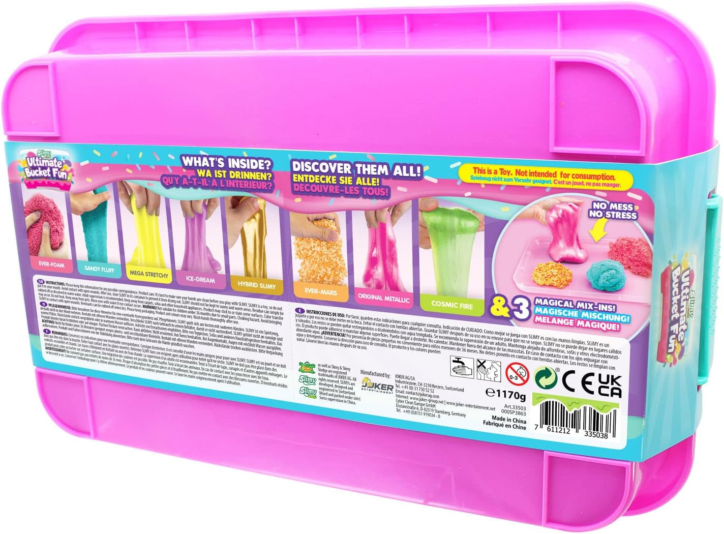 Il massimo divertimento slimy originale e viscioso. - Oltre 1,1 kg di massa di gioco e mix Una collezione delle nostre famose masse Slimy Accuratamente selezionato nella bella e pratica scatola riutilizzabile. Impilabile con coperchio, che può essere utilizzato anche come vassoio da gioco per giocare in modo pulito Naturalmente sicuro secondo la formula svizzera. Le masse originali Slimy vengono prodotte senza parabeni o altri conservanti aggressivi e al 100% senza glutine. Per la migliore qualità, tutte le materie prime essenziali provengono dalla Svizzera. Dermatologicamente testato. Le masse originali Slimy soddisfano i più severi standard di qualità e sicurezza. Per garantire la massima tollerabilità cutanea, i prodotti originali Slimy sono dermatologicamente testati da istituti indipendenti Prezioso pedagogico! Attivare, impastare e dividere le masse di gioco originali SLIMY promuovono lo sviluppo di abilità sensoriali, abilità motorie, percezione, immaginazione e creatività. Le forme e i fluidi stimolano la fantasia. Dopo aver giocato, conservare SLIMY nella confezione originale e sigillare ermeticamente per evitare che si secchi.
