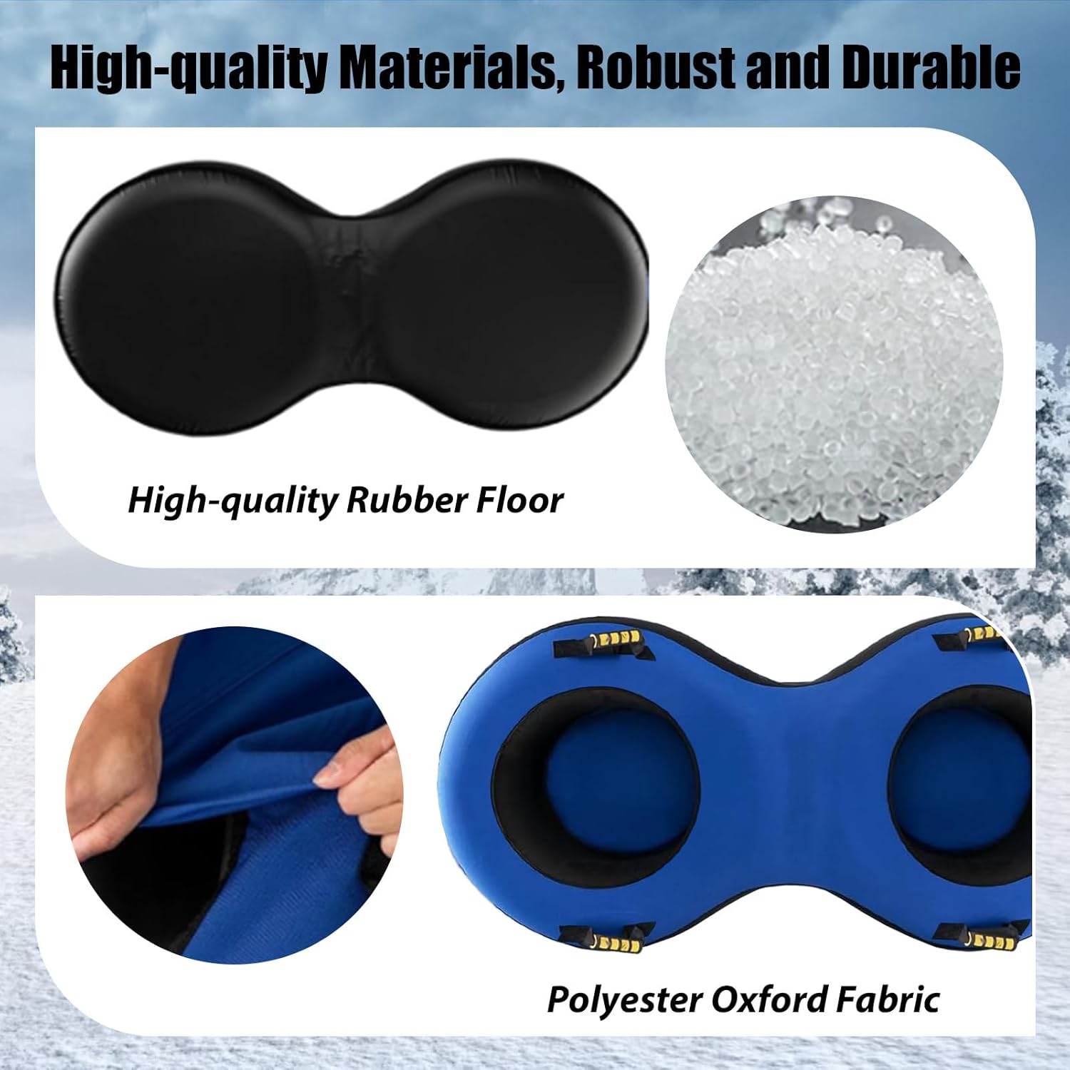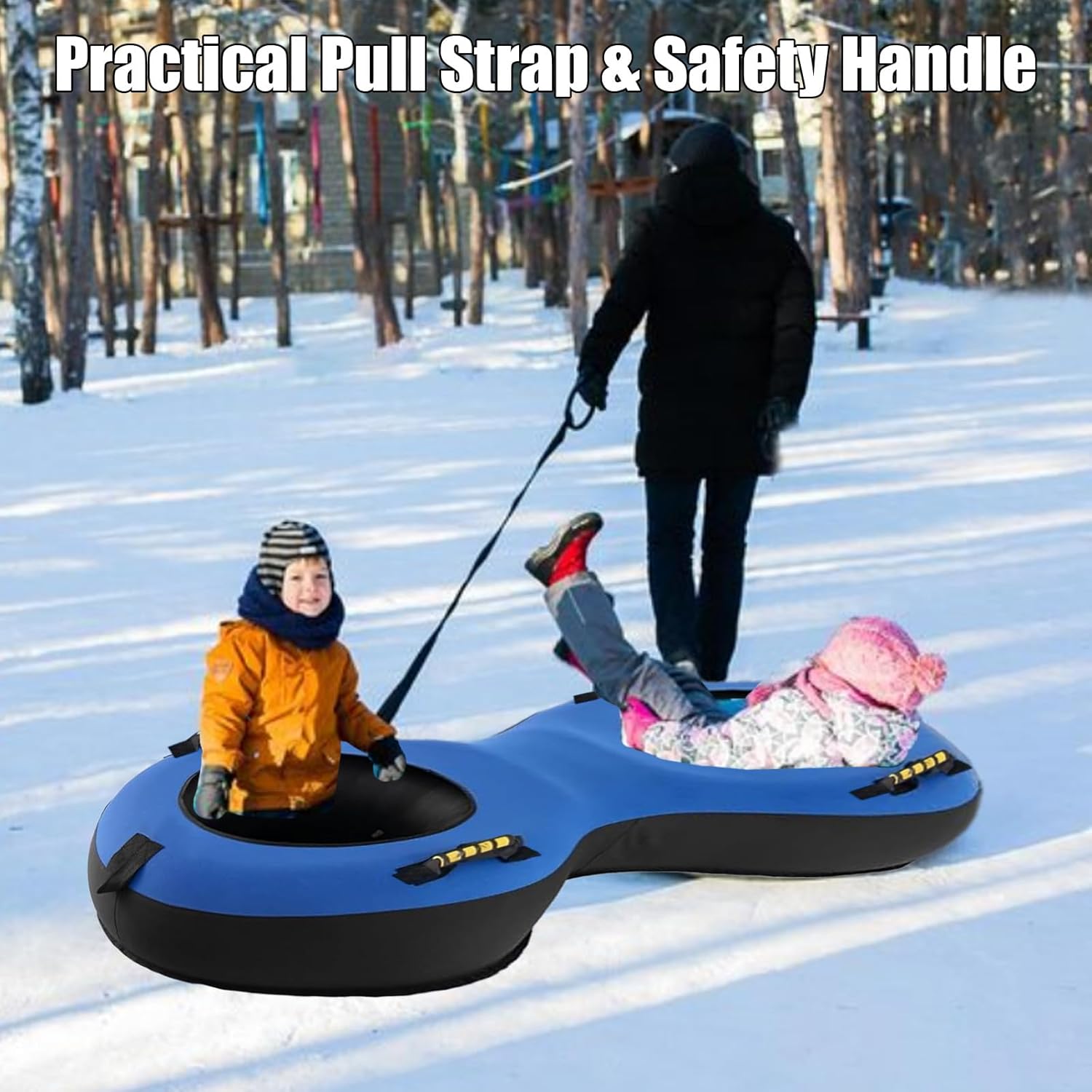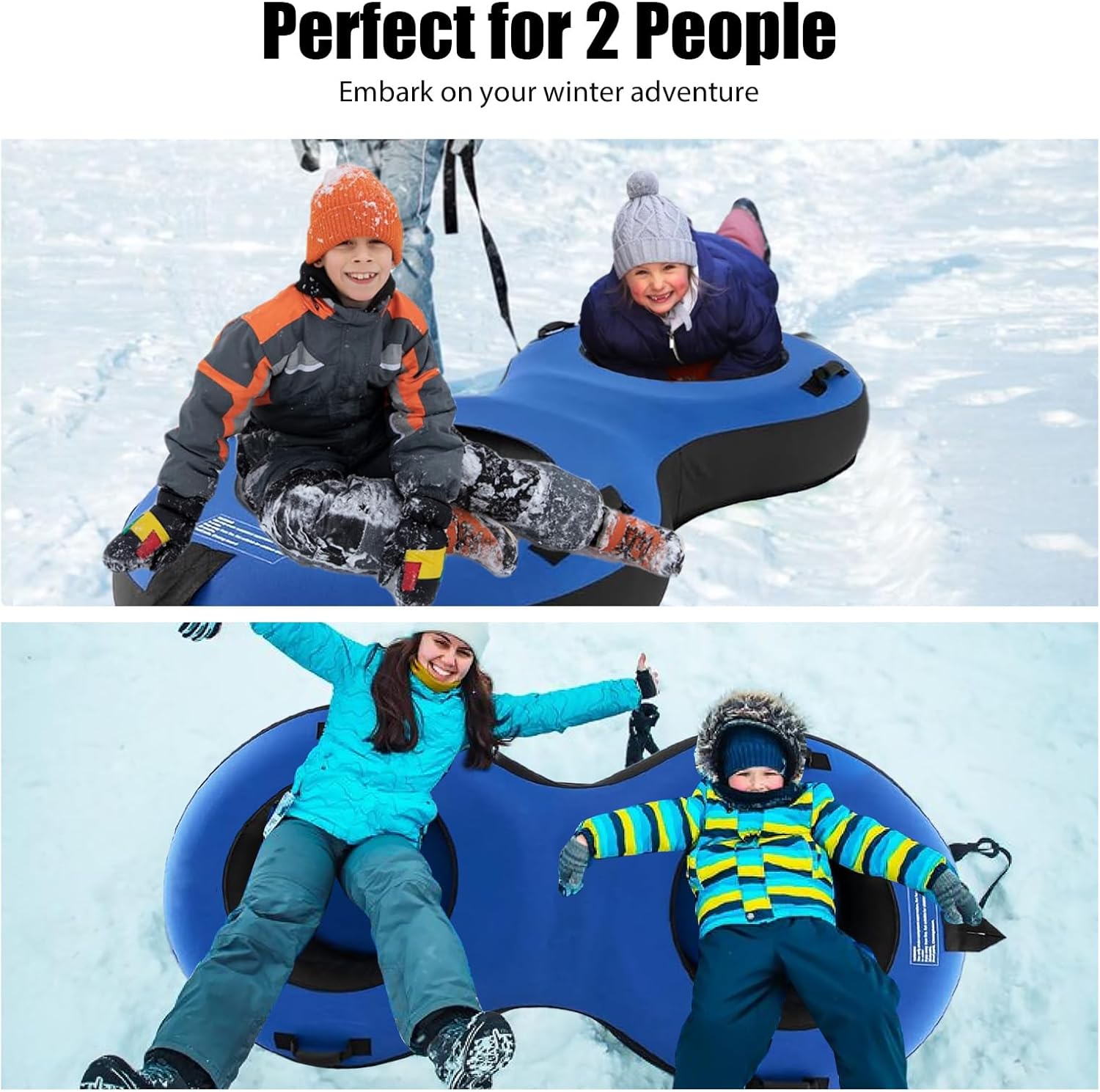 【Perfetto per 2 persone】 La slitta doppia misura 200 x 98 x 23 cm (lunghezza x larghezza x altezza) ed è particolarmente adatta per due persone. Offre più spazio per due passeggeri, ad esempio un genitore e un figlio o due bambini. Con una capacità di carico fino a 400 kg, è l'ideale per le avventure invernali con la famiglia o gli amici. 【Pratica cinghia da traino e maniglia di sicurezza】 Lo pneumatico da neve è dotato di una cinghia da traino rimovibile che consente di tirarlo senza sforzo su per la collina e trasportare i bambini in giro. Ci sono anche 4 maniglie fissate allo pneumatico da sci, che rendono la direzione di marcia più sicura e più facile da controllare. 【Robusto e durevole】 Lo snowtube è realizzato in tessuto Oxford rinforzato a doppio strato e gomma di alta qualità, che garantisce un'eccellente resistenza all'abrasione e alla perforazione. Il pavimento è realizzato in PVC laminato, che è più spesso del normale materiale vinilico, garantendo resistenza e durata complessive. Ciò significa che è progettato anche per temperature fredde fino a -30 °C, garantendo un uso esterno a lungo termine. Facile da gonfiare e sgonfiare: il pneumatico per slittino è dotato di una pompa ad aria universale che consente un gonfiaggio rapido e senza sforzo. Una valvola vorticosa e a prova di perdite impedisce all'aria di fuoriuscire. Inoltre, è incluso uno strumento per rimuovere la valvola dallo sfiato per garantire un rilascio dell'aria ancora più rapido. (Nota: il colore della pompa dell'aria può variare). Gli accessori sono estremamente estesi. Il cuscino del sedile incluso garantisce a te e alla tua famiglia una seduta particolarmente comoda sullo pneumatico da sci. Tu e i tuoi cari potrete così prepararvi per un'avventura invernale indimenticabile!