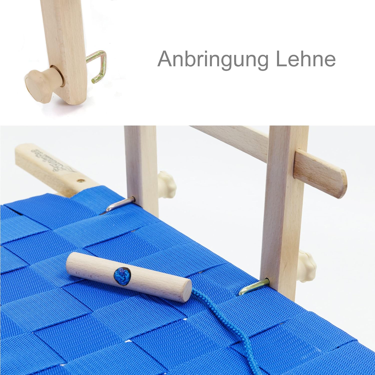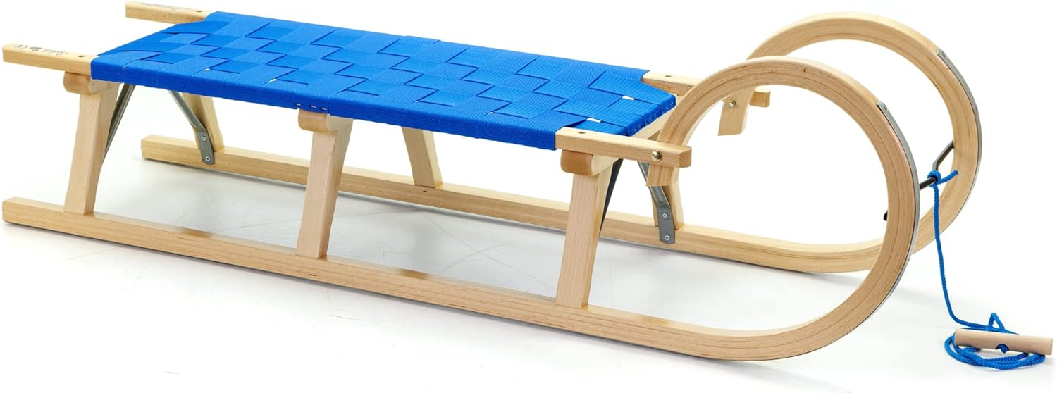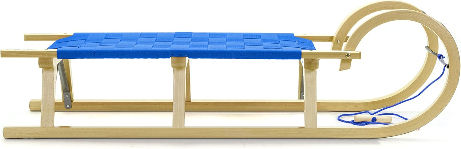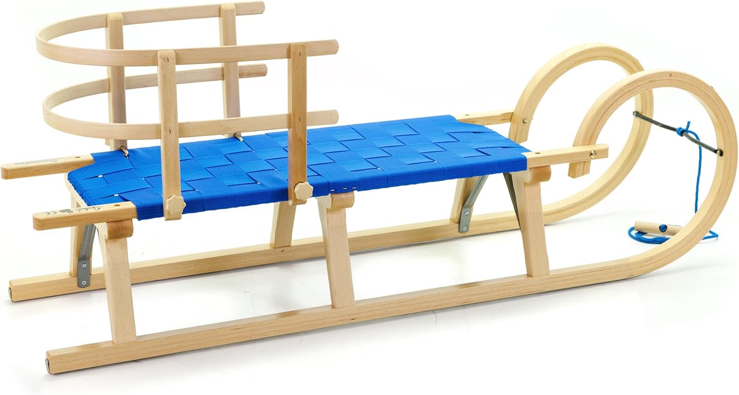 Slitta per famiglie e tempo libero lunghezza 120 cm di buona qualità Pattini in compensato curvato Libro, cavalletti, doghe Legno duro di faggio Sedile in cintura intrecciata Blu con schienale + guinzaglio con manico in legno di faggio, lunghezza 140 cm Ulteriori informazioni e dati tecnici nella descrizione