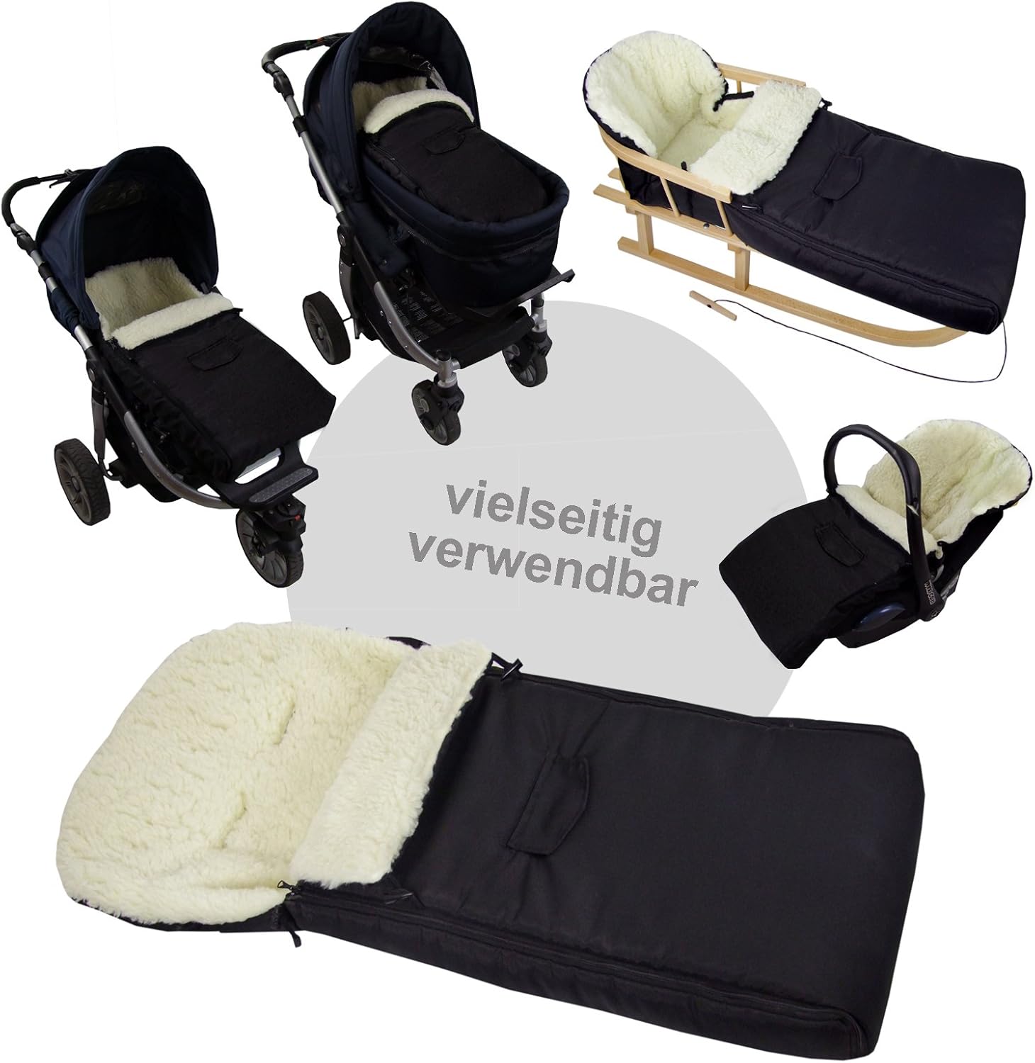 Pacchetto combinato: slitta in legno e sacco a pelo invernale (108 cm). Il pacchetto si compone di: Slittino in legno con schienale e corda da traino e un sacco nanna invernale in lana d'agnello. Slitta in legno di faggio laccato con colori naturali, pattini in metallo, cavalletto e ferro verniciato a polvere, schienale (rimovibile) e corda di traino. Sacco nanna invernale universale in lana d'agnello, adatto per ovetto, passeggino e slitta, per cinture a 3 e 5 punti, montaggio facile e veloce, impermeabile e antivento.