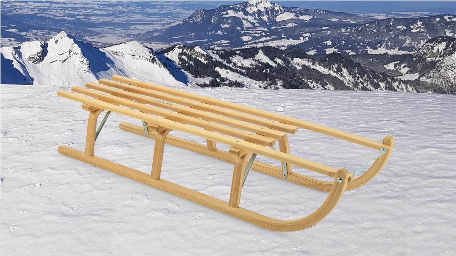 Slittino stile Davos 115 cm. Guide e cavalletti in legno di faggio curvato, doghe del sedile in legno massello locale, trafila in acciaio zincato. La ferramenta semitonda in ferro, tutte le parti di collegamento e le viti sono zincate. La verniciatura è ecologica ed ecologicamente innocua. Si prega di notare che la slitta viene consegnata senza schienale.