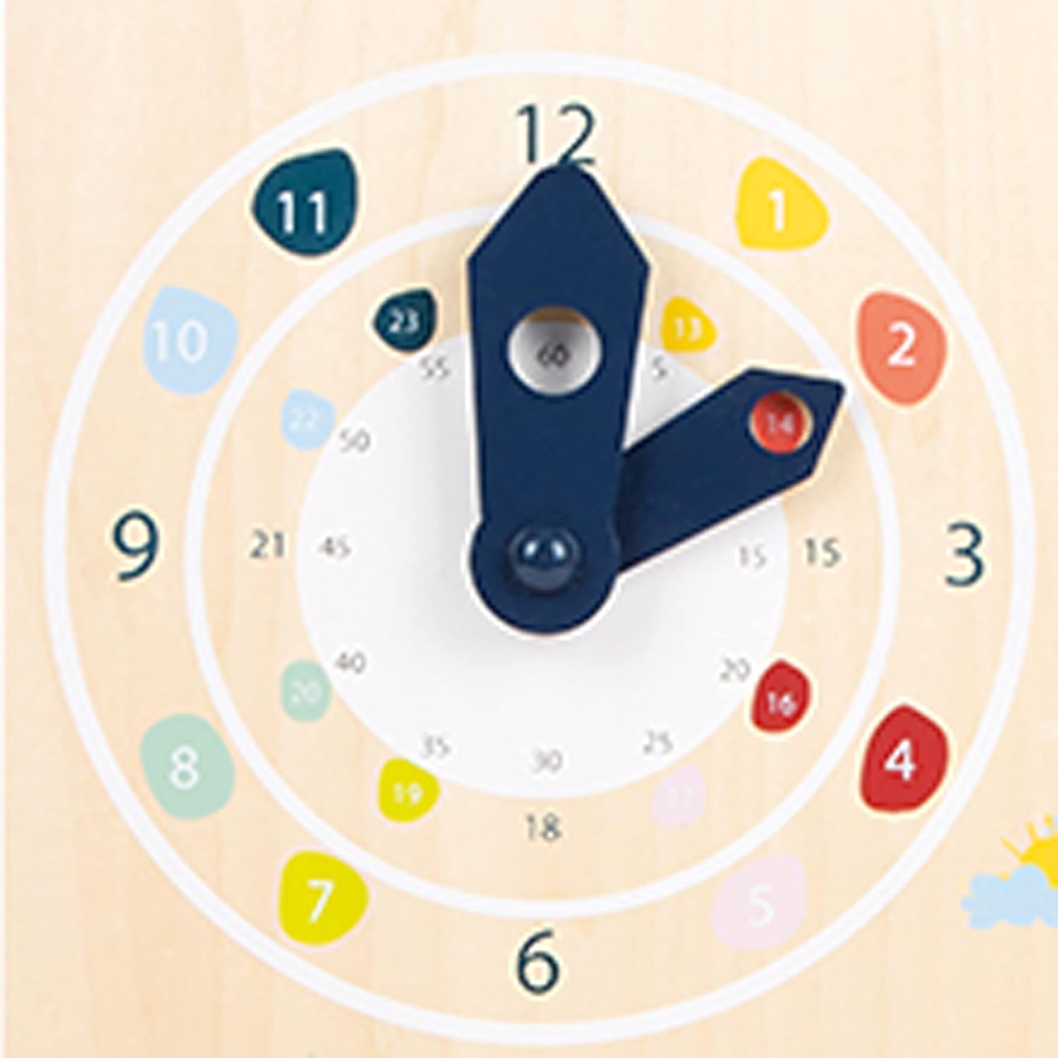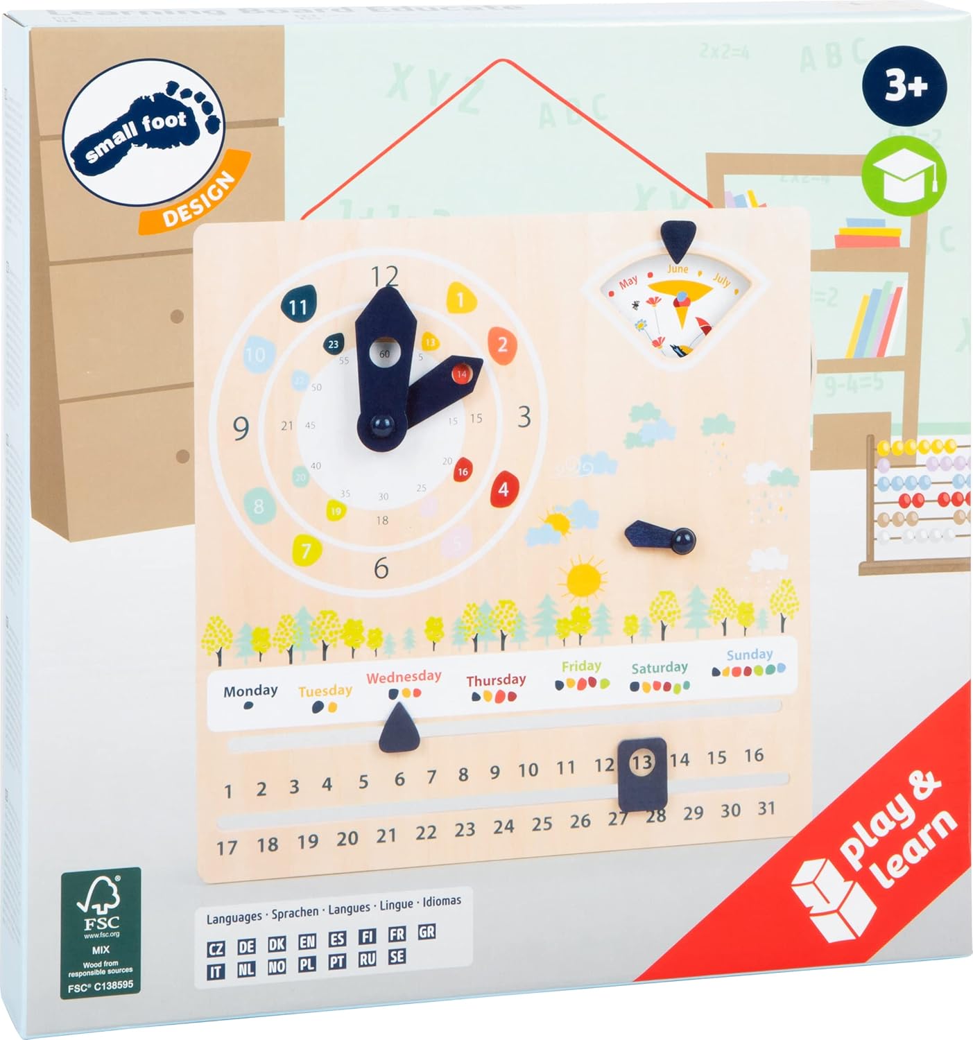 Questo prodotto è fatto in legno certificato FSC Come calendario la tavola didattica multifunzionale insegna in maniera facilmente comprensibile la nozione di mesi, giorni della settimana, stagioni, ore, sospensione inclusa La rappresentazione del tempo avviene in formato 12-24, nonché in forma digitale e analogica tramite numeri e lancette Spostando manualmente le lancette e le rotelle si sostiene l'effetto di apprendimento tramite azioni motorie e allo stesso tempo si promuove l'apprendimento tramite il gioco Il clou: tramite le etichette autoadesive incluse il calendario può essere mostrato in 15 lingue diverse - è quindi ideale da utilizzare anche per la lezione di lingua straniera (DE, EN, FR, IT, ES, PL, CZ, NO, NL, DK, PT, RU, FI, SE, GR)