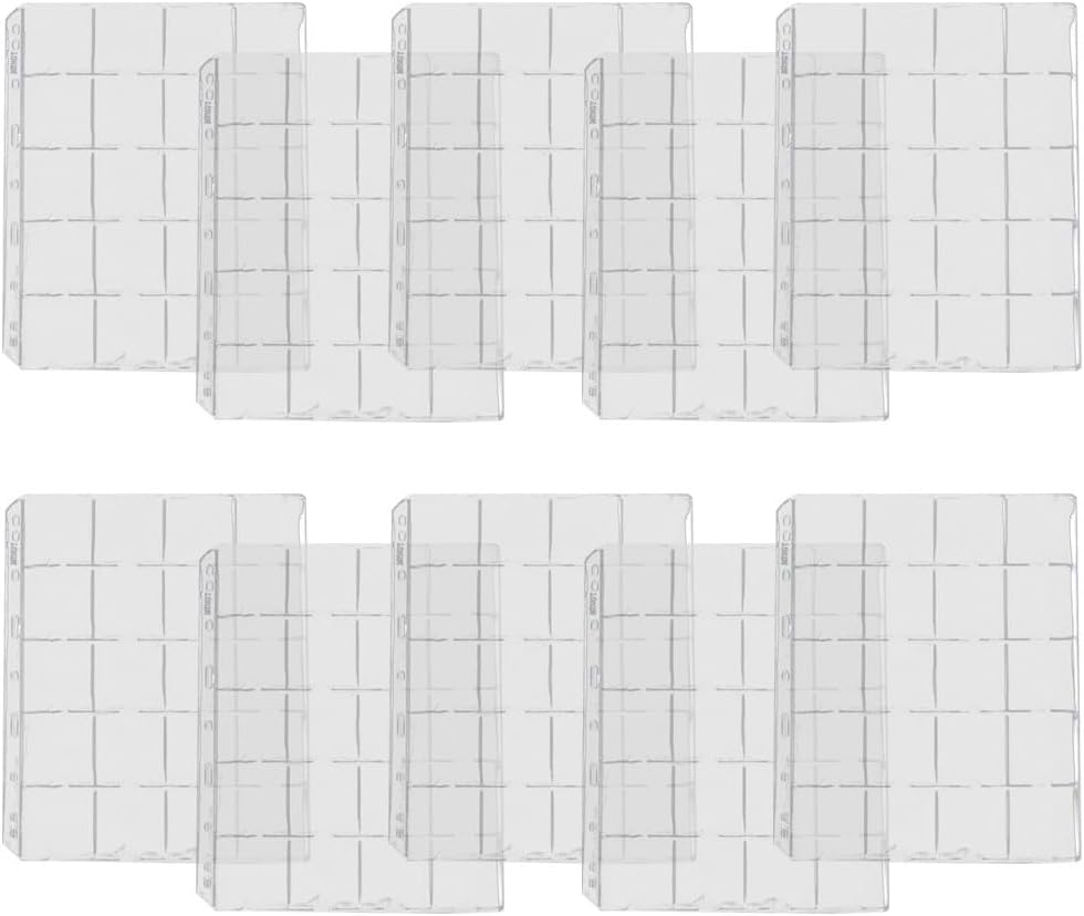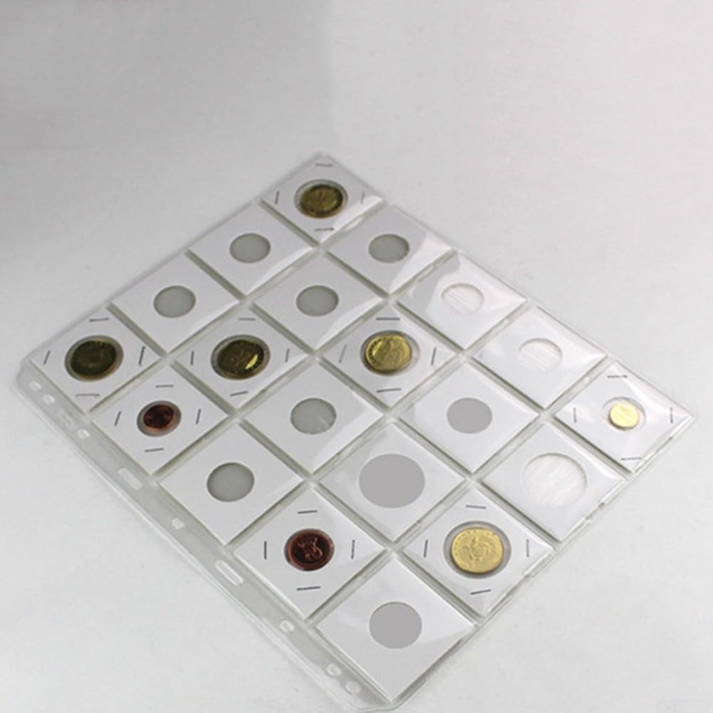 [1/10 fogli 20 tasche in PVC trasparente titolare pagina album per collezione] Comoda conservazione: ricevi 1/10 fogli da 20 tasche trasparenti, fornendo ampio spazio per le esigenze quotidiane di conservazione. Ogni tasca interna misura circa 52 x 52 mm. Organizzazione trasparente per monete: adatto per monete fino a 50 mm, ogni pagina può contenere 20 monete, per conservare in modo ordinato e organizzato. Materiale sicuro: realizzato in PVC trasparente, questo supporto è ecologico e facile da pulire. I bordi lisci evitano danni alle mani. Inoltre, è antipolvere e impermeabile per un uso a lungo termine. Facile da usare: caratterizzato da un design a foglia larga con 9 fori, questo album è facile da organizzare. Ogni tasca ha una patta antiscivolo per una conservazione sicura. Si tratta di un comodo sostituto per i supporti esistenti e semplice da installare. Applicazione versatile: perfetto per monete, gettoni, medaglie, badge e altri oggetti simili. Un accessorio per appassionati e collezionisti.