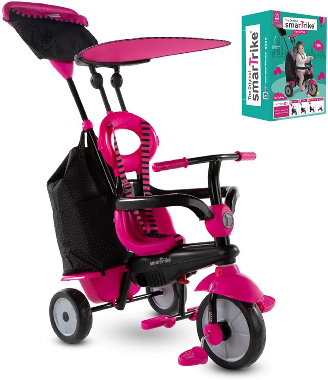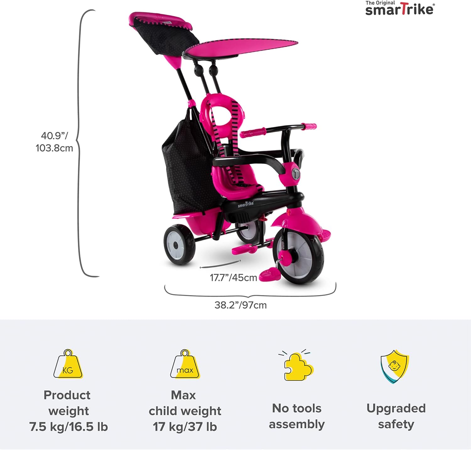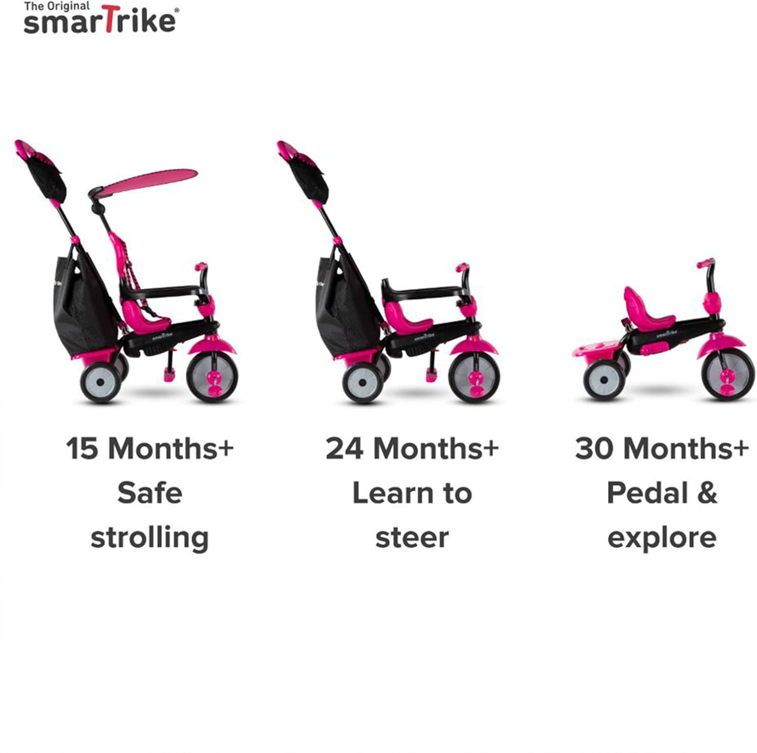 4 passaggi "cresce con me". A tuo figlio piacerà questo triciclo per anni, perché si evolverà con lui. Dual Control: decidi in 1 click chi dirige il triciclo e cambia in modo facile tra bambini e genitori. Protezione dal sole: si piega e si apre per proteggere il bambino. Spazio di archiviazione aggiuntivo - incluso un ampio spazio di archiviazione, una console per i genitori e un posto dove riporre i giocattoli. Sicurezza -imbracatura a 3 punti, barra di sicurezza e ammortizzatori mantengono il bambino al sicuro durante la passeggiata.