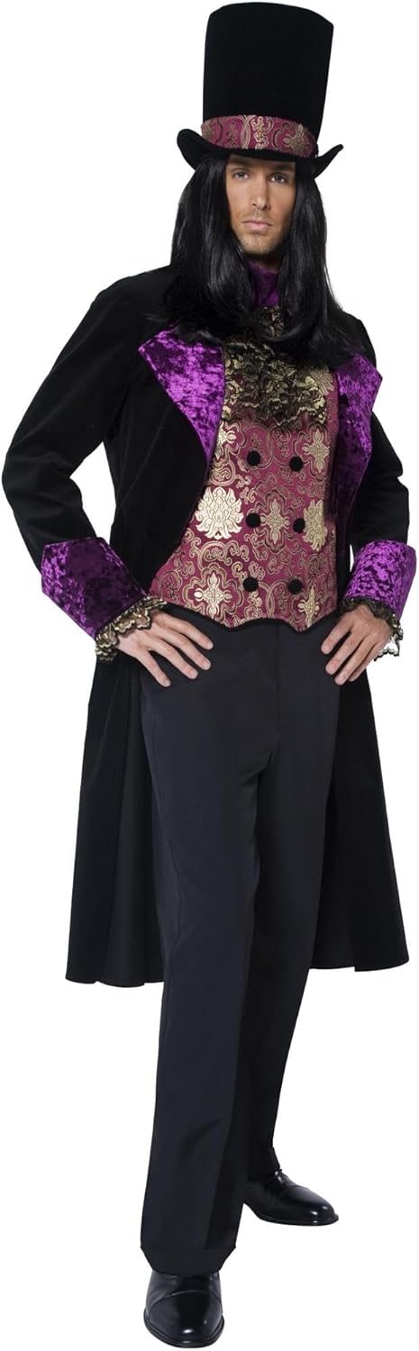 Descrizione prodotto Costume gotico nero viola e oro con gilet, giacca e cappello Avviso di sicurezza dai 3 anni in su