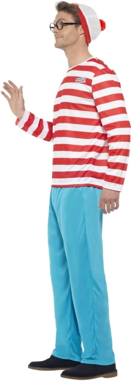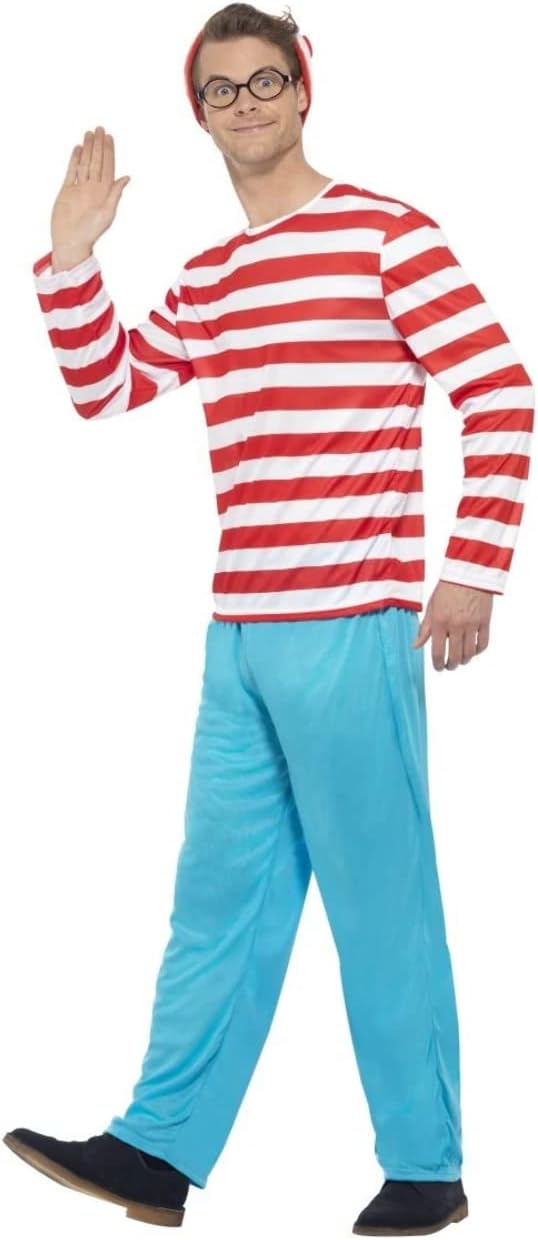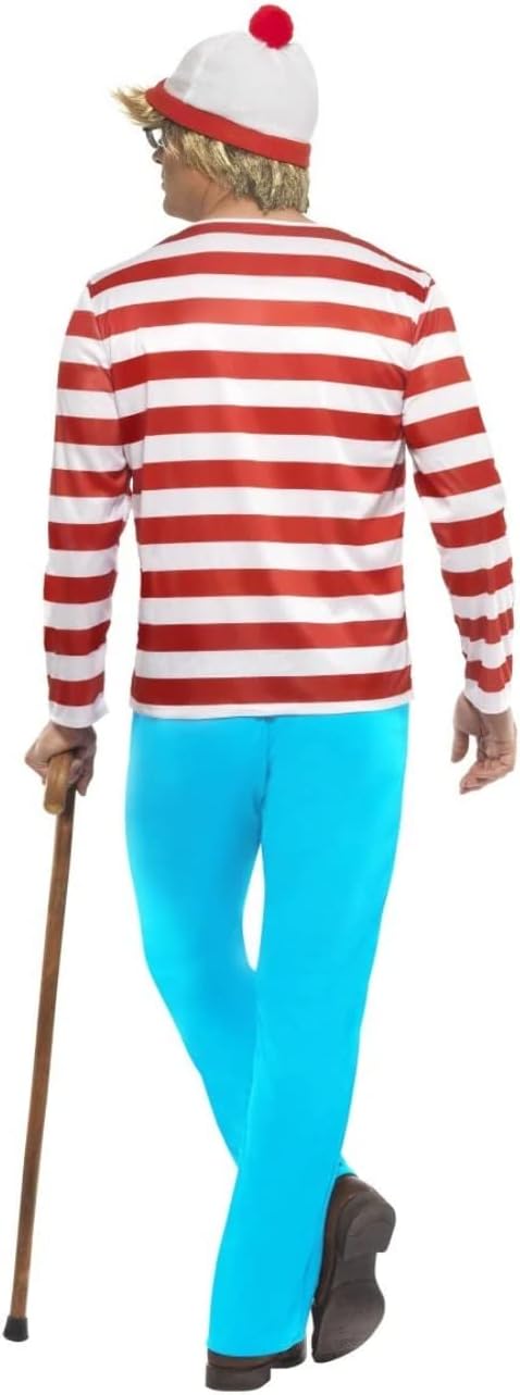 Dov'è Waldo? costume da uomo, Incluso: maglietta a righe rosse e bianche, pantaloni blu, cappello e occhiali - Taglia L: Petto: 107-112 cm, Vita: 91-97 cm, Cucitura interna: 84 cm, Materiale leggero e piacevole da indossare sopra i vestiti - Facile da indossare e da togliere, Facile da andare in bagno grazie al materiale elastico