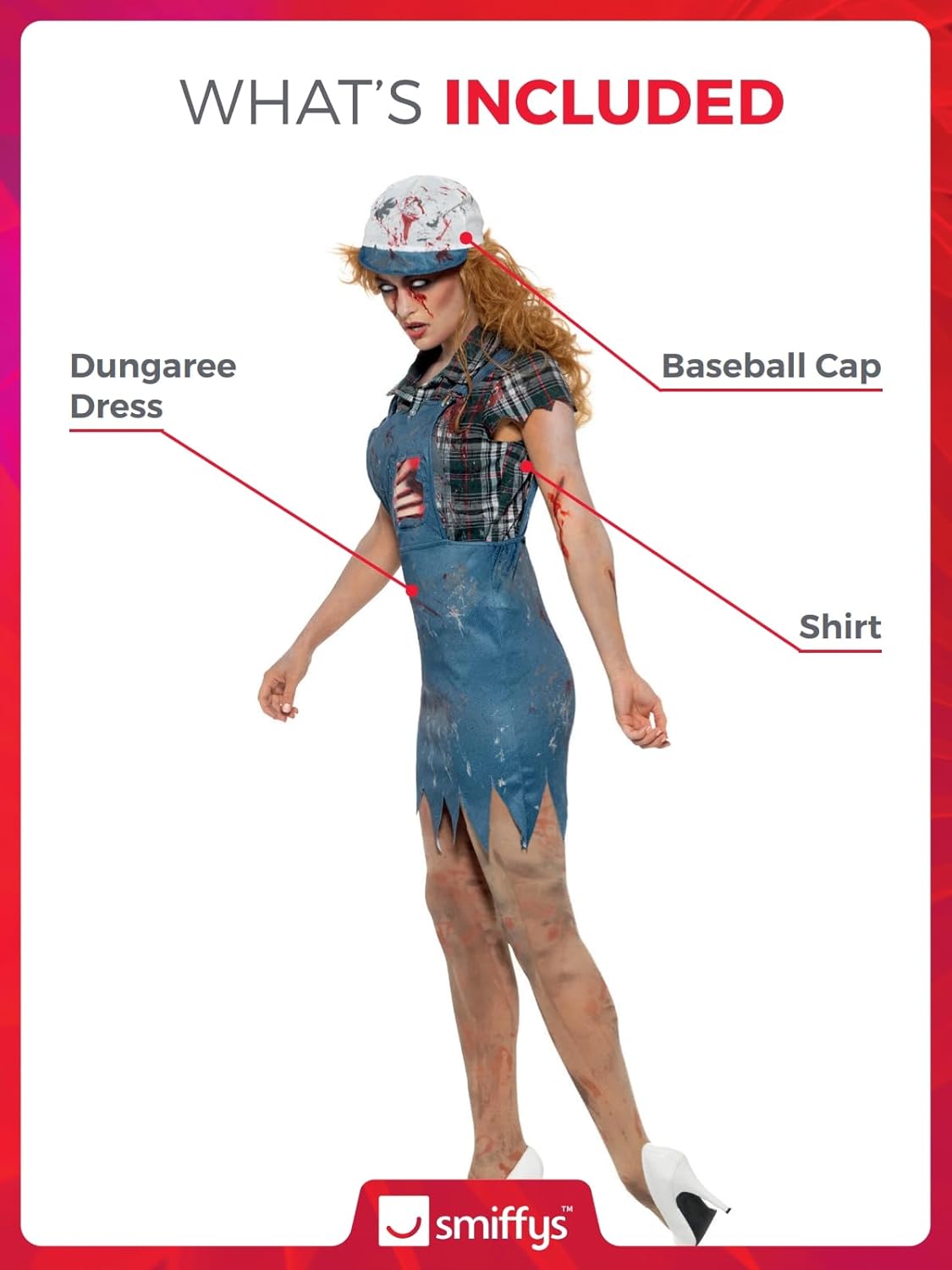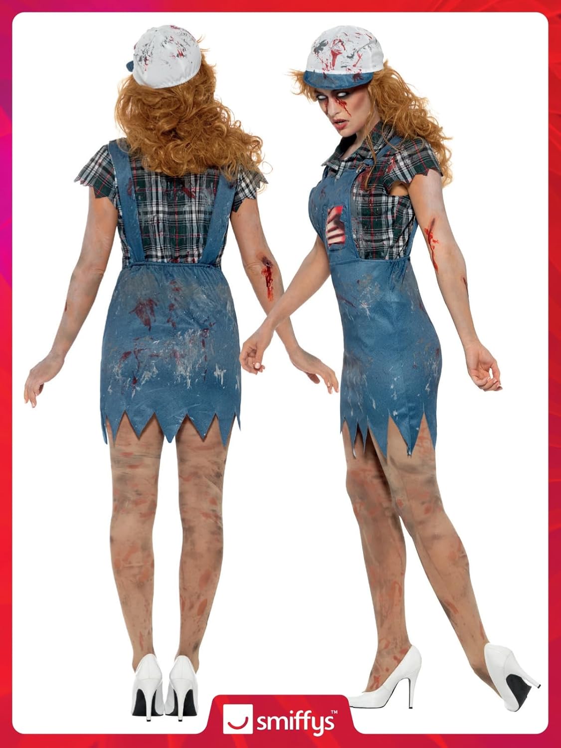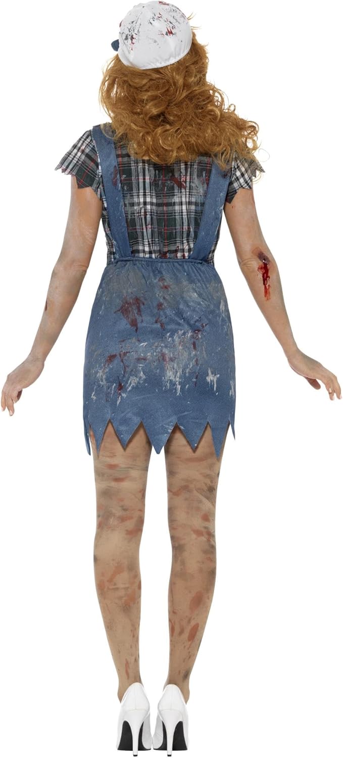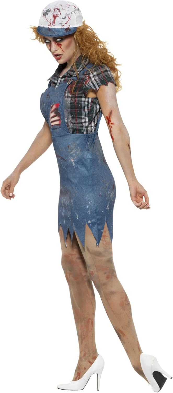 Costume da zombie montanaro da donna, blu, tuta, costola in lattice, camicia e berretto da baseball, in borsa da esposizione