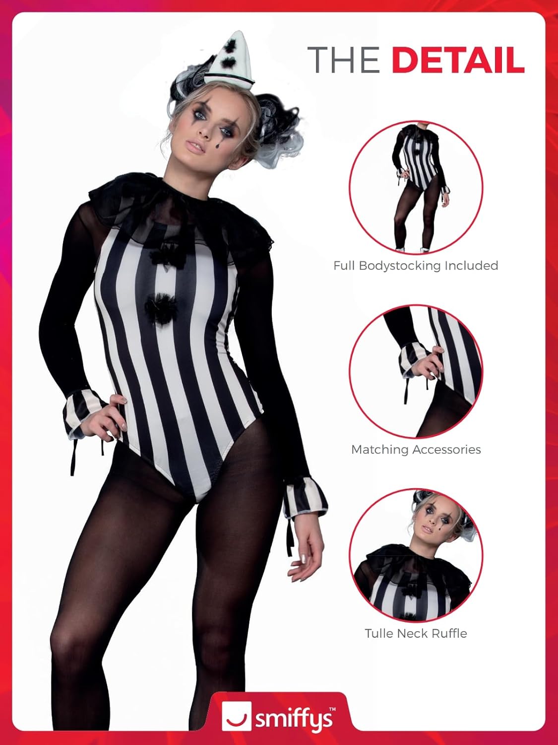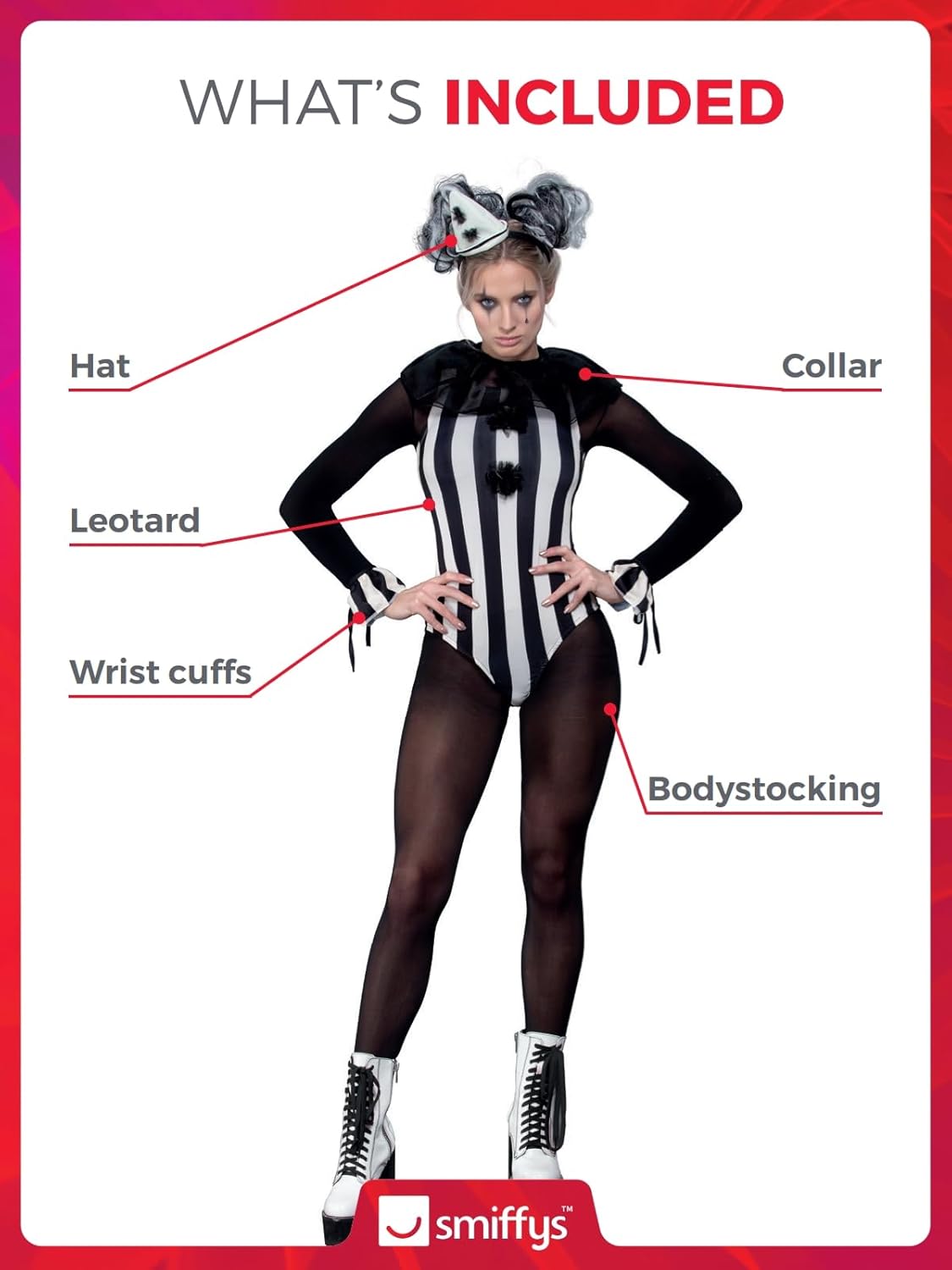 Include un body da clown Fever vintage, body, colletto, polsini e cappello. Tieni presente che tutti i nostri prodotti Smiffys verranno sempre consegnati in una confezione completa con marchio Smiffys.