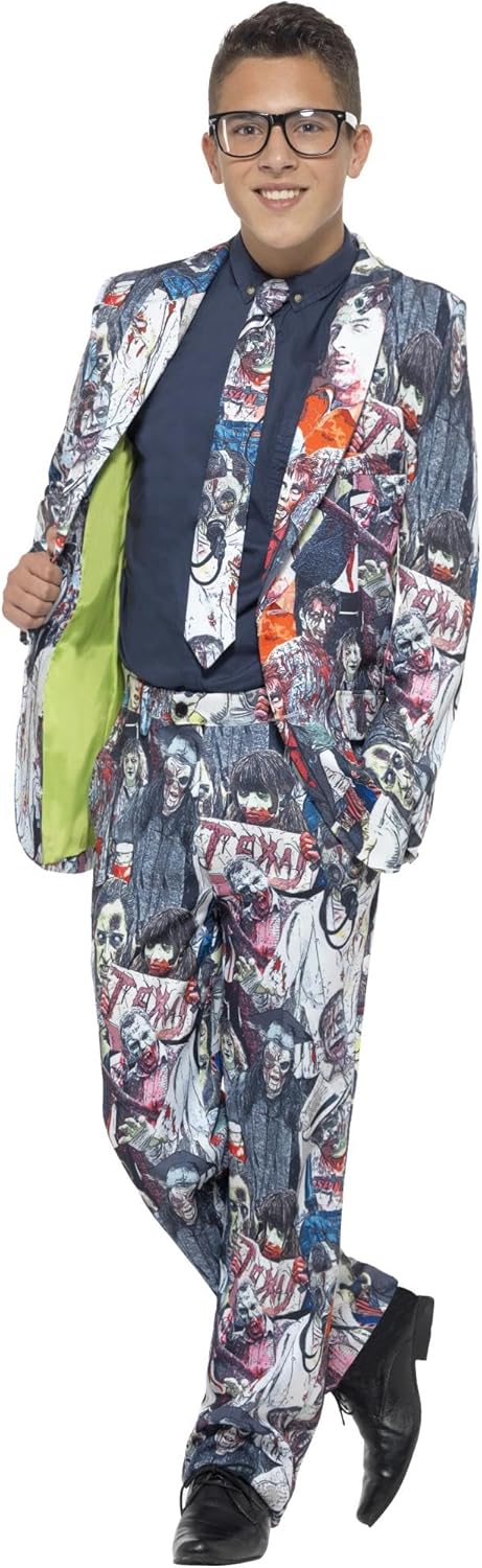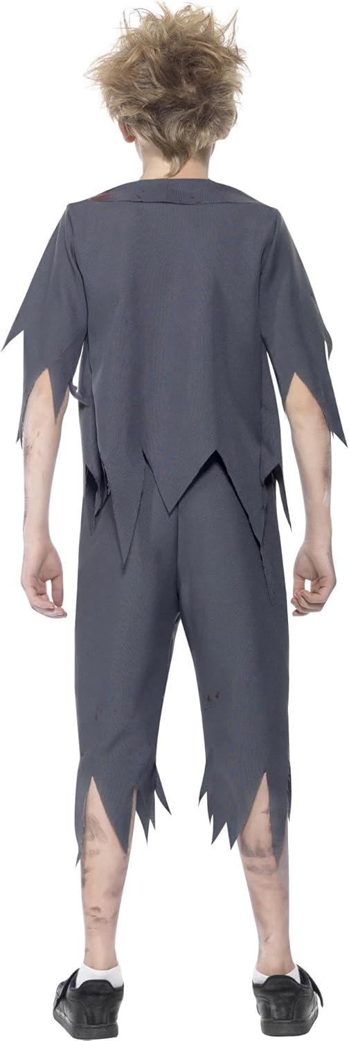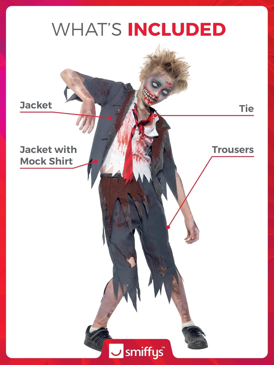 Questo costume da studioso zombie per ragazzi è composto da un top e pantaloni. (Scarpe non incluse). Il top può essere indossato come una t-shirt e rappresenta una finta camicia bianca con una cravatta nera e rossa sotto una giacca grigia. L'intera parte superiore è macchiata di sangue e strappata alle estremità. I pantaloni sono grigi e anche macchiati di sangue. Ha due fori nella parte anteriore ed è strappato alle estremità. I pantaloni sono elastici intorno alla vita. Questo costume zombie sarà perfetto per spaventare i tuoi compagni di scuola in classe a Halloween.