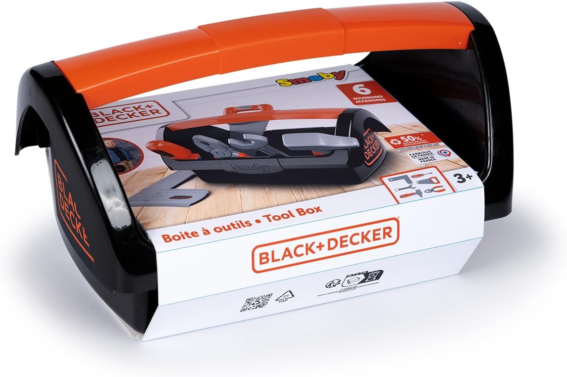Bricole come papà e mamma con la tua splendida cassetta degli attrezzi Black + Decker! Hai a disposizione tutti gli strumenti necessari per iniziare il fai da te: 1 cacciavite, 1 sega, 1 martello, 1 chiave piatta, 1 staffa e 1 morsetto. Pratico, potrai portarlo facilmente e ovunque con te grazie alla sua maniglia! Per bambini dai 3 anni in su Fabbricazione francese.