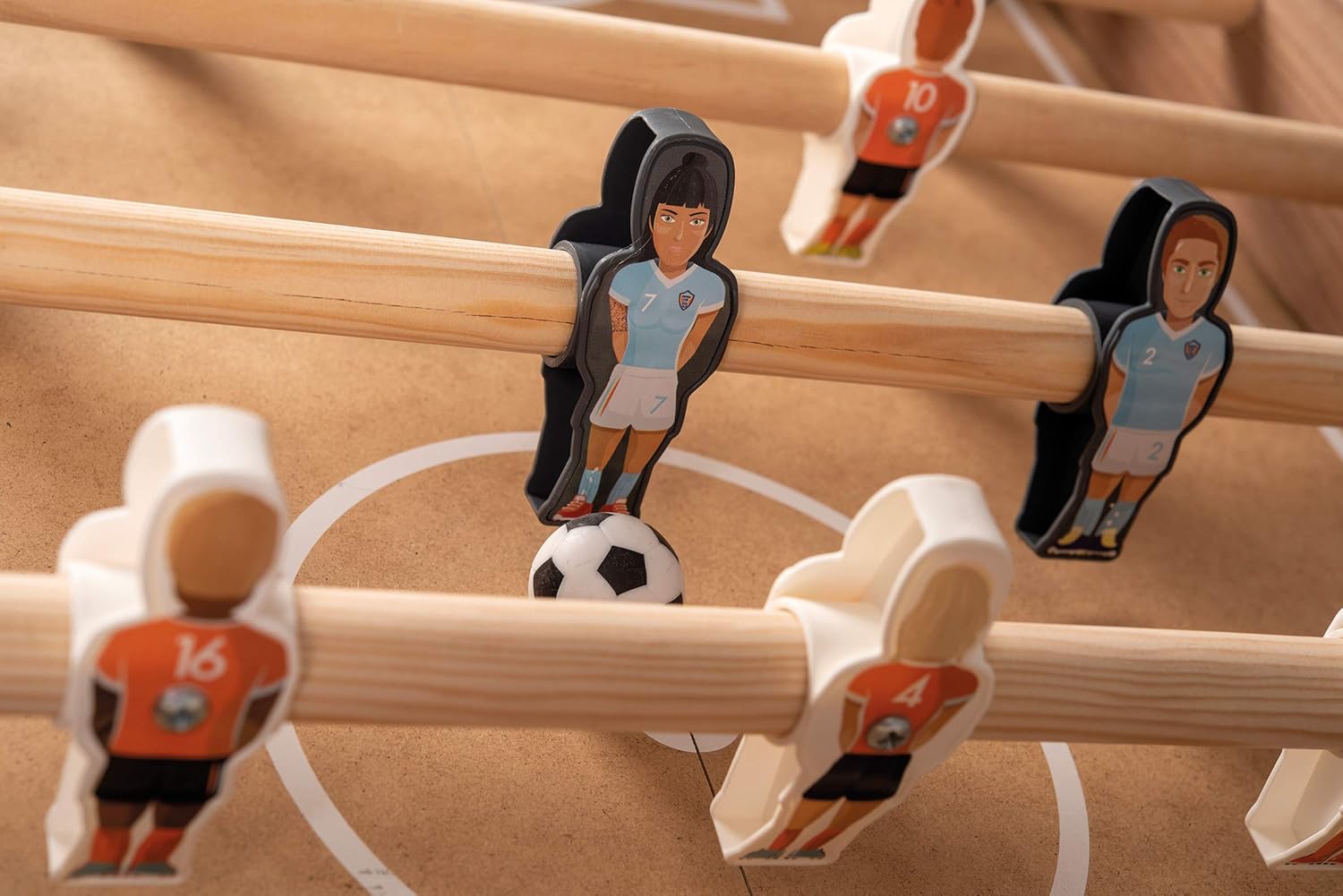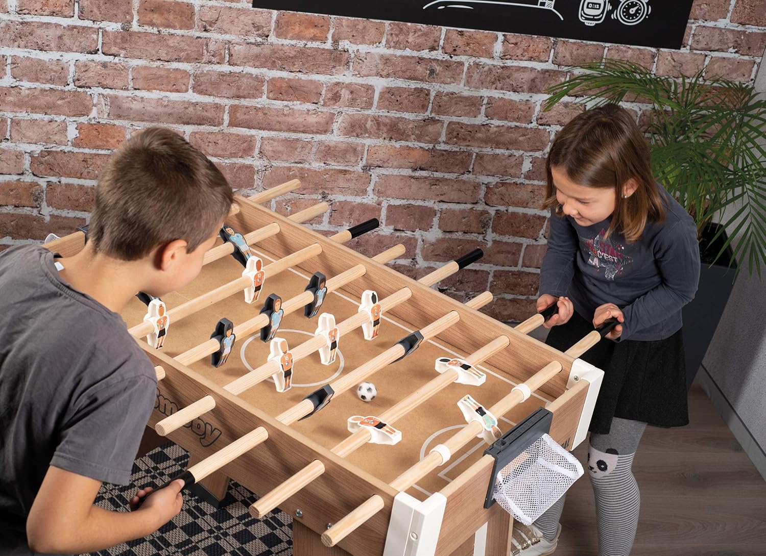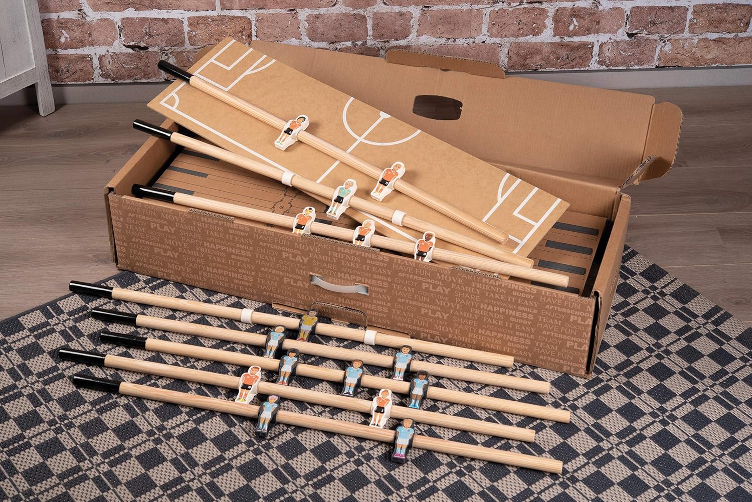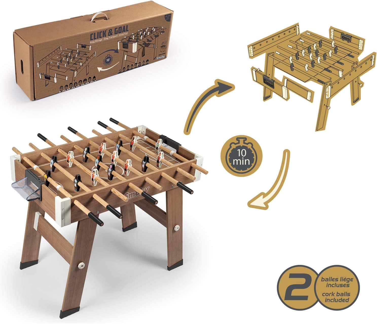 Gioco portatile e pratico: Il calcio balilla Click & Goal si monta e smonta rapidamente, permettendoti di portarlo ovunque tu vada, a casa, nel fine settimana o con gli amici Si ripone facilmente per un trasporto senza problemi Montaggio senza sforzo: Grazie al suo nuovo sistema a clip, i diversi elementi del calcio balilla si uniscono e smontano facilmente, senza richiedere l'uso di attrezzi Goditi un montaggio facile e veloce ogni volta Qualità e durata: Questo calcio balilla dal design elegante è realizzato principalmente in legno, comprese le sbarre, offrendo così grandi robustezza e qualità costruttiva eccezionale per infinite ore di gioco Giocatori unici e divertenti: i giocatori in plastica sono decorati con adesivi unici, portando un tocco di divertimento e realismo ad ogni gioco Ogni giocatore è diverso, rendendo ogni partita ancora più emozionante Viene fornito con tutto il necessario: il prodotto viene fornito in una scatola di trasporto di alta qualità, con due maniglie ritagliate per un facile trasporto Sono incluse due palline: una in sughero e una in plastica, che offre due diversi stili di gioco per una varietà ancora maggiore