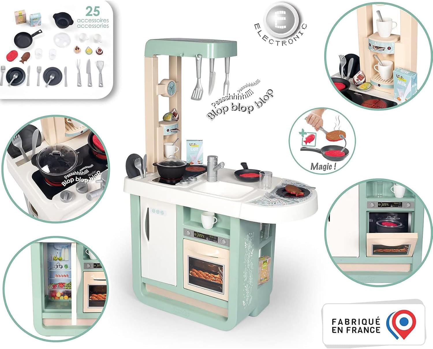 Cucina dal design moderno, con tante funzioni e modulo elettronico. Inclusi 23 accessori oltre ad un forno, un lavello, un frigorifero ed un amacchina per il caffè. Altezza del piano di gioco: 48,5 cm Funziona con due batterie LR03 1,5 V non incluse Made in France. Per bambini dai 3 anni