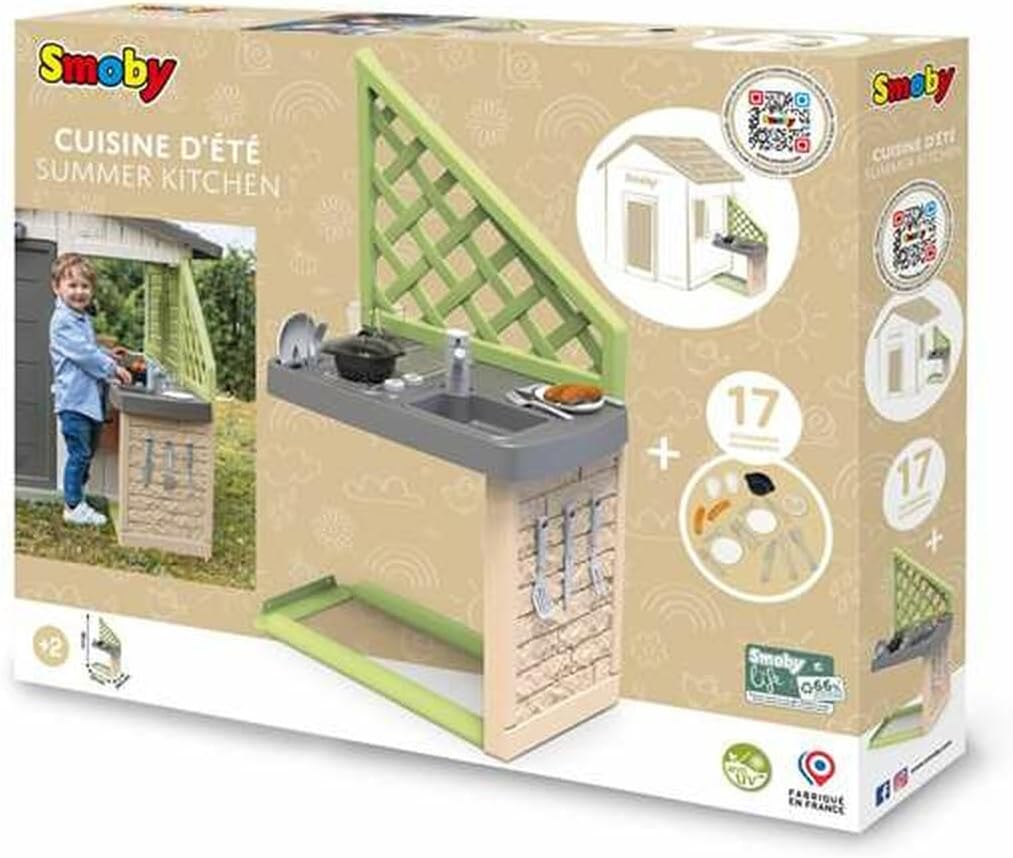 Cucina estiva adattata per adattarsi a casette compatibili Smoby La cucina è composta da 1 "grill" e 1 lavandino con rubinetto Include 17 accessori per illuminare le funzioni di gioco I pezzi in plastica sono trattati anti-UV per una buona resistenza e una migliore durata dei colori nel tempo Dimensioni montato: 54 x 34,5 x 98 cm (L x P x A)