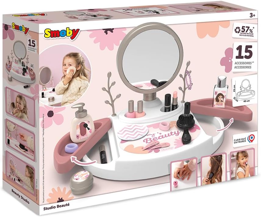 Scopri My Beauty Studio, un must per il mondo della bellezza per i più giovani. Questo prodotto riunisce i tre universi di bellezza preferiti dai bambini, vale a dire acconciatura, unghie e trucco. Con i suoi colori tenui, il suo design pulito e accuratamente pensato il prodotto si adatta perfettamente alla stanza del tuo bambino. È dotato di uno specchio rimovibile e regolabile, per adattarsi alle dimensioni del tuo bambino. Inoltre, gli scaffali rotanti offrono spazio aggiuntivo, due alberi per gioielli consentono di appendere bracciali, anelli, collane e molto altro. Per rendere il gioco ancora più reale, sono inclusi 15 accessori fittizi: 2 rossetti con funzioni meccaniche, 2 vernici, 1 mascara, una bottiglia a pompa, un barattolo di crema, un flacone di lozione, un cotone struccante in tessuto bimateriale, una spazzola per capelli, 2 elastici, 2 pinzette, e 1 braccialetto. Questo giocattolo contiene almeno il 57% di materiale riciclato. A partire dai 3 anni. Fabbricazione francese. Il trucco è fittizio.