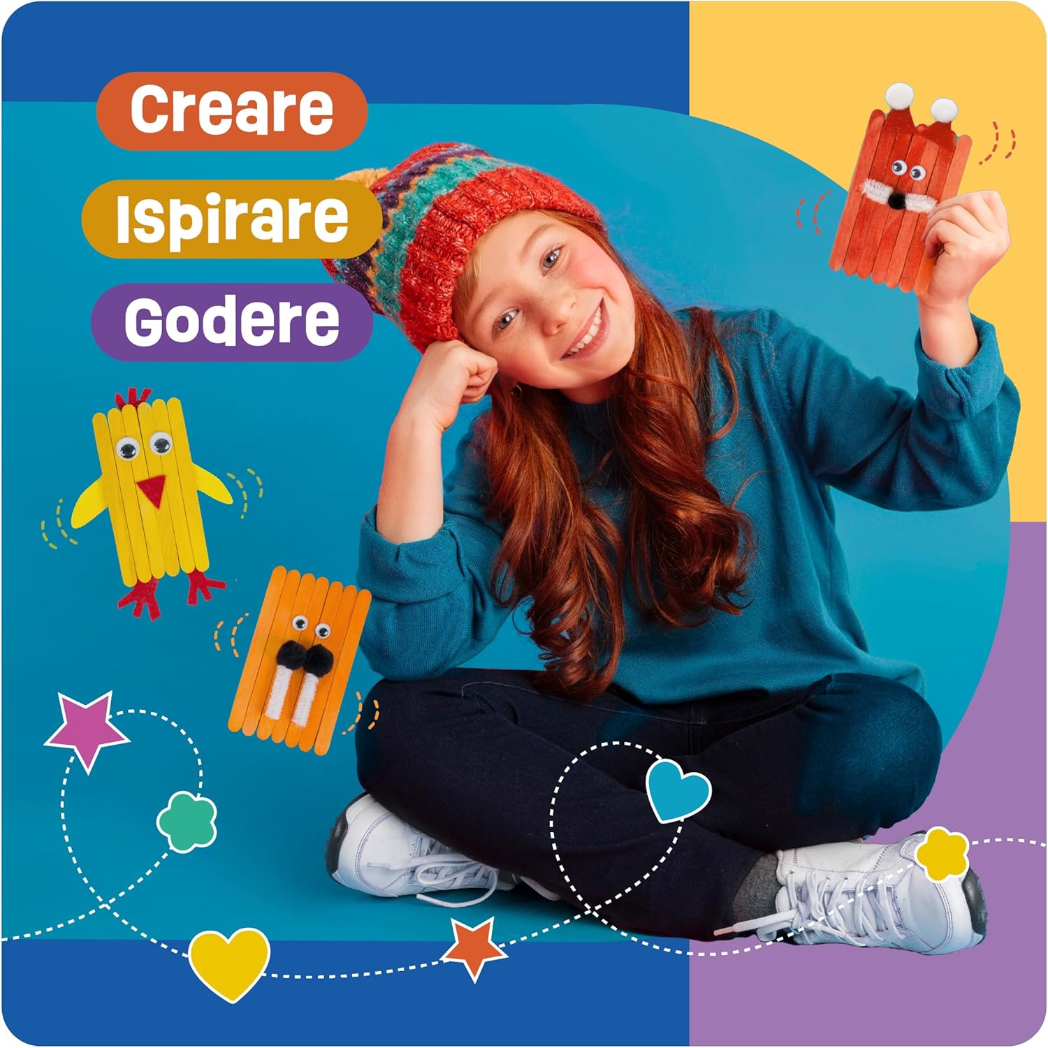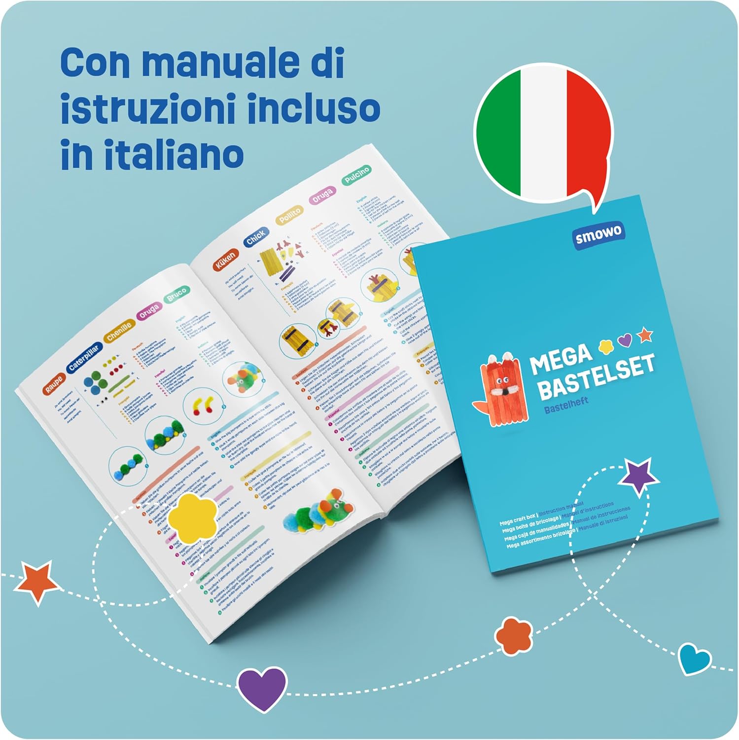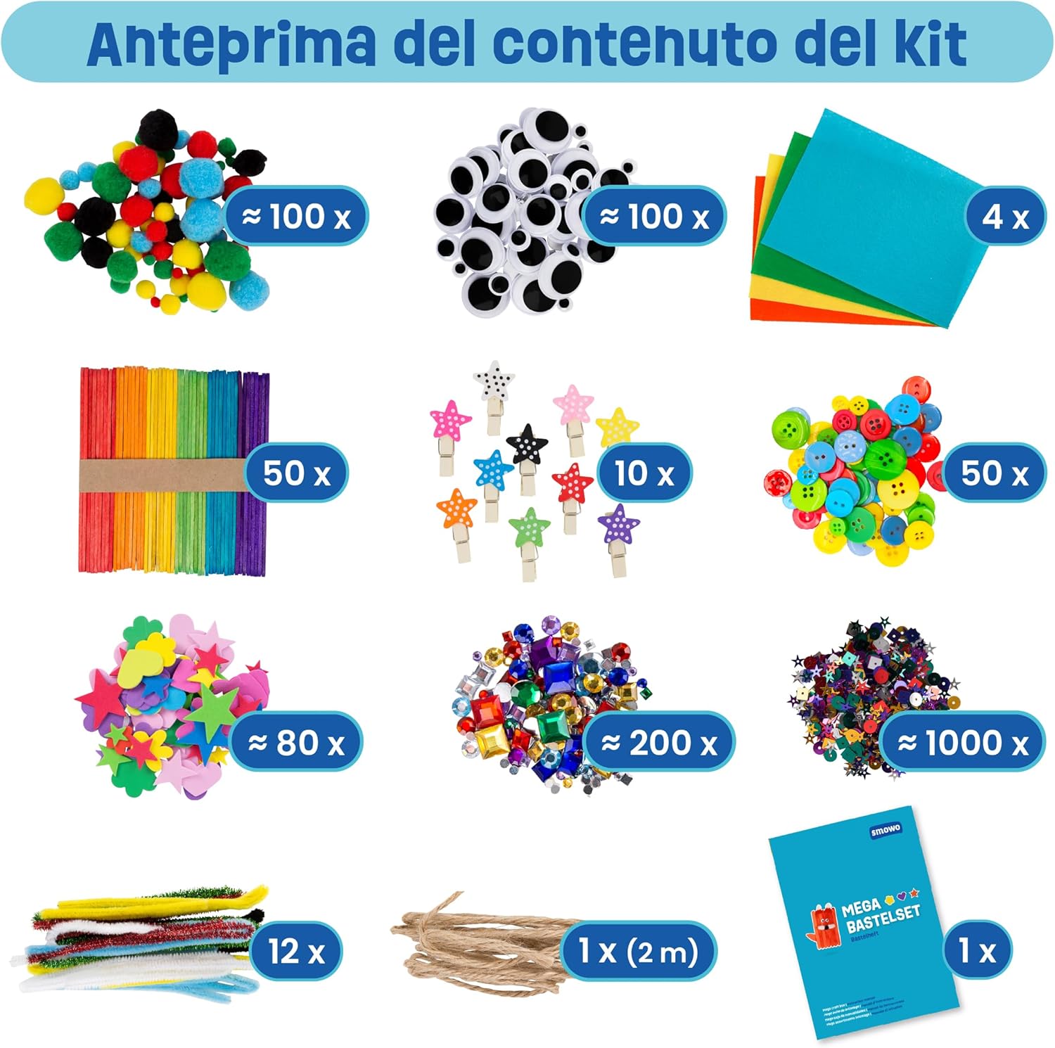 🌟 𝗚𝗥𝗔𝗡𝗗𝗘 𝗗𝗜𝗩𝗘𝗥𝗧𝗜𝗠𝗘𝗡𝗧𝗢 𝗖𝗥𝗘𝗔𝗧𝗜𝗩𝗢: Oltre 1000 pezzi – 11 diversi articoli creativi in una scatola per lavoretti – materiale per ore di attività manuali in un unico set di bricolage 🌟 𝗠𝗘𝗚𝗔 𝗖𝗢𝗡𝗧𝗘𝗡𝗨𝗧𝗢 𝗗𝗘𝗟𝗟𝗔 𝗕𝗢𝗫: 100 pompon, 12 scovolini, 4 fogli A4 in feltro, 100 occhi adesivi, 200 strass, 1000 paillettes, 80 adesivi in gomma EVA, 50 bastoncini creativi, 10 fermagli a stella, 1 cordoncino, 50 bottoni colorati 🌟 𝗖𝗢𝗡 𝗤𝗨𝗔𝗗𝗘𝗥𝗡𝗢 𝗖𝗥𝗘𝗔𝗧𝗜𝗩𝗢: Idee e modelli per iniziare subito a creare con diversi materiali – istruzioni passo passo con 10 motivi facili da realizzare 🌟 𝗣𝗘𝗥 𝗣𝗜𝗖𝗖𝗢𝗟𝗜 𝗘 𝗚𝗥𝗔𝗡𝗗𝗜 𝗔𝗥𝗧𝗜𝗦𝗧𝗜: Il set creativo con tanti materiali è adatto come regalo, per feste di compleanno, vacanze o lavoretti in famiglia – divertimento ideale anche a Natale e Pasqua 🌟 𝗖𝗥𝗘𝗔𝗧𝗜𝗩𝗢 𝗘 𝗘𝗗𝗨𝗖𝗔𝗧𝗜𝗩𝗢: Il materiale di bricolage stimola in modo giocoso la motricità fine, la creatività e la concentrazione dei bambini offrendo allo stesso tempo tanto divertimento