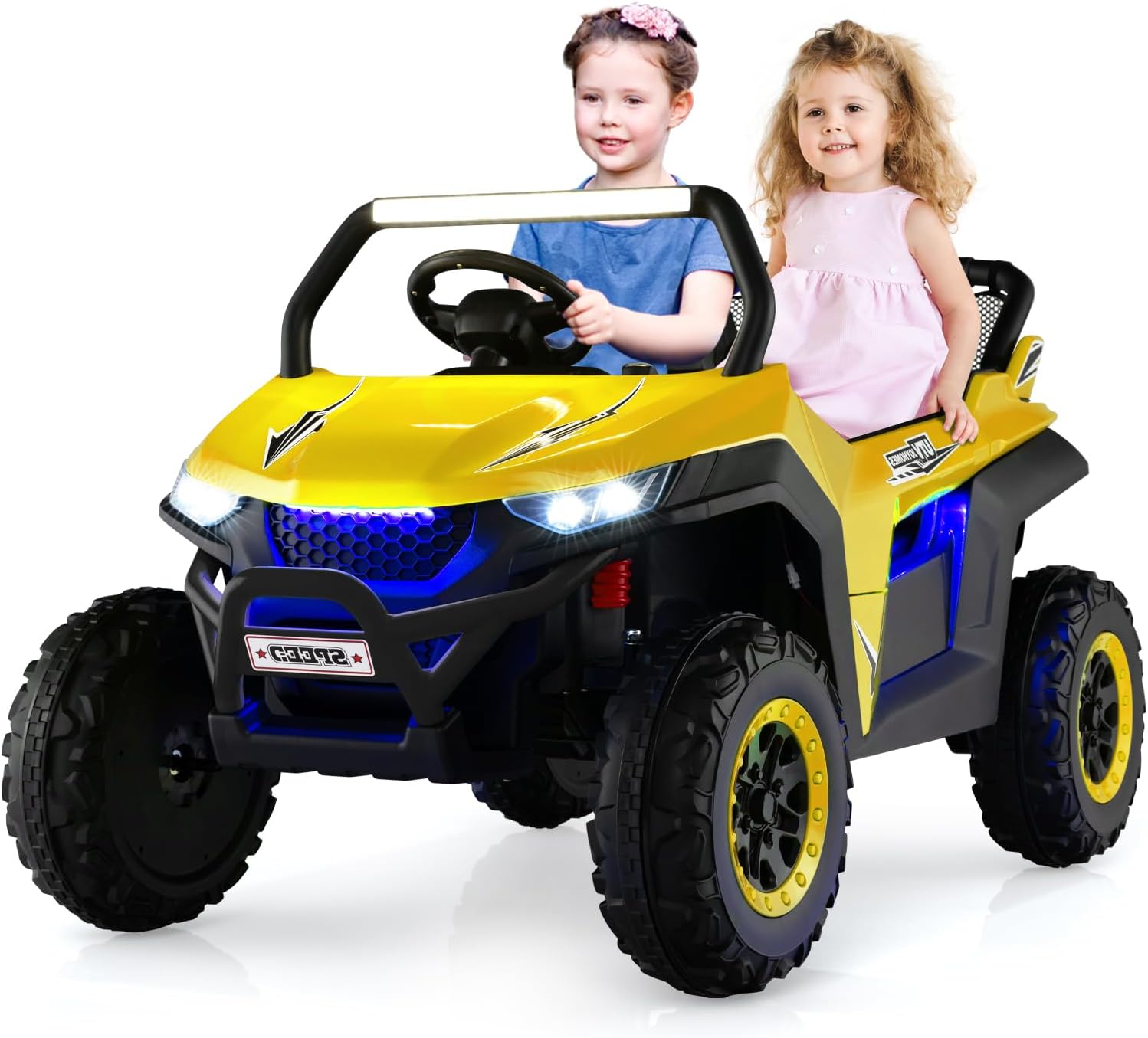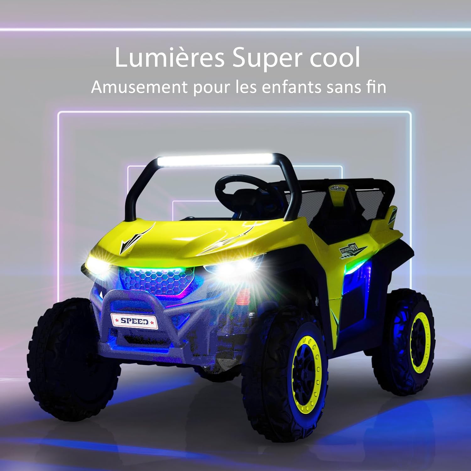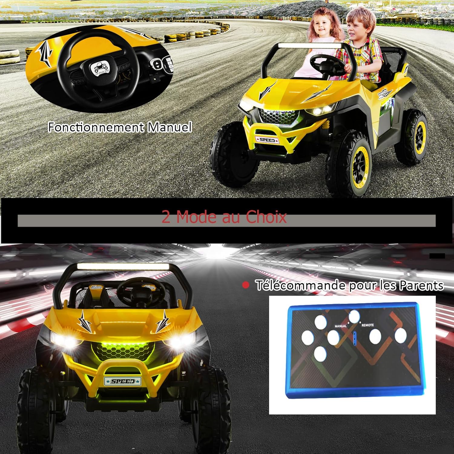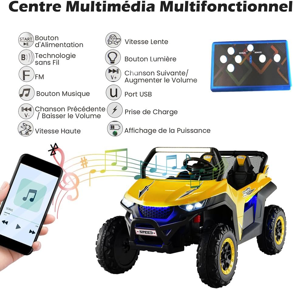 *Sicurezza Garantita* Adatta a 2 bambini con una capacità di carico di 59 kg, questa macchina elettrica per bambini 2 posti è dotata di cinture di sicurezza a 3 punti per ogni sedile e porte bloccabili, garantendo la massima sicurezza per i vostri piccoli. *Esperienza di Guida Realistica* Il quad elettrico per bambini offre un'avvio a tocco, due velocità (alta/bassa), marcia avanti/indietro, volante flessibile, clacson e fari luminosi. Questa macchina elettrica bambini 3-8 anni regala un'esperienza di guida divertente e realistica. *Tranquillità per i Genitori* La macchina elettrica per bambini include un telecomando 2,4G (pile non incluse) per il controllo a distanza di velocità e direzione, permettendo ai bambini di divertirsi in totale sicurezza sotto la supervisione degli adulti. *Divertimento Multifunzionale* Con un'autonomia fino a 2 ore, questa auto elettrica per bambini 2 posti è equipaggiata con lettore MP3, porta USB, connessione wireless e radio, offrendo diverse opzioni audio per intrattenere i piccoli. *Adatta a Tutti i Terreni* Grazie alle ruote larghe con texture antiscivolo e alle sospensioni a 4 ruote, questa macchina bambini elettrica assicura una guida fluida e stabile, garantendo comfort e durata nel tempo.