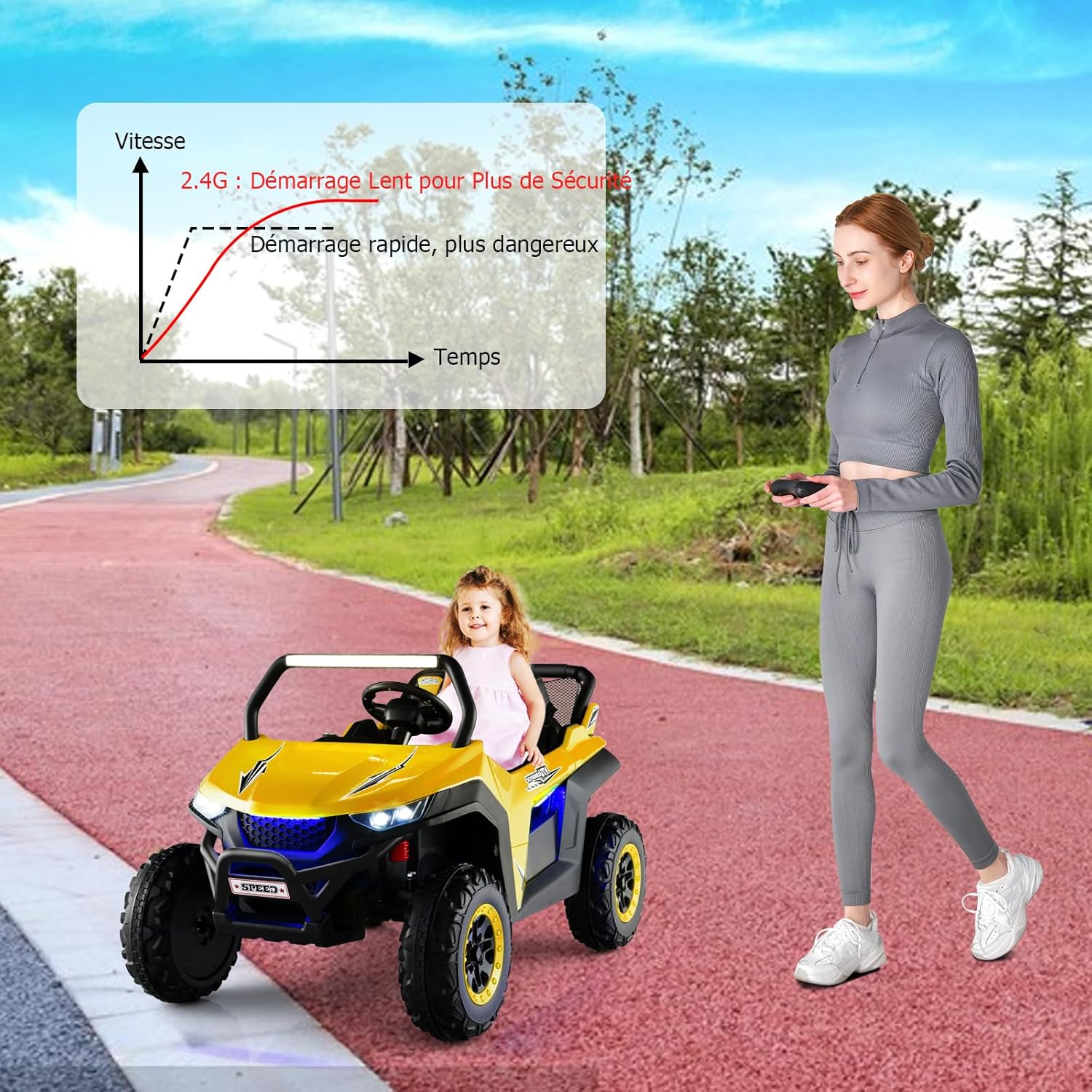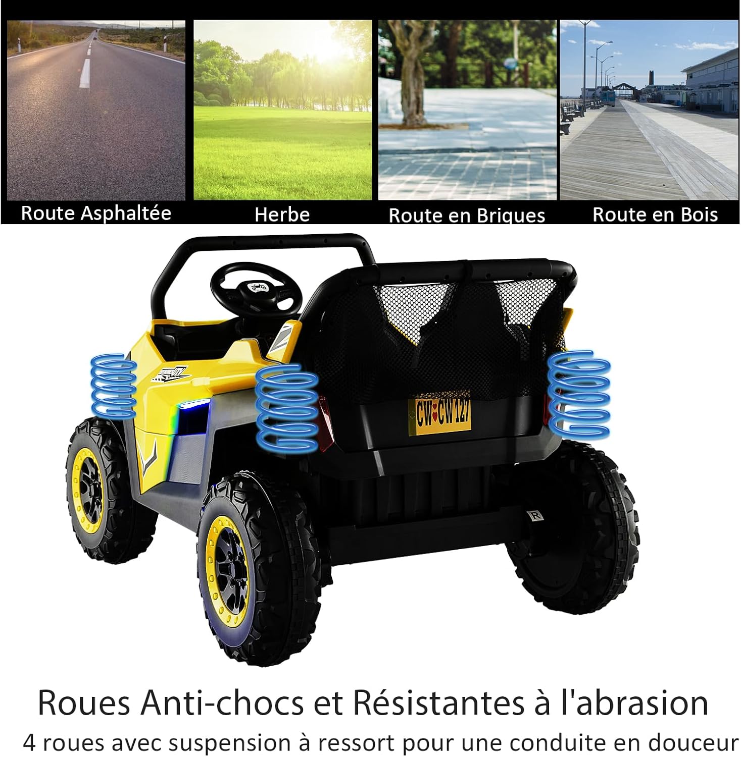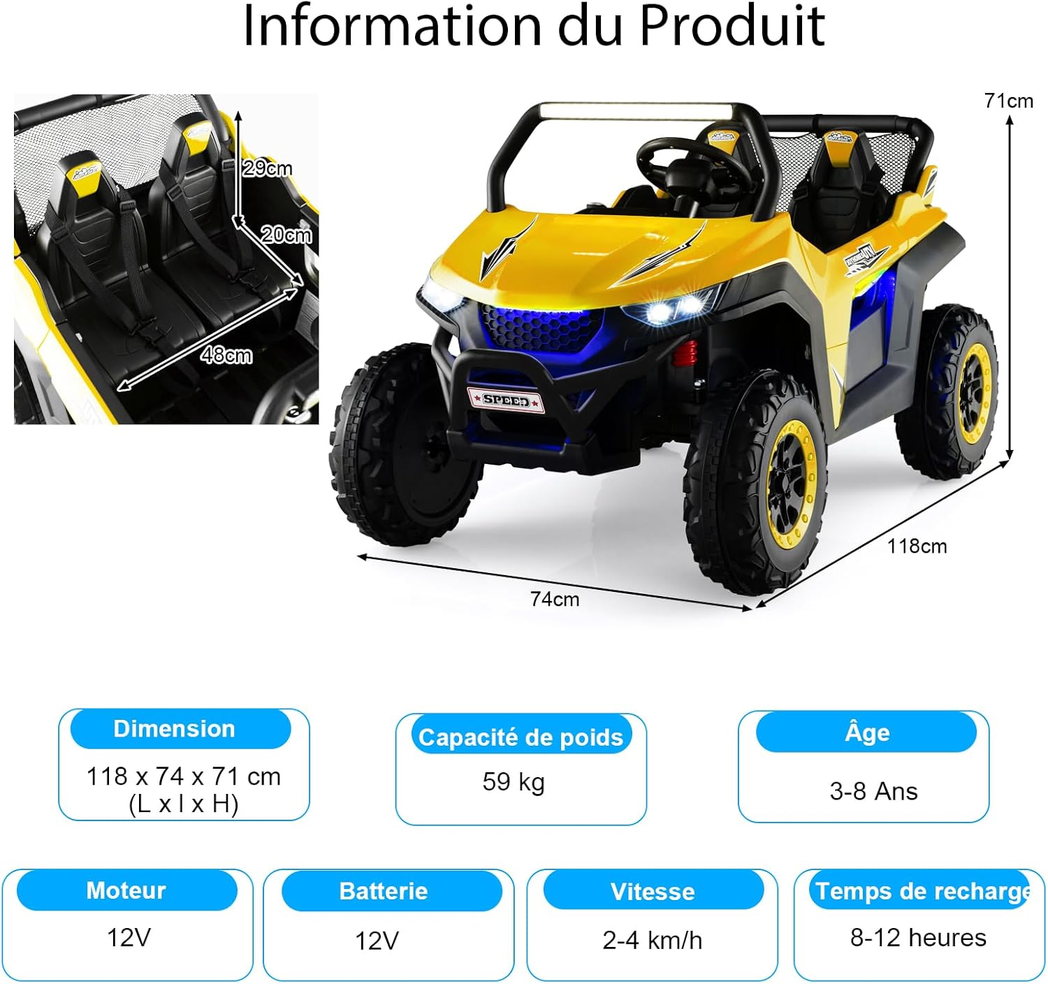 *Sicurezza Garantita* Adatta a 2 bambini con una capacità di carico di 59 kg, questa macchina elettrica per bambini 2 posti è dotata di cinture di sicurezza a 3 punti per ogni sedile e porte bloccabili, garantendo la massima sicurezza per i vostri piccoli. *Esperienza di Guida Realistica* Il quad elettrico per bambini offre un'avvio a tocco, due velocità (alta/bassa), marcia avanti/indietro, volante flessibile, clacson e fari luminosi. Questa macchina elettrica bambini 3-8 anni regala un'esperienza di guida divertente e realistica. *Tranquillità per i Genitori* La macchina elettrica per bambini include un telecomando 2,4G (pile non incluse) per il controllo a distanza di velocità e direzione, permettendo ai bambini di divertirsi in totale sicurezza sotto la supervisione degli adulti. *Divertimento Multifunzionale* Con un'autonomia fino a 2 ore, questa auto elettrica per bambini 2 posti è equipaggiata con lettore MP3, porta USB, connessione wireless e radio, offrendo diverse opzioni audio per intrattenere i piccoli. *Adatta a Tutti i Terreni* Grazie alle ruote larghe con texture antiscivolo e alle sospensioni a 4 ruote, questa macchina bambini elettrica assicura una guida fluida e stabile, garantendo comfort e durata nel tempo.