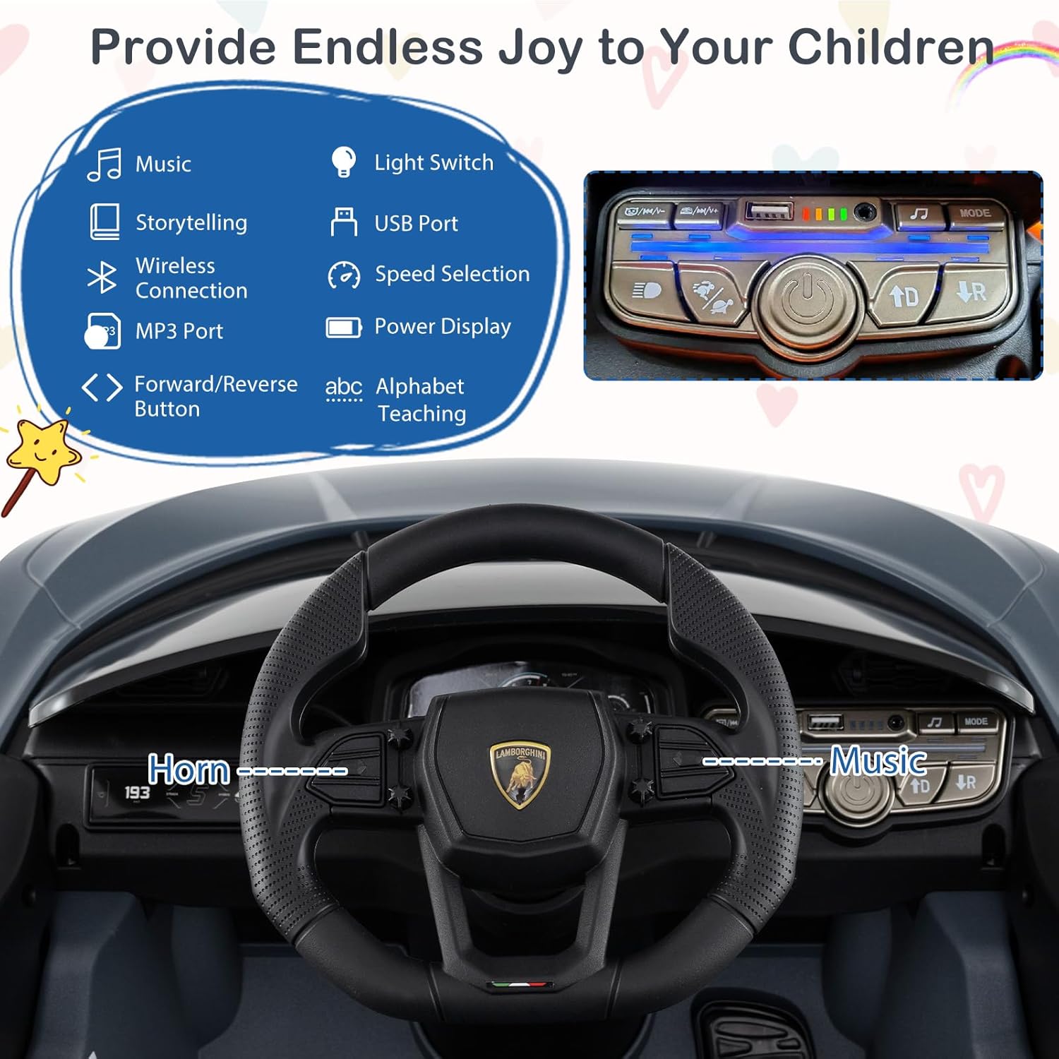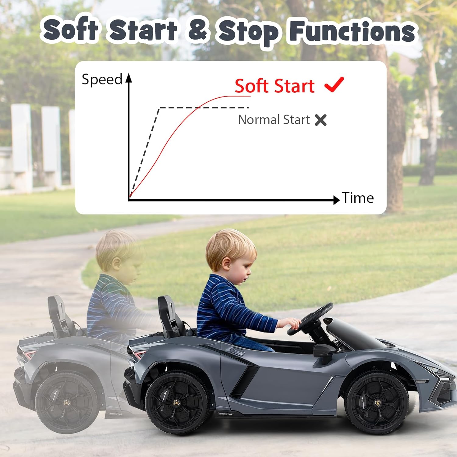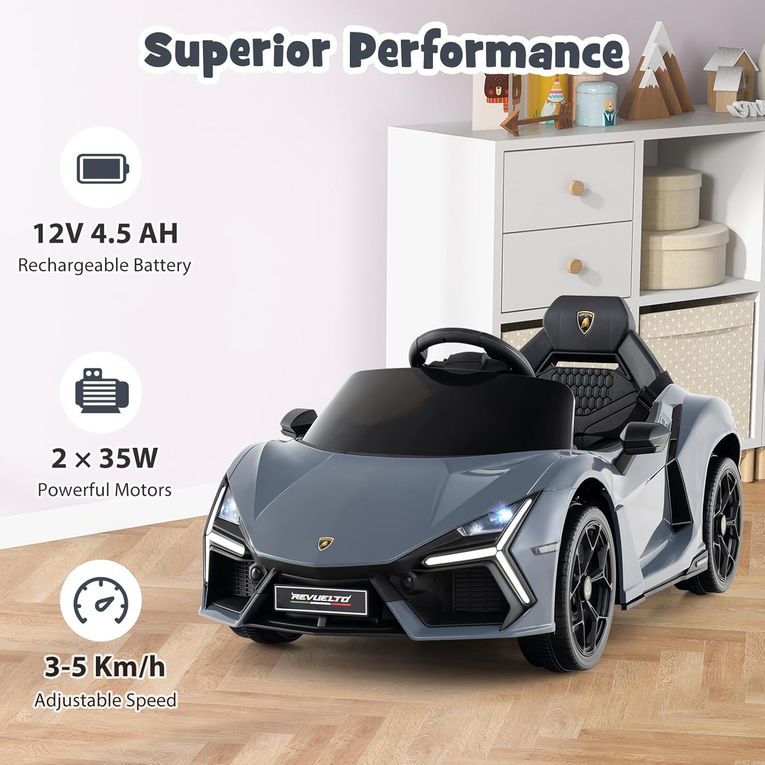 🚗*Autorizzazione Ufficiale Lamborghini Revuelto* Inizia il viaggio del tuo piccolo nel mondo delle auto classiche con questa macchina elettrica autorizzata! Riproduce fedelmente il design iconico della Lamborghini Revuelto, con ogni dettaglio che ricrea l'essenza della leggenda sportiva Lamborghini. Non è solo un giocattolo, ma il primo passo per trasmettere la passione per le icone automobilistiche che durerà tutta la vita. 🎮*2 Modalità di Guida per Genitori-Bambino* Questo veicolo elettrico per bambini con batteria da 12 V 4,5 Ah, offre 2 modalità di controllo: in modalità autonoma, il bambino guida lui stesso la macchina grazie al pedale, mentre la modalità a telecomando permette ai genitori di prendere il controllo a distanza. Questo sistema brevettato favorisce le interazioni familiali durante i giochi educativi. Velocità: 3-5 km/h. 💎*Sicurezza Garantita per il Tuo Bambino* Questa auto elettrica per bambini utilizza materiali ad alta resistenza ed è prevista la cinture di sicurezza a 3 punti. Il sistema di avviamento progressivo limita automaticamente la velocità, evitando qualsiasi un avvio brusco. Le ruote antiscivolo offrono un'aderenza ottimale su diverse superfici come mattoni, cemento, assi di legno, ecc. 💖*Divertimento Multimediale con Stimolo Creativo* L’auto elettrica per bambini è dotato di un centro multimediale polivalente: modalità storie e modalità musicale. Il portatile USB e l'ingresso MP3 integrati permettono ai genitori di personalizzare i contenuti. Un clacson realistico e un quadro strumenti ricreano l'esperienza di guida di una vera macchina, stimulando l'immaginazione del bambino. 💝*Buon Regalo per Momenti Preziosi* La macchina elettrica per bambini è progettata appositamente per i bambini dai 3 agli 8 anni, con dimensioni adattate alla loro morfologia. La struttura supporta una carica massima di 25 kg. È un ottimo regalo di compleanno o di Natale apprezzato da bambini e bambine, portando gioia e lasciando un'impronta tenera nella loro crescita.