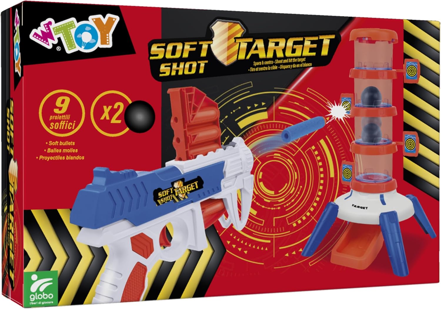 Divertente playset con torretta bersaglio e pistola spara proiettili in gomma Colpisci i 4 bersagli posizionati sulla torretta e fai scendere la pallina verso il fondo Vince il giocatore che per prima fa scendere la pallina a terra Inclusi 9 proiettili di gomma morbida e 2 palline Gioco divertente e stimolante da giocare con gli amici e in famiglia