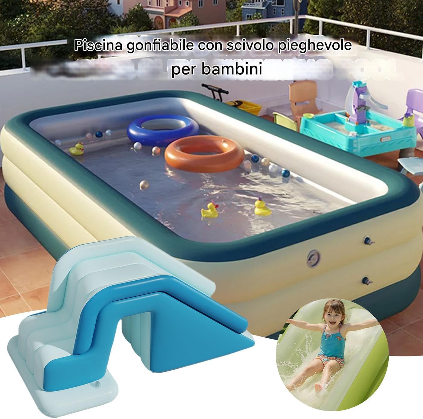 Flessibilità multiscenica: Soluzione ideale per ambienti diversificati, unisce adattabilità indoor/outdoor a design versatile garantendo intrattenimento continuo come parte dinamica di aree acquatiche Rinforzo PVC Multistrato: Costruito con rinforzo in PVC multistrato e base antiscivolo, offre maggiore sicurezza e resistenza grazie al meccanismo di distribuzione della pressione per un divertimento duraturo. Esperienza Familiare: Scivolo gonfiabile con vivaci colori e decorazioni a onde stimolanti, garantisce divertimento interattivo creando opportunità per momenti di complicità genitori-figli durante il gioco all'aperto Dimensioni Compatte: Lo scivolo gonfiabile presenta un design pieghevole con funzionalità di sgonfiaggio rapido, assicurando immagazzinamento e trasporto senza sforzo nella borsa da trasporto compatta inclusa, rendendolo ideale per uso esterno e interno e migliorando portabilità e praticità per gli utenti. Bordi confortevoli: Realizzato con bordi anti-scheggia e una finitura liscia a 360, questo scivolo gonfiabile priorizza la sicurezza tattile, assicurando compatibilità anche con la pelle più delicata