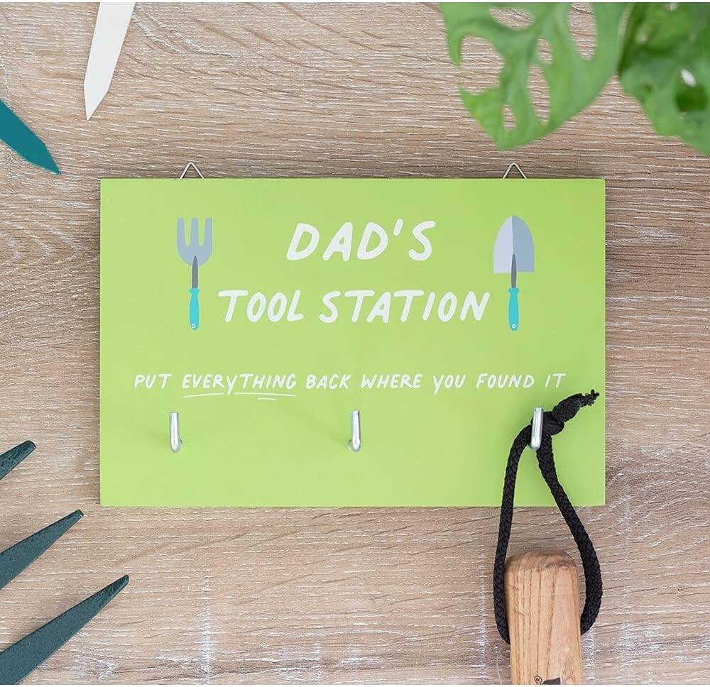 La confezione include: gancio da parete per stazione degli attrezzi di papà, 1 pezzo. 180 g Design impressionante: questo gancio da appendere con un design impressionante rende il luogo perfetto per i papà per appendere le loro necessità di capannone degli attrezzi. Da usare ovunque: questo gancio da parete è il luogo perfetto per i papà per appendere guanti da giardino, metro a nastro, grembiuli e altri strumenti. Materiale: questo gancio da parete è realizzato in MDF che garantisce la durata del materiale e la qualità di lunga durata. Pratico gancio: tieni tutti i tuoi oggetti organizzati e facilmente accessibili con questo pratico gancio che è facilmente montato alla parete del tuo capannone con ganci posteriori.