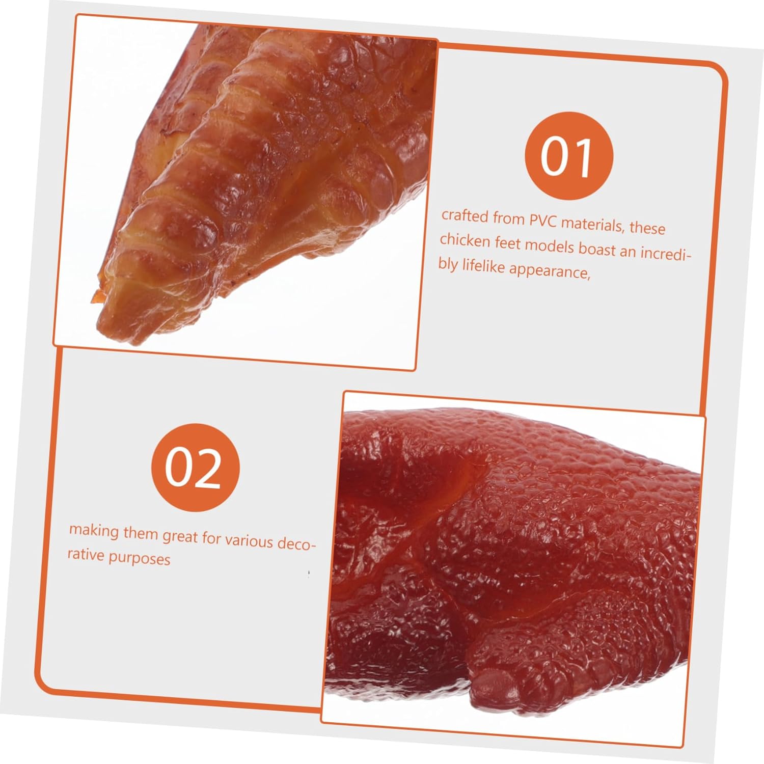Cattura l'attenzione: questi modelli realistici di zampe di pollo possono essere utilizzati per migliorare la presentazione dei piatti, attirando l'attenzione dei clienti e aumentando l'attrattiva del tuo cibo, zampe di pollo finte realistiche, centrotavola di zampe di pollo per tavoli Design raffinato: queste zampe di pollo finte sono progettate per durare, garantendo che rimangano in condizioni eccellenti nel tempo, decorazioni per feste a forma di zampe di pollo, oggetti di scena per foto a forma di zampe di pollo Uso versatile: ideali per l'impiattamento di cibi e l'arredamento di hotel, questi piedi di pollo simulati possono anche servire come oggetti di scena fotografici unici, migliorando l'attrattiva visiva in qualsiasi , decorazione di modelli di piedi di pollo, decorazione da tavola Decorazione accattivante: usa questi modelli realistici di zampe di pollo per migliorare la presentazione dei tuoi piatti, attirando l'attenzione dei clienti e aumentandone l'attrattiva, bomboniere a forma di zampe di pollo, giocattolo a forma di zampe di pollo Decorazione versatile: adatta per uso commerciale che domestico, questi modelli di zampe di pollo aggiungono un tocco unico a qualsiasi , simulazione di zampe di pollo, di zampe di pollo decorativo
