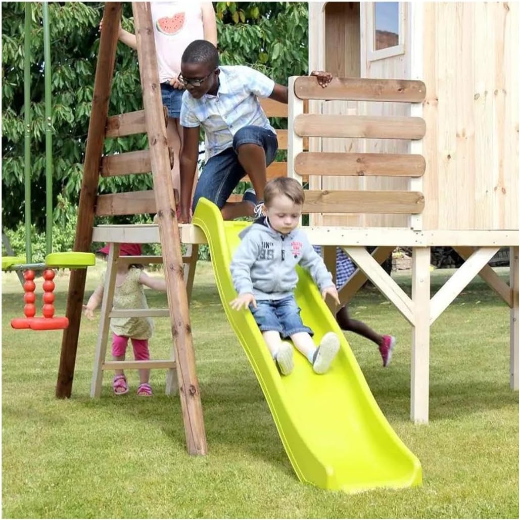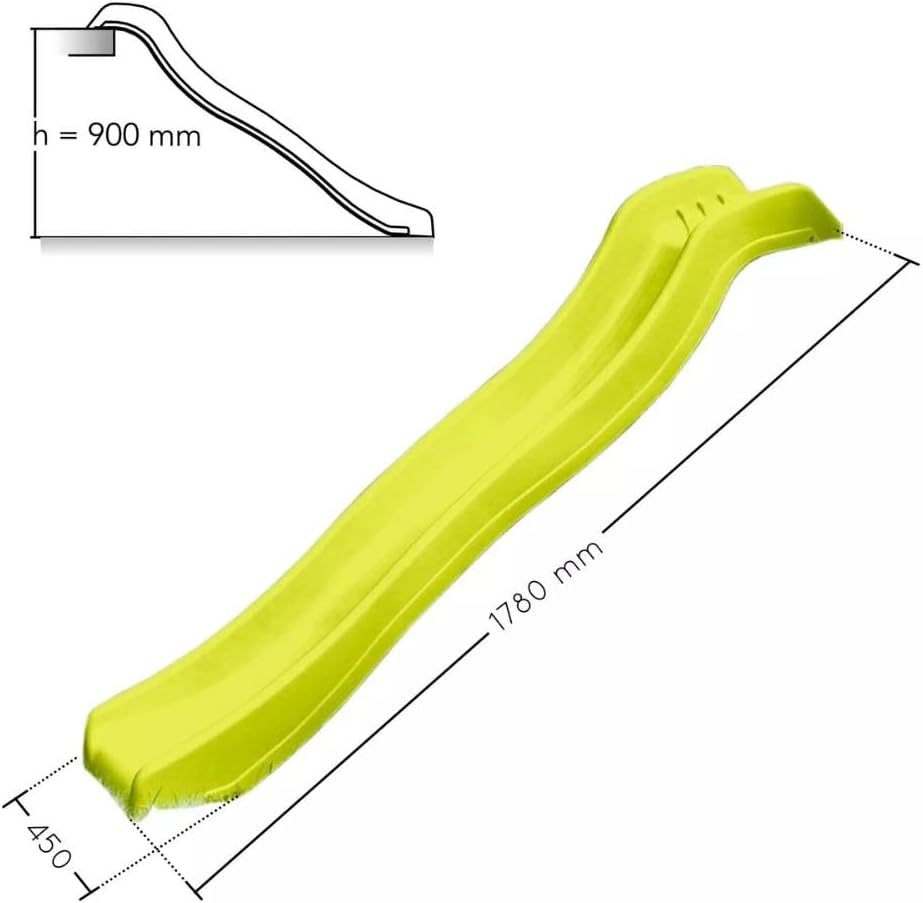 Con questo scivolo a doppia onda. Per casette e parchi giochi. Colore verde oliva, altezza punto di partenza 0,80 m/0,90 m, lunghezza canna da 1,76 m.