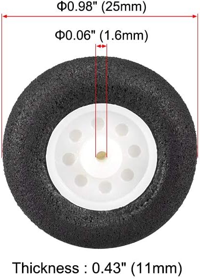 [SPECIFICHE] - Diametro esterno: 0,98" (25 mm); Spessore: 0,43" (11 mm); Diametro del foro dell'asse: 0,06" (1,6 mm). [APPLICAZIONE] - Compatibile con modelli RC fai-da-te, come giocattoli di aeroplani RC, elicotteri RC, macchinine, ecc. [VANTAGGIO] - Pneumatici in spugna neri lisci preassemblati. Queste ruote di aeromodelli RC conferiscono al tuo modello un aspetto sportivo. Sono progettate pensando ai modelli elettrici. [NOTA] - Nota: le riprese di luce e display diversi possono far sì che il colore dell'oggetto sull'immagine sia leggermente diverso dal colore reale. [PACCHETTO INCLUSO] - 2 ruote per aereo RC da 0,98 pollici di diametro.
