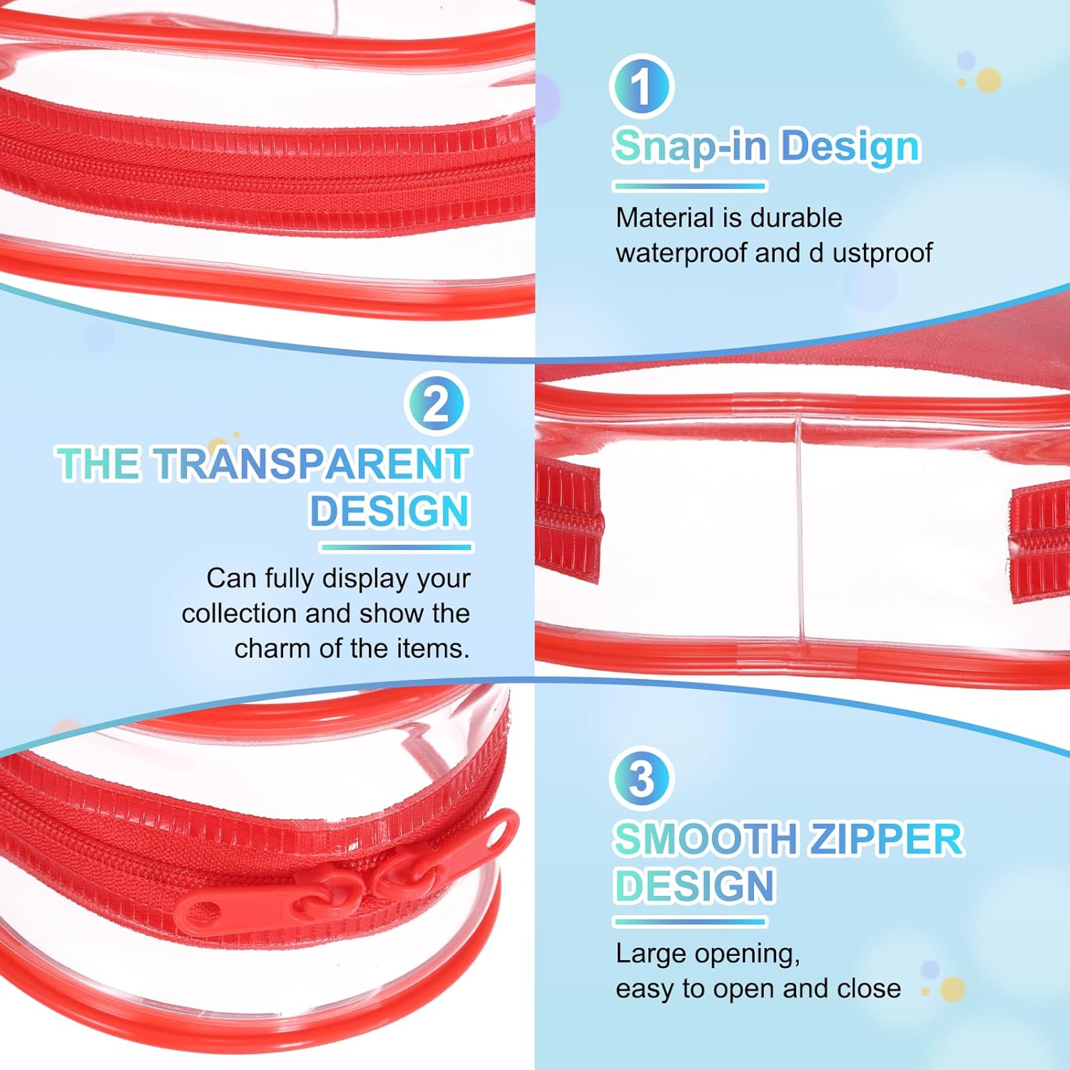 Descrizione: Materiale: la borsa portatile per mini bambole è realizzata in PVC trasparente, durevole, impermeabile, resistente ai graffi e agli strappi, fornendo una visione chiara dei tuoi oggetti da collezione proteggendoli da polvere e sporco. Caratteristica: la vetrina per figure cieche è progettata per proteggere e mostrare i tuoi beni preziosi. Il suo design trasparente consente una visione completa dei tuoi oggetti da collezione, rendendolo una vetrina attraente. Puoi anche fai da te queste borse come portachiavi e appenderle allo zaino o alla borsa, aggiungendo un tocco di divertimento e personalizzazione. Facile da usare: la custodia per mini bambole è progettata pensando alla comodità dell'utente. La sua cerniera liscia consente un accesso rapido e facile ai tuoi oggetti da collezione. Basta appendere la borsa utilizzando l'anello di metallo o portarla a mano. La natura leggera e portatile di queste borse significa che puoi portarle con te ovunque tu vada, assicurando che le tue figure siano sempre in mostra. Ampia applicazione: la borsa trasparente è adatta per una vasta gamma di piccoli oggetti da collezione, tra cui figure cieche, mini bambole, lavori in feltro ad ago e action figure. Serve come soluzione protettiva e decorativa, adatta per i collezionisti che vogliono mostrare i propri oggetti. Puoi anche appenderli come decorazioni per aggiungere un tocco unico al tuo spazio. Specifiche tecniche: Colore: Rosso Materiale: PVC. Lunghezza: 9 cm. Larghezza: 6 cm. Altezza: 15,5 cm. Contenuto Confezione: 2 Pz x Chiaro Figura Display Borsa