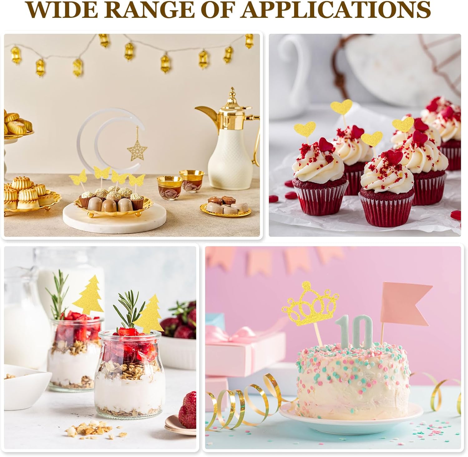 Questi topper per cupcake sono perfetti per tutti i tipi di feste a tema, tra cui feste di compleanno, feste, anniversari di matrimonio e altre occasioni speciali. Possono essere utilizzati per decorare cupcake, gelati, frutta, biscotti e altri dessert, aggiungendo un tocco di fascino e creatività alla tua festa. La confezione contiene 48 bastoncini glitterati per cupcake; materiale: carta; colore: oro; dimensioni motivo: 4,5 x 6 cm (lunghezza x larghezza); lunghezza del bastoncino di carta: 15 cm Realizzati in cartoncino resistente e spesso, questi topper per cupcake non sono facili da deformare o sbiadire, e il retro è saldamente incollato con punti di colla per un uso a lungo termine. Il glitter sulla carta non è facile da cadere, il che può garantire una lucentezza a lungo termine e rendere la decorazione del dessert più bella. Questi plettri glitterati per cupcake non richiedono alcun assemblaggio aggiuntivo, basta inserirli in cupcake o altri dessert e sono pronti per l'uso. Puoi anche usarli per decorare altri alimenti per aggiungere un'atmosfera festosa al tuo dessert. Si prega di notare che questi topper per cupcake sono solo a scopo decorativo. Si prega di conservarli in un luogo asciutto per garantire un uso a lungo termine.