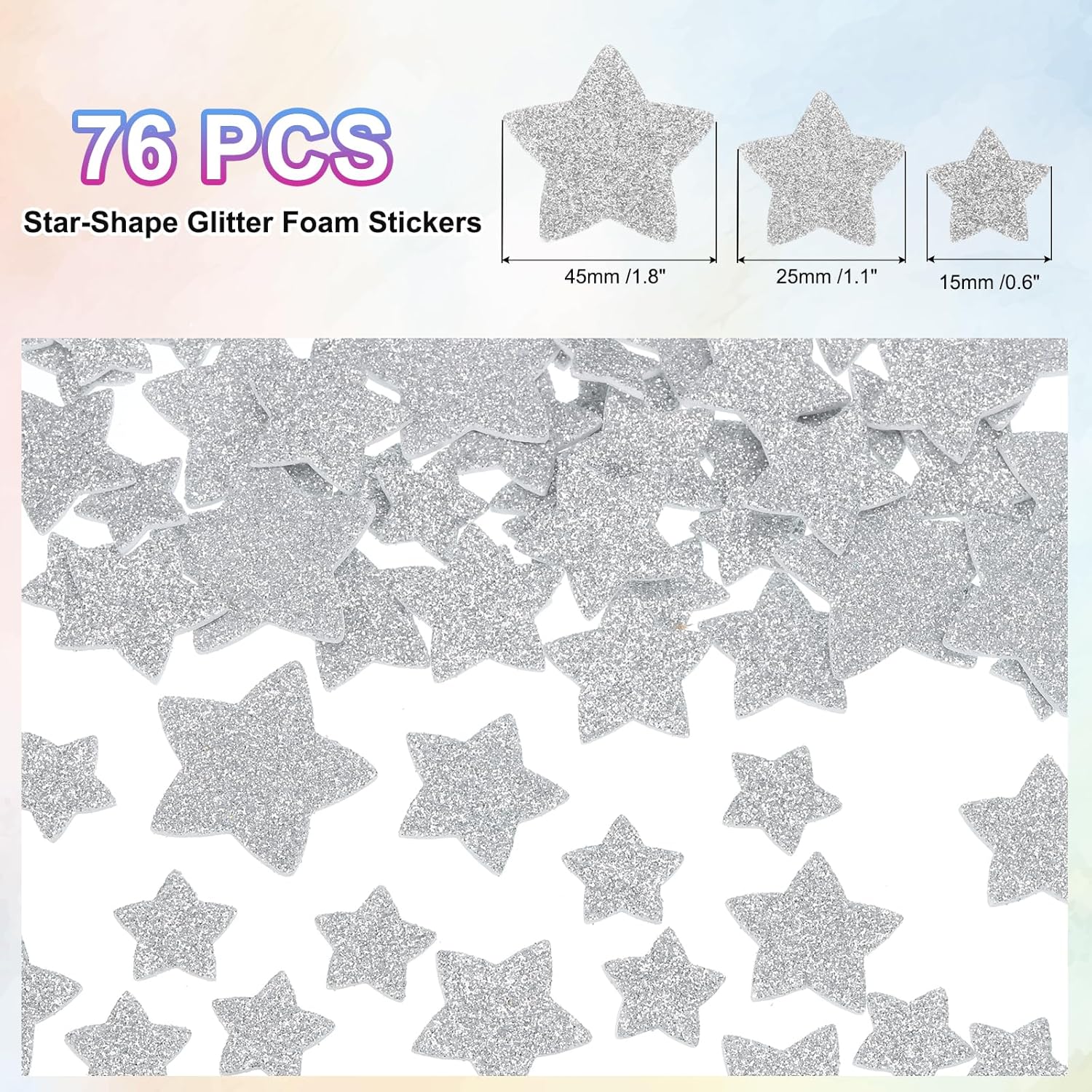 Gli adesivi in schiuma glitterata di dimensioni miste presentano bellissimi disegni a stella con effetti visivi scintillanti e la trama tridimensionale della schiuma, ogni adesivo in schiuma è scintillante e perfetto per poster, album di ritagli, biglietti di auguri e decorazioni per feste. Gli adesivi in schiuma colorata sono perfetti per biglietti di auguri, progetti di bricolage, decorazioni per la classe e la casa, telefoni, lavori manuali e altro ancora. Colore: argento; dimensione totale: 15 x 15 mm; 25x25 mm; 45 x 45 / 4,6 x 4,6 cm; forma: materiali in schiuma PVC e EVA a stella, morbidi al tatto. Gli adesivi in schiuma glitterata hanno un significativo effetto tridimensionale, che aumenta l'interesse della stratificazione e della decorazione. Questi adesivi artigianali in schiuma sono realizzati con materiali di buona qualità e la superficie è ricoperta da un sottile strato di glitter, che non solo è morbido al tatto, ma anche durevole nella lucentezza e non facile da staccare. Questi cuori in schiuma sono realizzati in materiale EVA con forte adesione, durevole e riutilizzabile, morbido per l'artigianato, leggero e autoadesivo, puoi attaccarli ovunque tu voglia. Prima di incollare, assicurarsi che la superficie da incollare sia pulita e piatta per migliorare l'effetto appiccicoso. La superficie è ricoperta di polvere di cipolla dorata, che è una polvere dorata scintillante. Potrebbe perdere parzialmente polvere, il che è un fenomeno normale e non ne pregiudica l'aspetto e l'utilizzo.