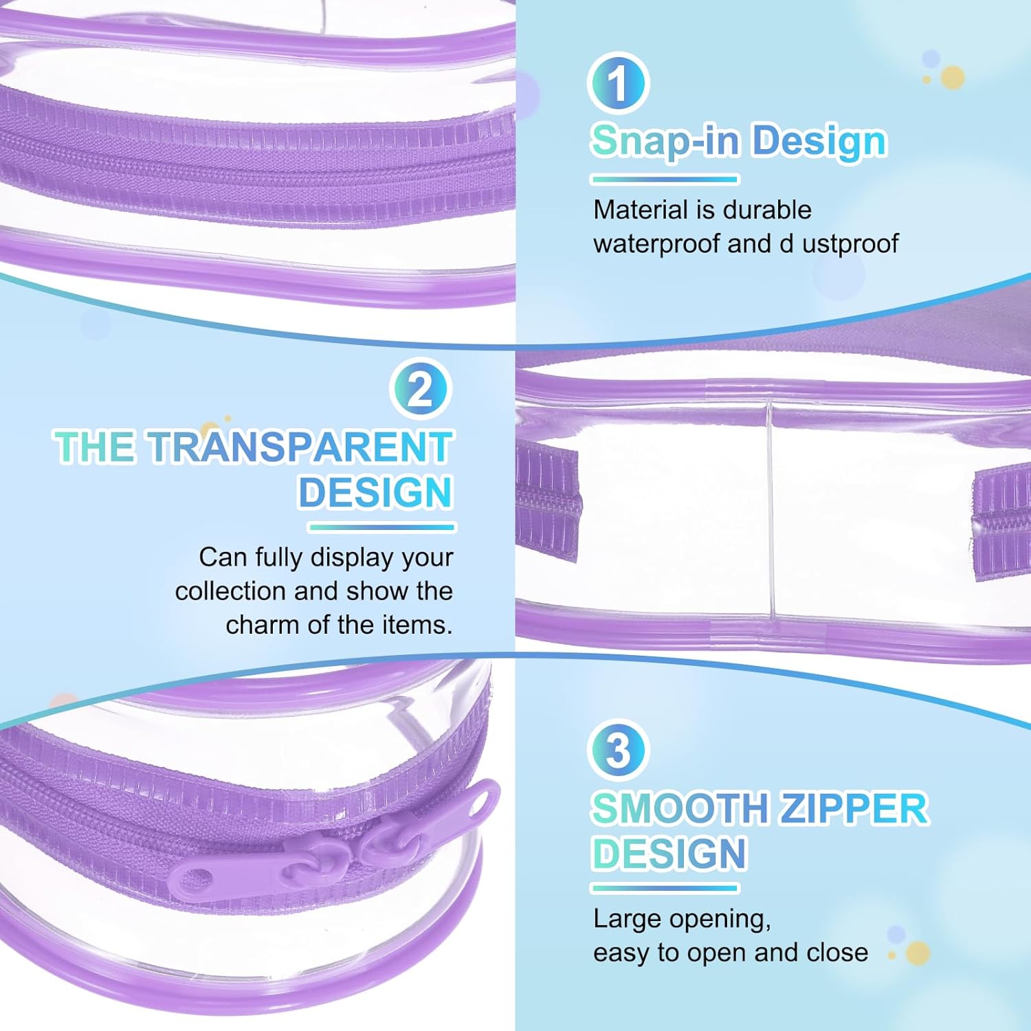 Descrizione: Materiale: la borsa portatile per mini bambole è realizzata in PVC trasparente, durevole, impermeabile, resistente ai graffi e agli strappi, fornendo una visione chiara dei tuoi oggetti da collezione proteggendoli da polvere e sporco. Caratteristica: la vetrina per figure cieche con corda è progettata per proteggere e mostrare i tuoi beni preziosi, rendendo meno probabile che venga perso. Il suo design trasparente consente una visione completa dei tuoi oggetti da collezione, rendendolo una vetrina attraente. Puoi anche fai da te queste borse come portachiavi e appenderle allo zaino o alla borsa, aggiungendo un tocco di divertimento e personalizzazione. Facile da usare: la custodia per mini bambole è progettata pensando alla comodità dell'utente. La sua cerniera liscia consente un accesso rapido e facile ai tuoi oggetti da collezione. Basta appendere la borsa utilizzando l'anello di metallo o portarla a mano. La natura leggera e portatile di queste borse significa che puoi portarle con te ovunque tu vada, assicurando che le tue figure siano sempre in mostra. Ampia applicazione: la borsa trasparente è adatta per una vasta gamma di piccoli oggetti da collezione, tra cui figure cieche, mini bambole, lavori in feltro ad ago e action figure. Serve come soluzione protettiva e decorativa, adatta per i collezionisti che vogliono mostrare i propri oggetti. Puoi anche appenderli come decorazioni per aggiungere un tocco unico al tuo spazio. Specifiche tecniche: Colore: Viola Materiale: PVC. Lunghezza: 9 cm. Larghezza: 6 cm. Altezza: 15,5 cm. Contenuto Confezione: 1 Pz x Chiaro Figura Display Borsa con Corda