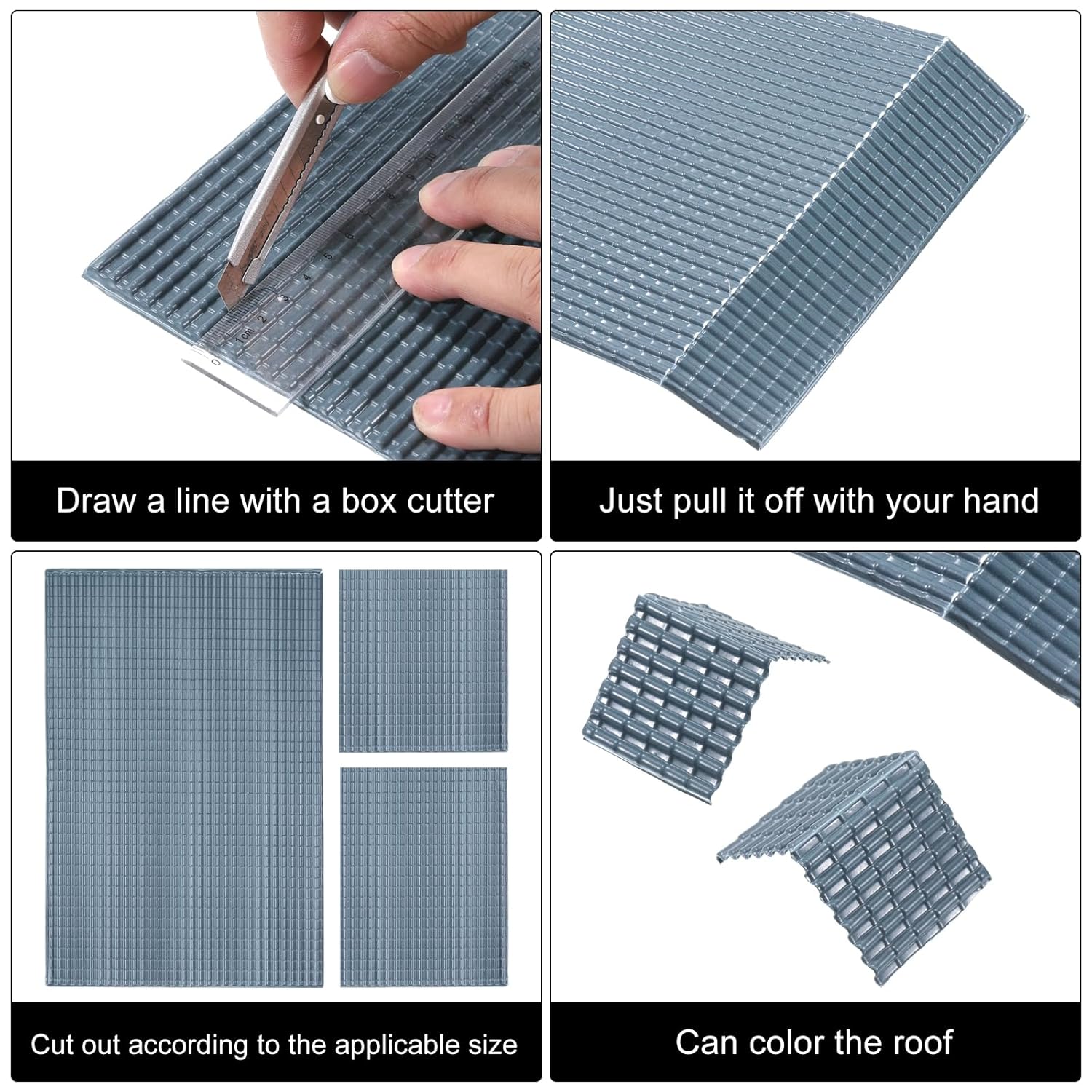 Le tegole in miniatura sono adatte a tutti i tipi di modellazione generale, possono essere utilizzate anche in scene sandbox, accessori da costruzione, case per animali domestici, modelli di design o modelli ferroviari. Accessori per micro piastrelle paesaggistiche, dimensioni: lunghezza x larghezza: 29,5 cm x 19,5 cm; colore: grigio scuro; materiale: PVC; piastrelle in scala: 1/50; la confezione include: 4 fogli x mini modello di tegole È realizzato in materiale PVC, stente all'usura, non sbiadisce facilmente e può essere utilizzato a lungo. La trama delle piastrelle è chiara e molto realistica, aiutandoti a creare paesaggi più naturali fai da te. È possibile tagliare le dimensioni in base alle proprie esigenze. Nota: a causa di problemi di illuminazione meteorologica durante le riprese, ci sono alcune differenze di colore, è un fenomeno normale!