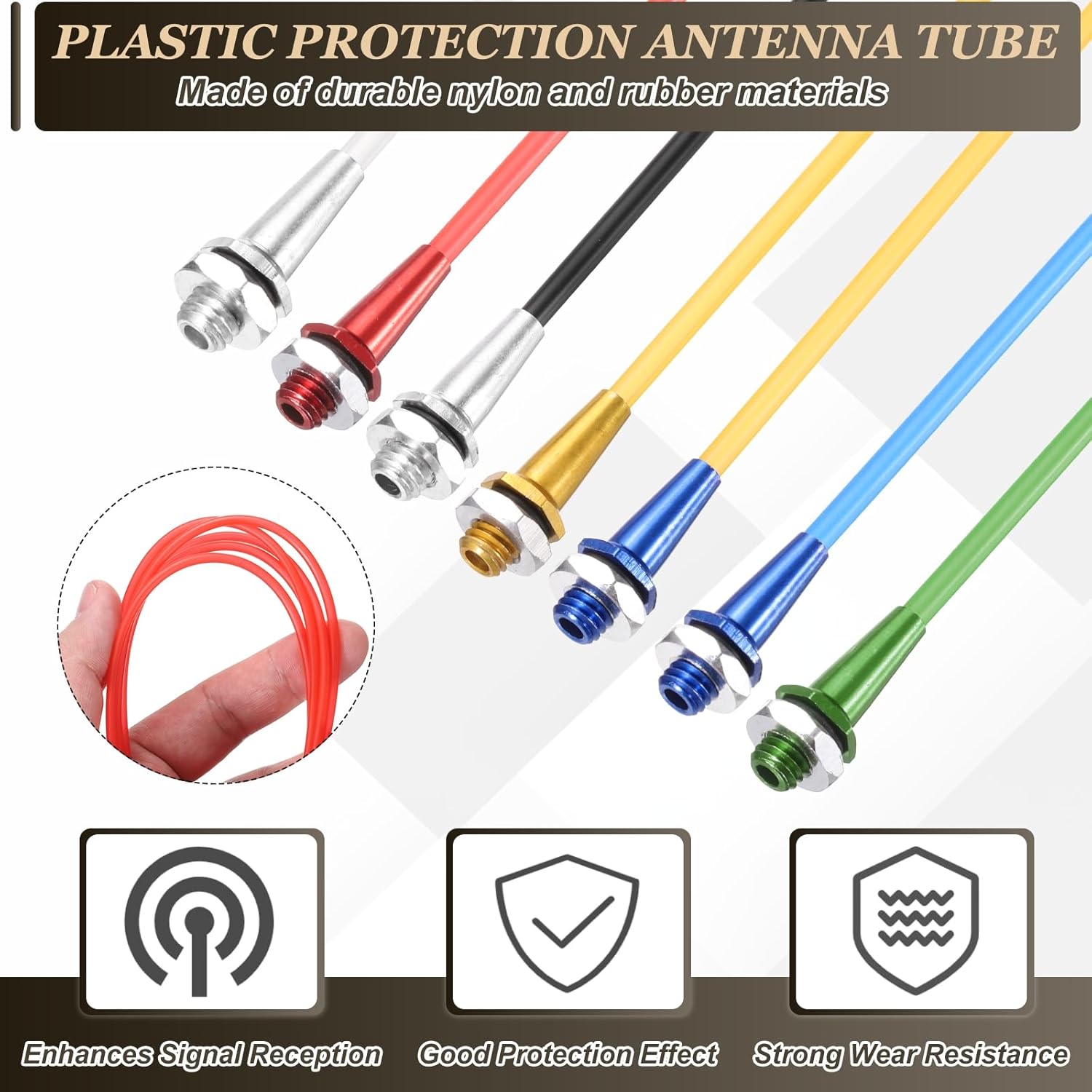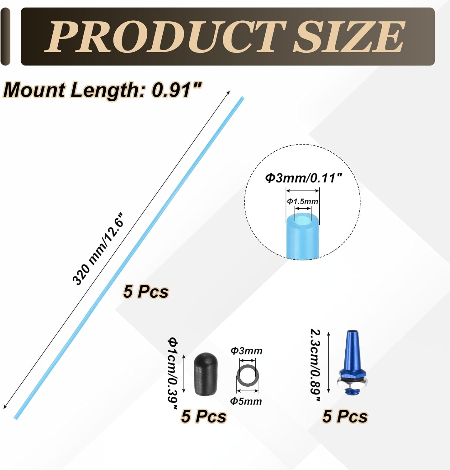 Specifica: Colore: Blu; Materiale: Nylon, Gomma, lega di alluminio; Lunghezza del tubo: 320 mm/12,6 pollici; Diametro esterno: 3mm/0,11 pollici; Diametro interno: 1,5 millimetri / 0,05 pollici; Monte Lunghezza: 2,3 cm; 5 x Plastica Protezione Antenna Tubo, 5 x Mount Questo tubo antenna di protezione in plastica viene utilizzato per ricevere antenne per garantire la trasmissione del segnale. Ampiamente usato, il diametro interno di 1,5 mm si adatta alla maggior parte delle antenne ricevitore telecomando standard, adatto per modelli RC, auto telecomandate e barche. Far scorrere l'antenna nel tubo, posizionare l'antenna nella migliore angolazione e assicurarsi che sia installata saldamente. Nota: si prega di prestare attenzione alle dimensioni prima di ordinare. Materiale durevole: realizzato in gomma di nylon e materiale in lega di alluminio, è durevole, resistente all'usura e leggero, garantendo un utilizzo a lungo termine. Ottimizzazione del segnale: questa copertura di protezione dell'antenna ha un buon supporto e aiuta a fissare l'antenna del ricevitore all'angolazione corretta per il miglior segnale. Effetto protettivo: questo tubo di plastica dell'antenna di protezione può proteggere l'antenna ricevente da urti dell'elica, collisione e usura ambientale, prolungandone la durata.