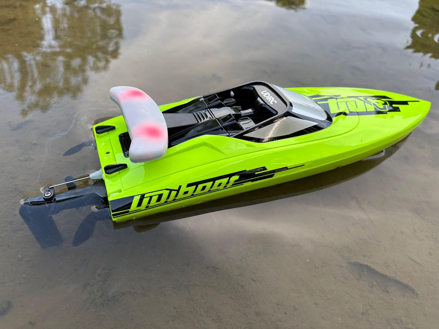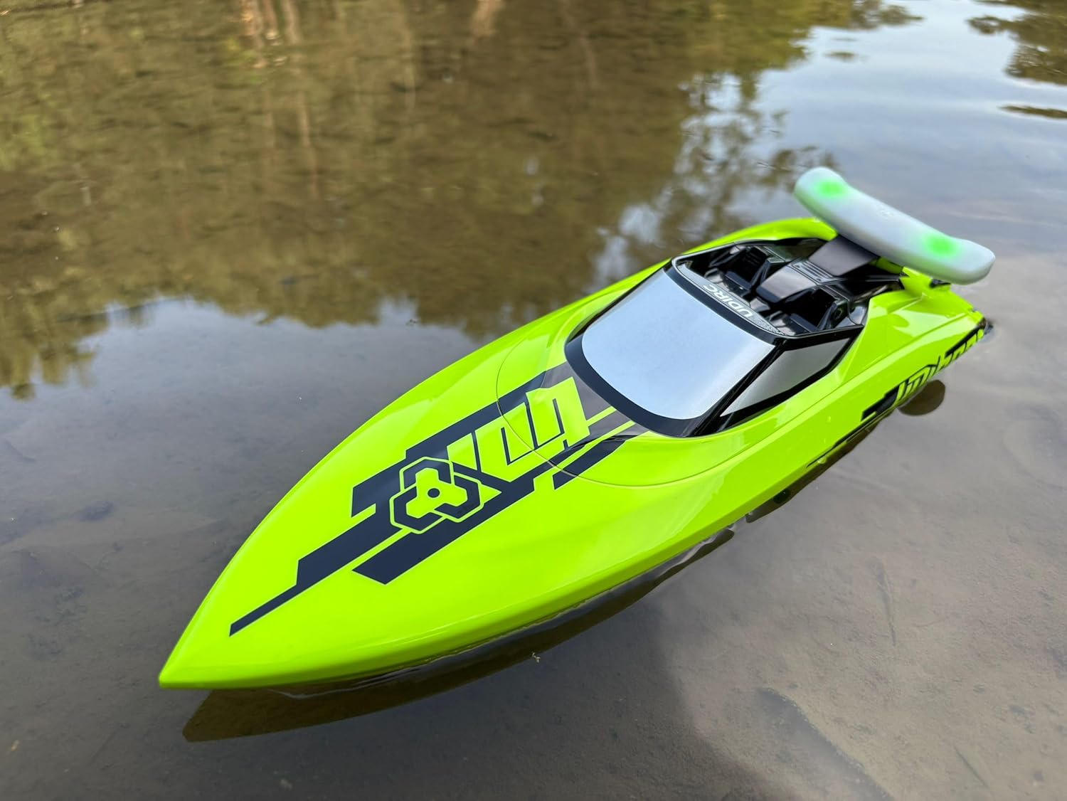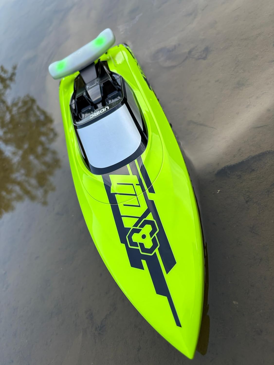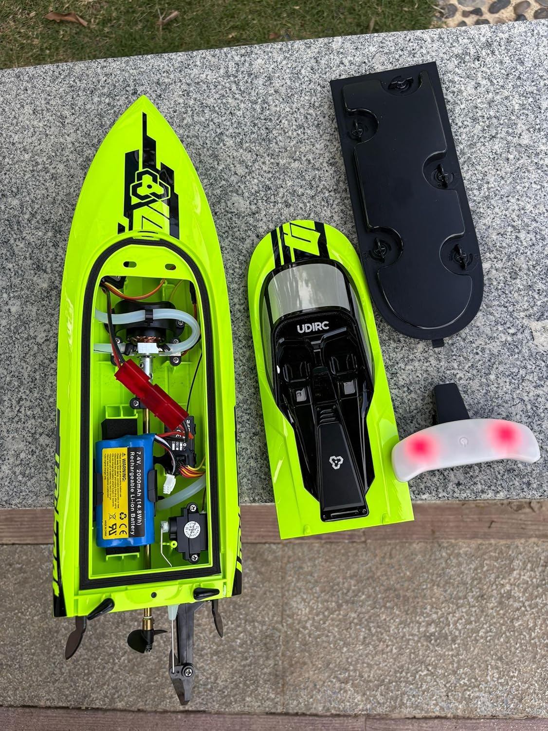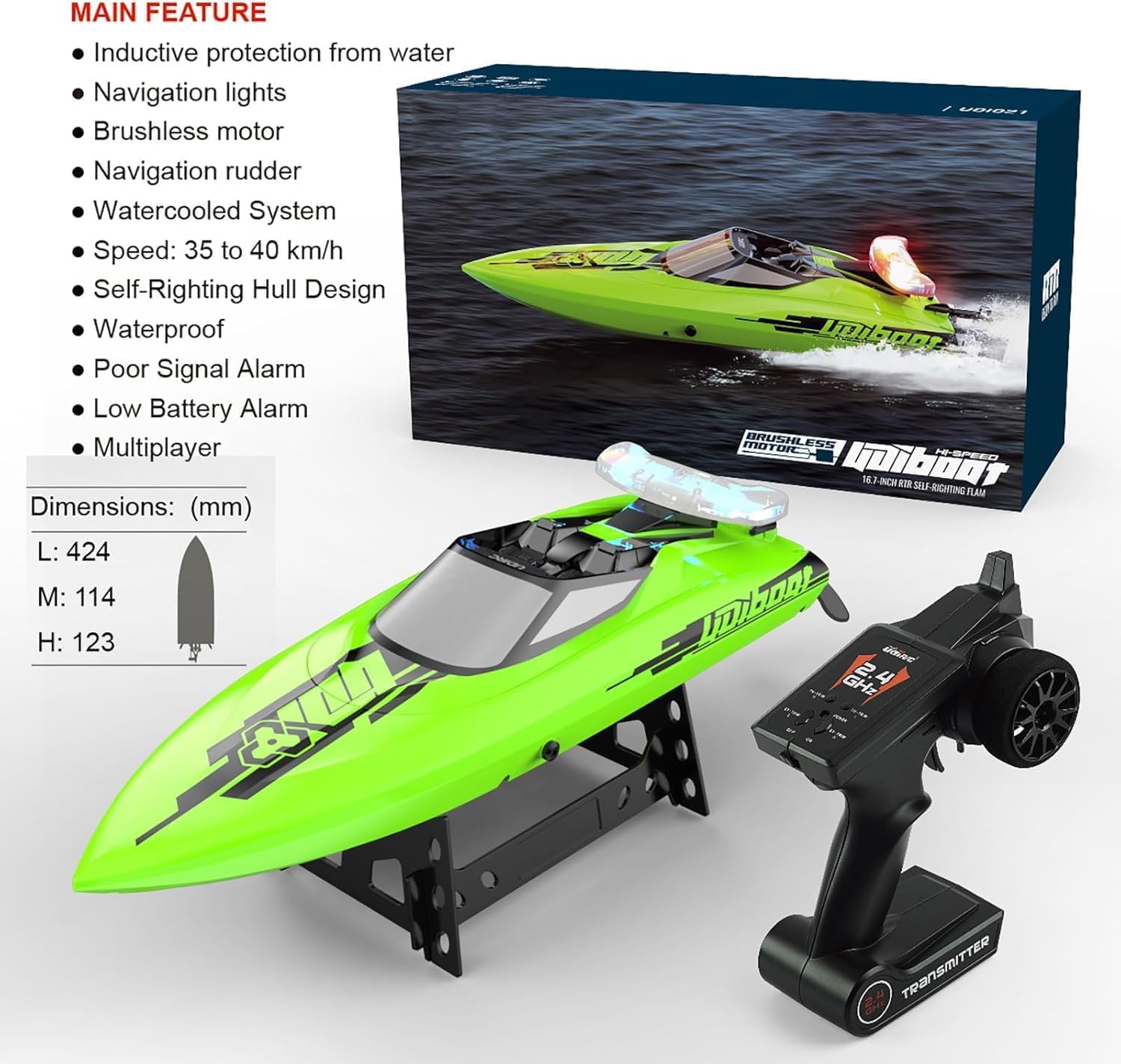 Velocità massima: 40 km/h. Tempo di gara: circa 5-8 minuti. Batteria marina 7.4V 2000mAh Motore brushless ad alta velocità. Luci di navigazione rimovibili. Funzione: controllo completo (avanti/indietro/sinistra/destra) e raffreddamento a circolazione dell'acqua del motore e rotazione automatica, mantenendo la parte anteriore rivolta verso il cielo e promemoria batteria scarica. Dimensioni: 46,7 x 14 x 13 cm