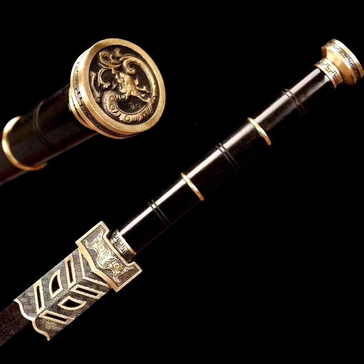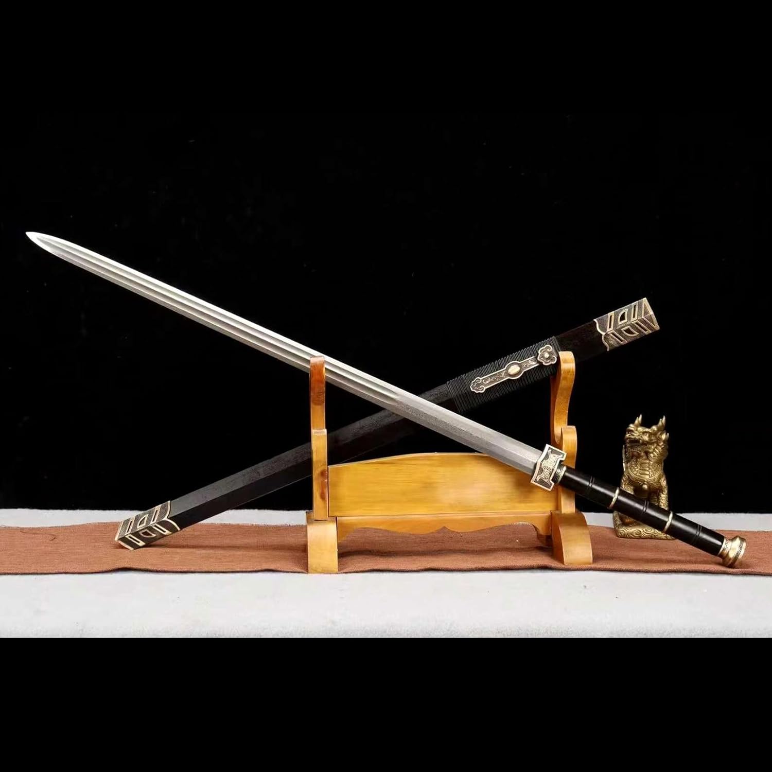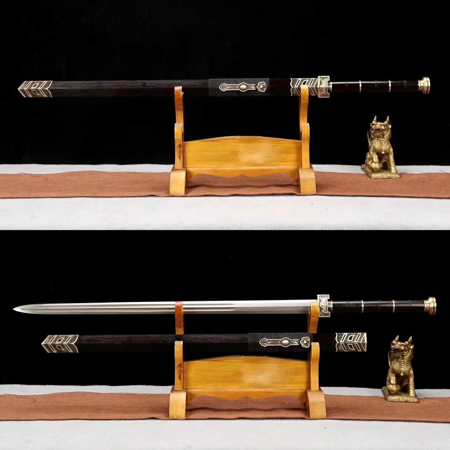 ❀【Produzione della lama】: il materiale della lama è realizzato in acciaio modellato di alta qualità, accuratamente forgiato e levigato a mano da artigiani. È realizzato utilizzando dozzine di metodi antichi come: punzonatura di embrioni, forgiatura a caldo, pala, limatura, molatura, trattamento termico, tempra, riparazione iniziale, riparazione fine, ecc. La durata della lama è garantita e può facilmente soddisfare varie esigenze di scherma. ❀【Materiali di alta qualità】: questa spada Han viene fornita con un fodero in legno nero naturale selezionato. Il legno è duro, ha una consistenza unica ed emana un fascino semplice ed elegante. Il fodero è liscio e delicato, il che non solo protegge efficacemente il corpo della spada, ma aumenta anche il comfort di raccolta e trasporto. ❀ 【Dimensioni bilanciate】: lunghezza totale 110 cm, lunghezza lama 75 cm, lunghezza impugnatura 28 cm, larghezza lama 3,7 cm, spessore lama 0,9 cm, peso circa 1,8 kg. Le proporzioni perfette e il peso moderato garantiscono l'imponenza e la flessibilità della spada. Questa spada è facile da trasportare e adatta al combattimento e all'addestramento reali. ❀【Impugnatura comoda】: l'impugnatura è realizzata in legno nero di alta qualità e presenta motivi antiscivolo, che non solo migliorano l'aspetto ma aumentano anche la stabilità dell'impugnatura. La texture unica impedisce efficacemente lo scivolamento delle mani, garantendo la precisione e la fluidità del combattimento con la spada. ❀【Cultura del patrimonio】: come modello di spada cinese, questa spada non solo incarna la squisita maestria delle armi antiche, ma porta anche ricche connotazioni storiche e culturali. Il suo design e la sua produzione seguono lo stile tradizionale cinese ed è un importante veicolo per trasmettere e promuovere la cultura cinese della spada.