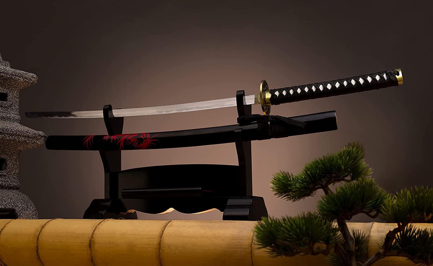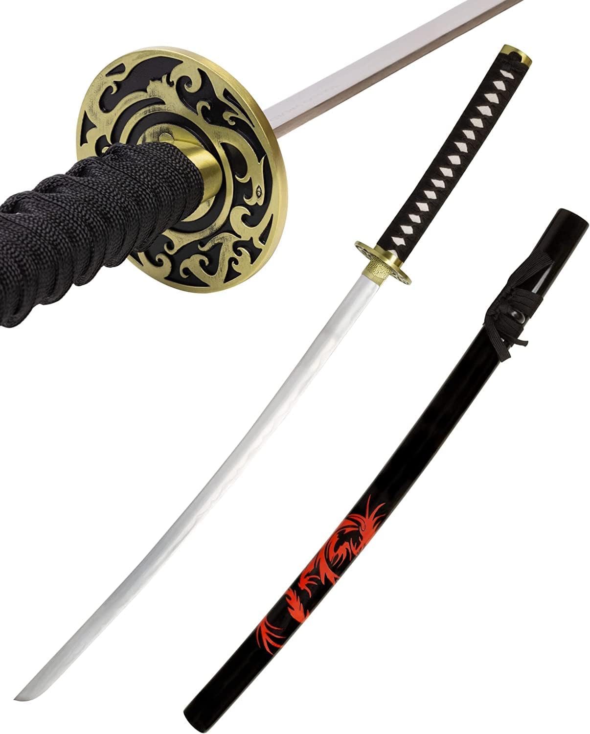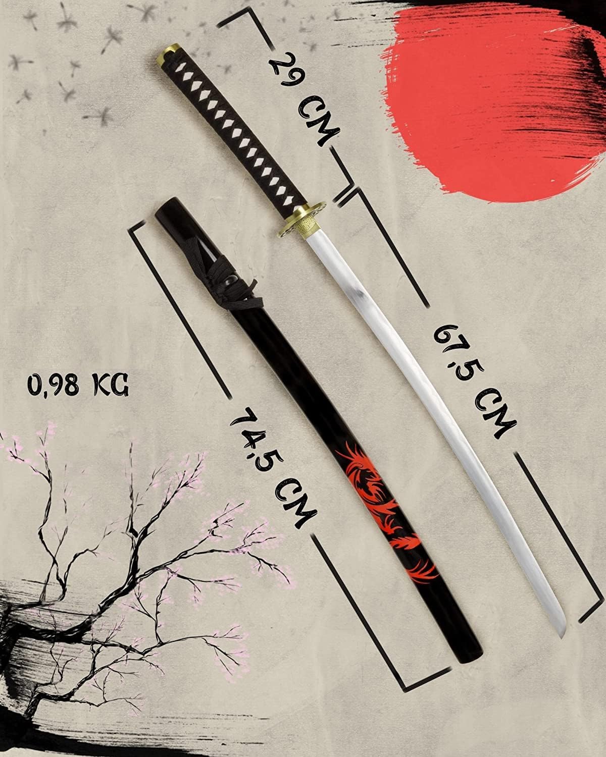 Lavorazione della spada lunga - L'impugnatura in metallo tsuka è riccamente incisa. C'è un anello fuchi sulla guardia trasversale dello tsuba che rinforza l'impugnatura. Nella parte superiore è presente un collare Habaki realizzato in una lega metallica chiamata Shakudo Safety and Protection - La replica non è adatta al combattimento o all'allenamento. La replica funge da elemento decorativo giapponese per montare o appendere il supporto a parete per katana. Perfetto per i collezionisti di armi decorative: il modello è una replica esatta dell'originale. La lama forgiata a mano è smussata e può essere conservata in modo sicuro. Il fodero è in legno duro con motivo di drago. Ottimo regalo: il modello decorativo giapponese è un ottimo regalo per papà, nonno, zio o per te stesso. Può diventare una decorazione interessante che aggiungerà carattere storico a qualsiasi interno Parametri - Lunghezza lama: 67,5 cm. Larghezza lama: 2,5 cm. La lunghezza della guaina: 74,5 cm. Lunghezza manico: 29 cm