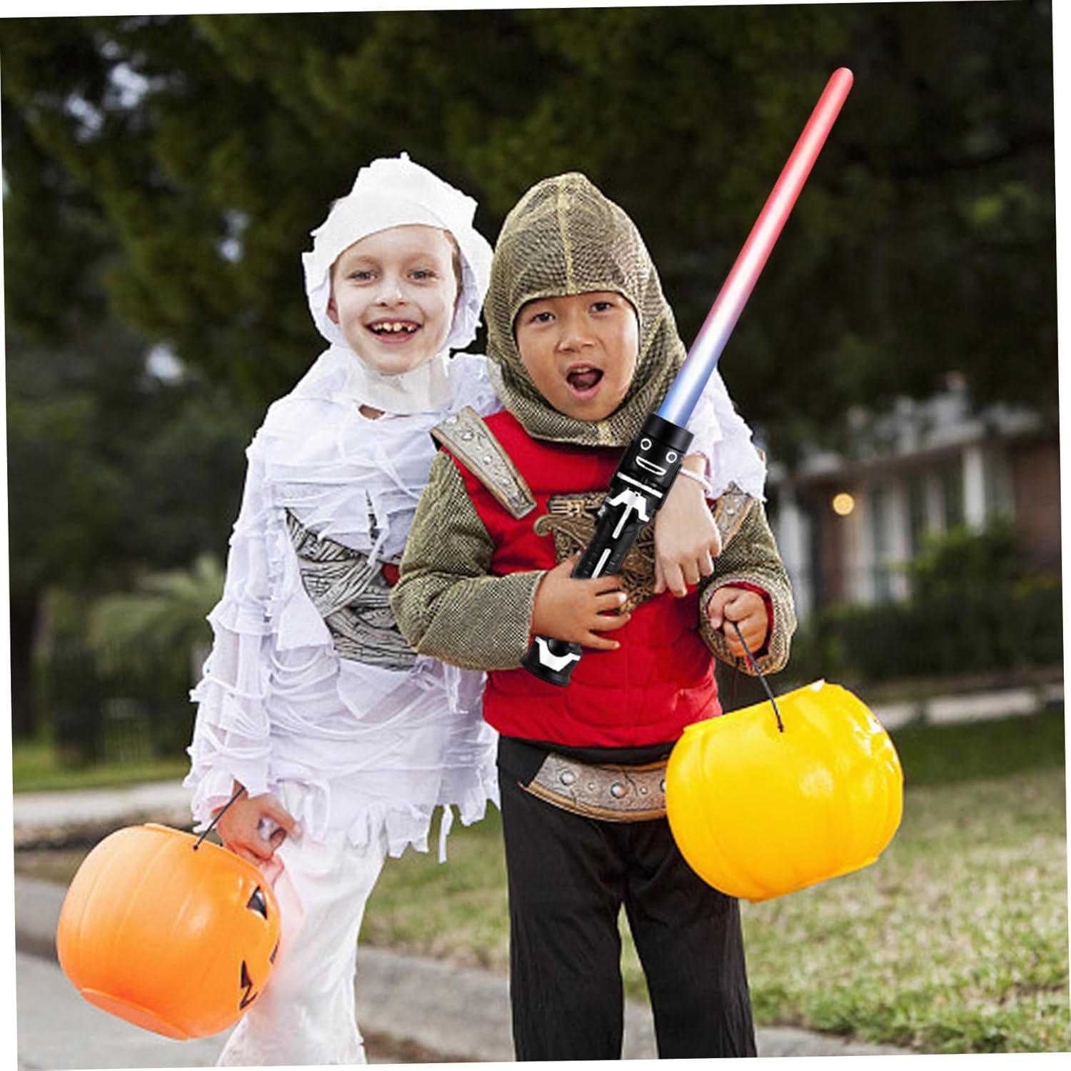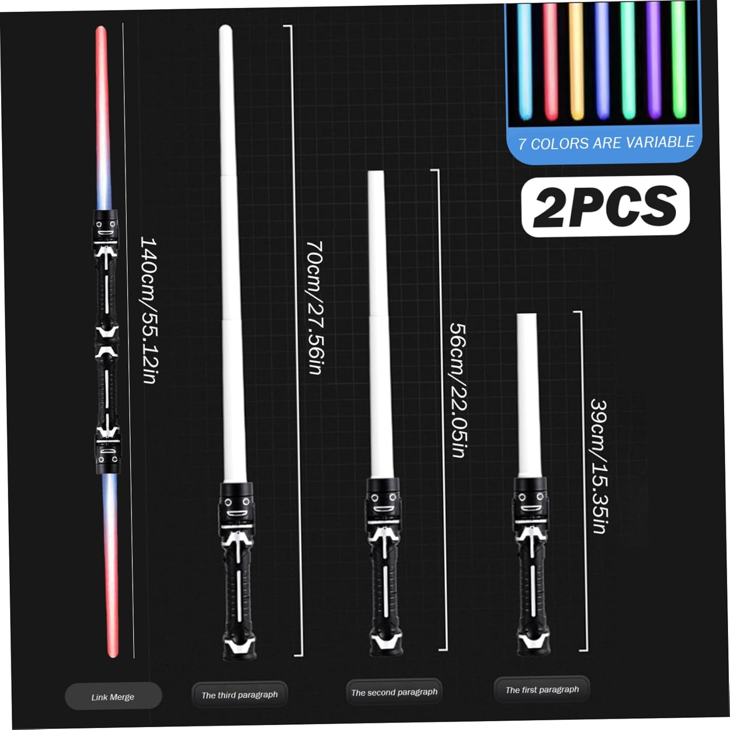 Divertimento versatile: ideali per feste in costume di Halloween, regali di Natale ed eventi a tema, queste spade laser sono ottimi regali per bambini e adulti. La loro versatilità garantisce che possano essere gustati tutto l'anno, scatenando creatività e divertimento. Effetti di luce vibranti: dotate di luci LED colorate, queste brillanti spade laser illuminano le tue battaglie con colori vivaci. Le luci brillanti aggiungono un'altra dimensione alle tue avventure, rendendo ogni momento di gioco cinematografico. Qualità: realizzate con materiali di qualità, queste spade laser estensibili sono costruite per resistere a giochi rigorosi. La loro struttura robusta e il manico liscio e arrotondato assicurano che possano gestire anche le sessioni di duello più intense pur garantendo divertimento. Suoni realistici: ogni spada laser è integrata con effetti sonori autentici, migliorando la tua esperienza di duello. I suoni coinvolgenti danno vita alle tue battaglie, facendoti sentire parte di una saga intergalattica! Design dinamico: questo set di 2 spade laser presenta un design estensibile a doppia lama, che consente duelli emozionanti ed emozioni. Perfette per ogni aspirante Jedi o Guerriero Galattico, queste spade laser migliorano il gioco fantasioso e creano momenti indimenticabili.